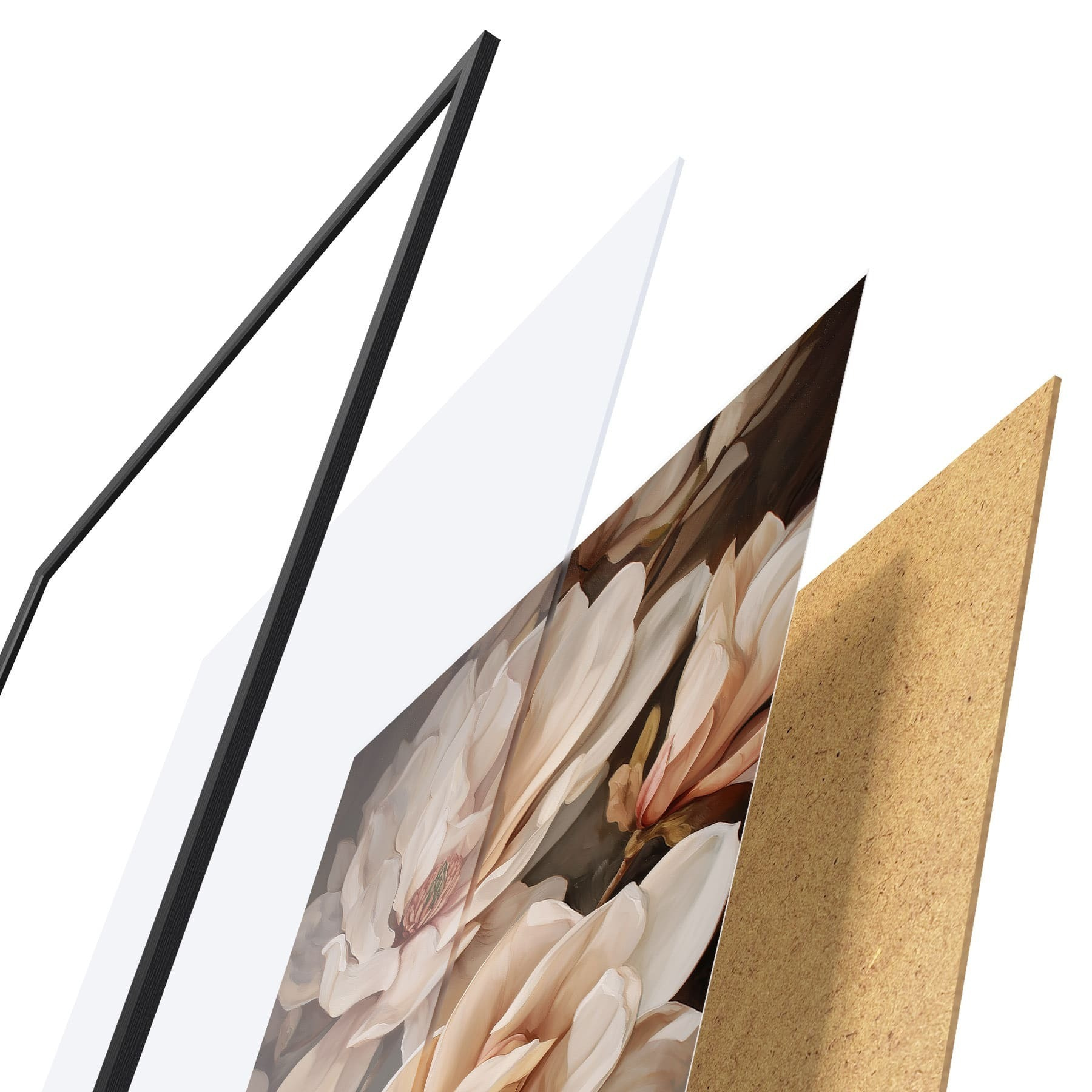 De poster bestaat uit een frame, plexiglas, geprinte afbeelding en spaanplaat achterkant. De poster kan meteen aan de muur worden gehangen dankzij de bevestigingen op de achterkant.