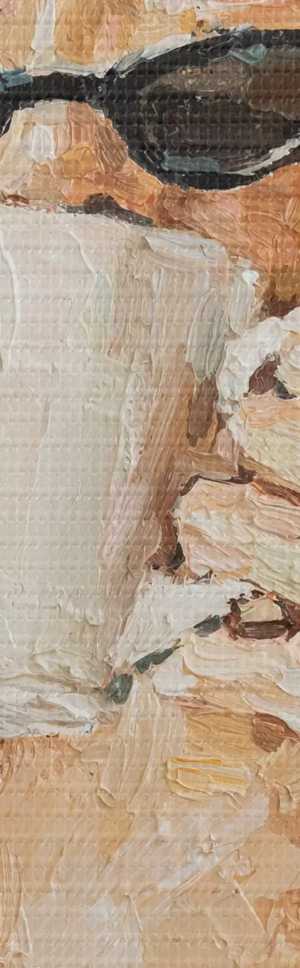 Het schilderij kan voorzichtig worden schoongeveegd met een droge zachte doek of spons; het wordt niet aanbevolen om natte producten te gebruiken. Het gebruik van een vochtige spons is alleen toegestaan als het schilderij gevernist is.
