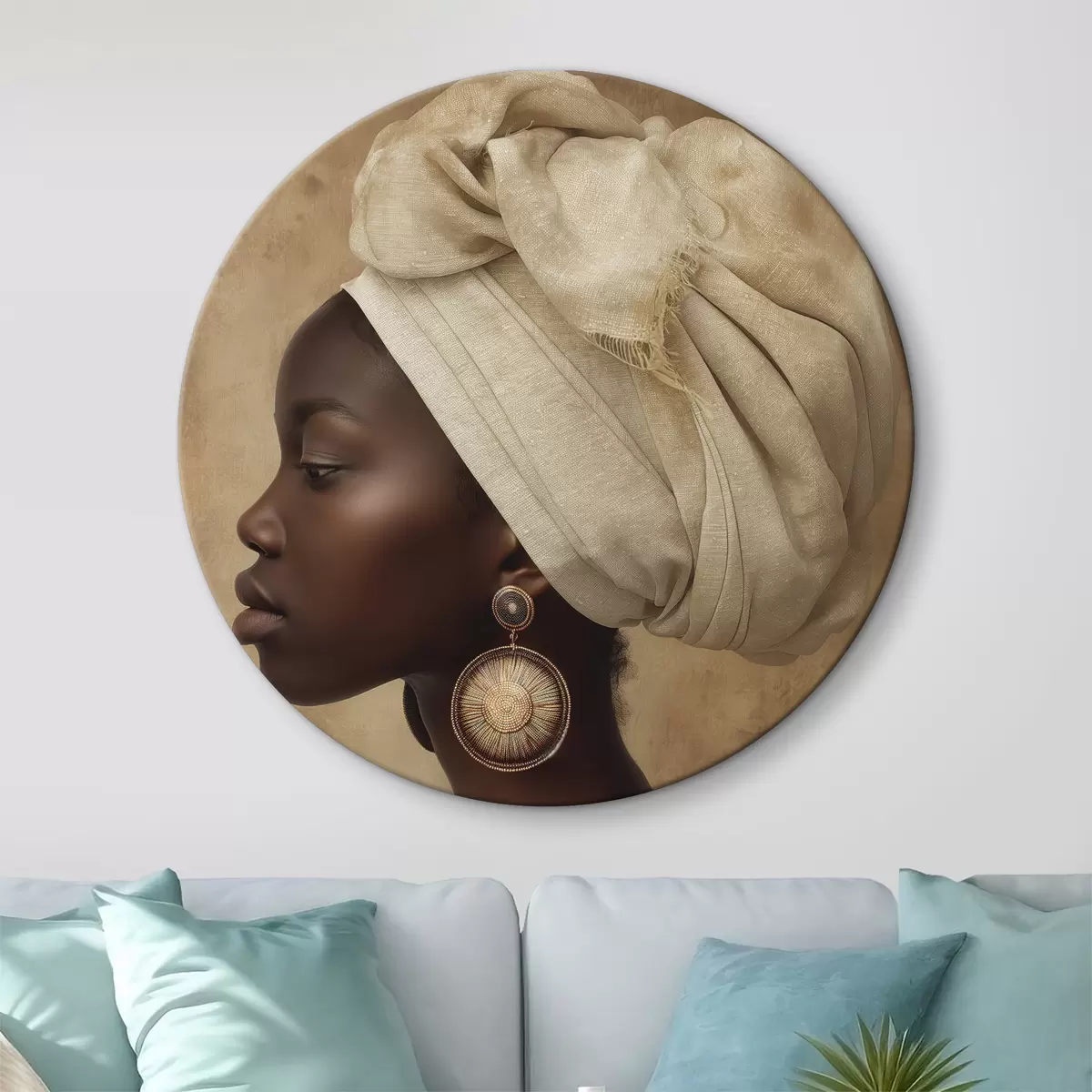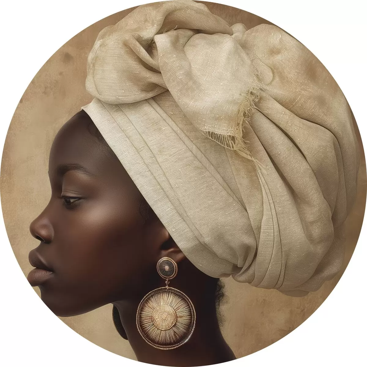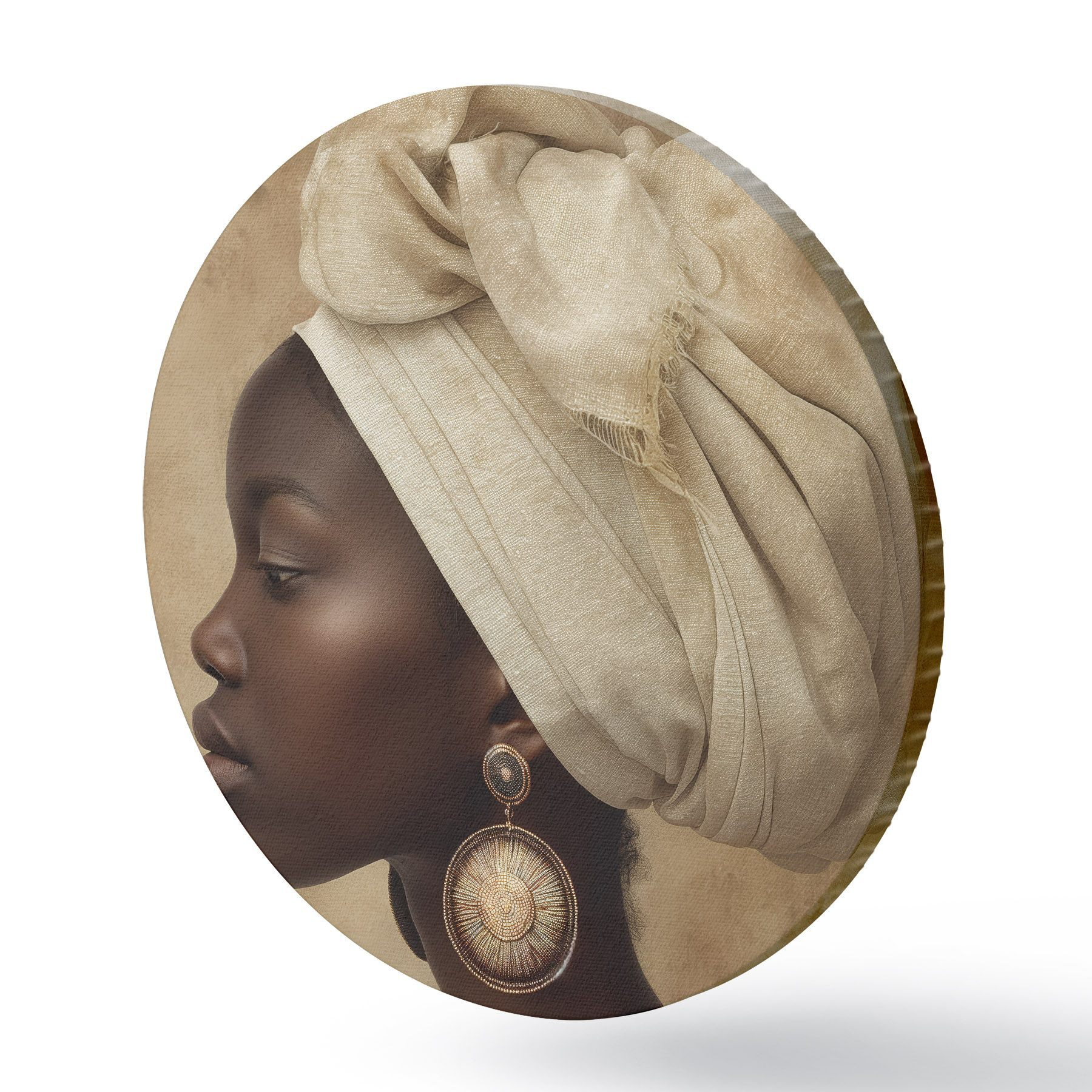 Ronde schilderijen beige portret van een vrouw in Afrikaanse stijl in profiel met grote oorbellen r26120