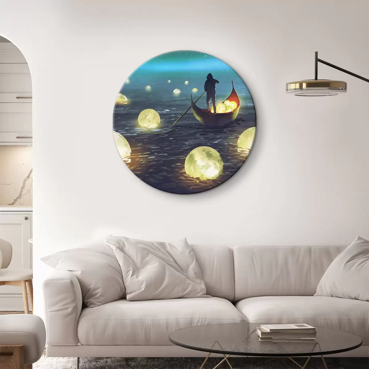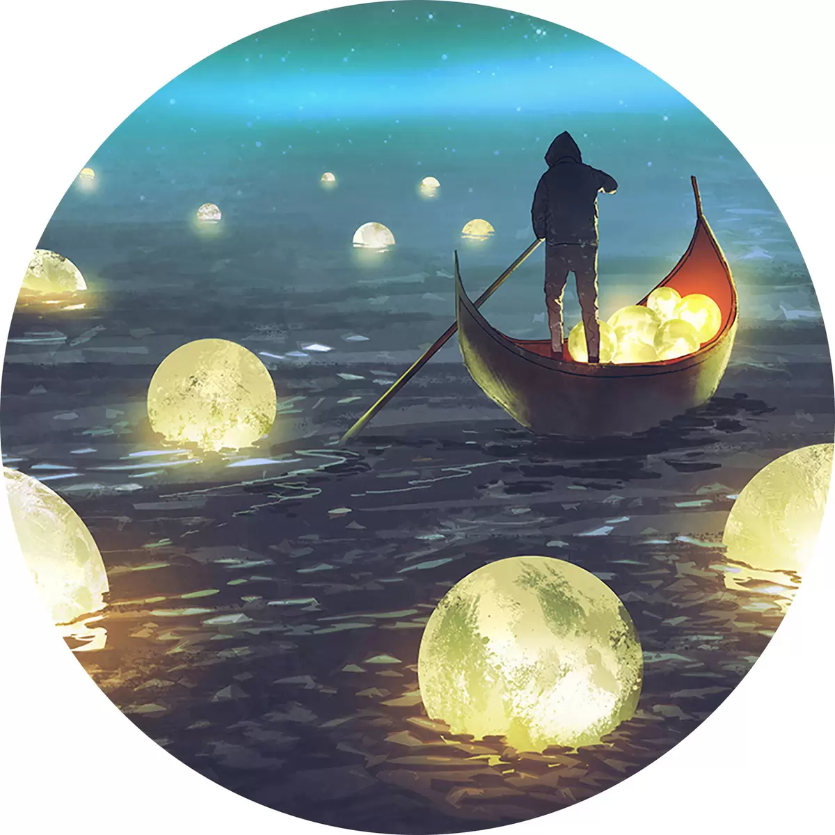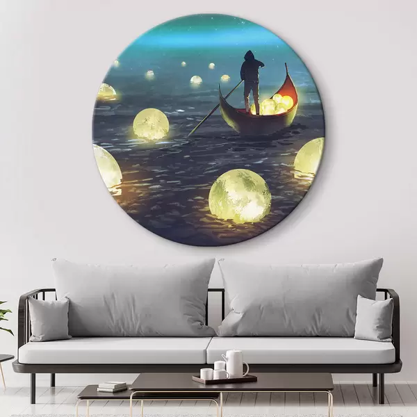 Ronde schilderijen Een man in een boot tegen de achtergrond van de schijnende maan r34544