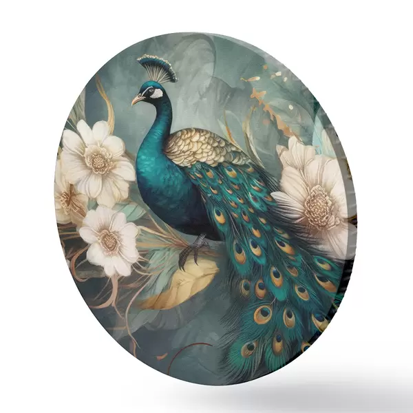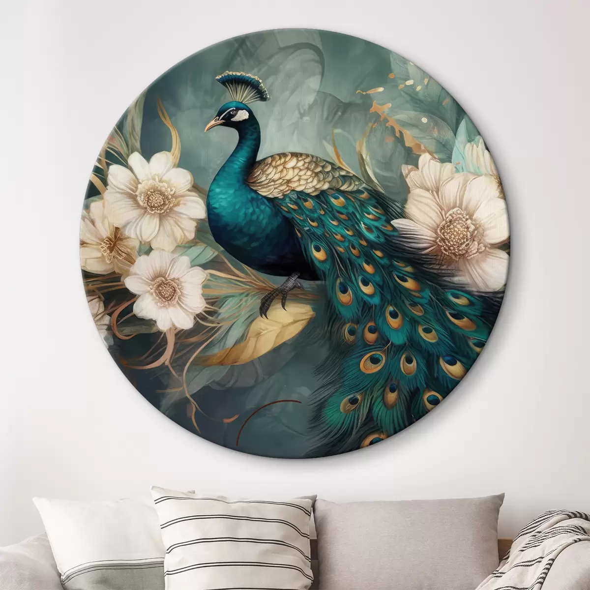 Ronde schilderijen Een prachtige pauw op een bloeiende tak r34866
