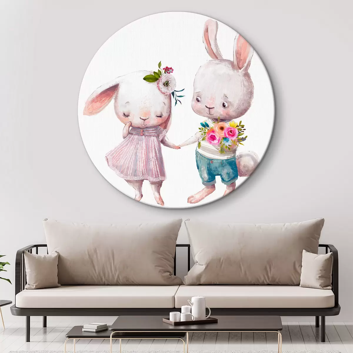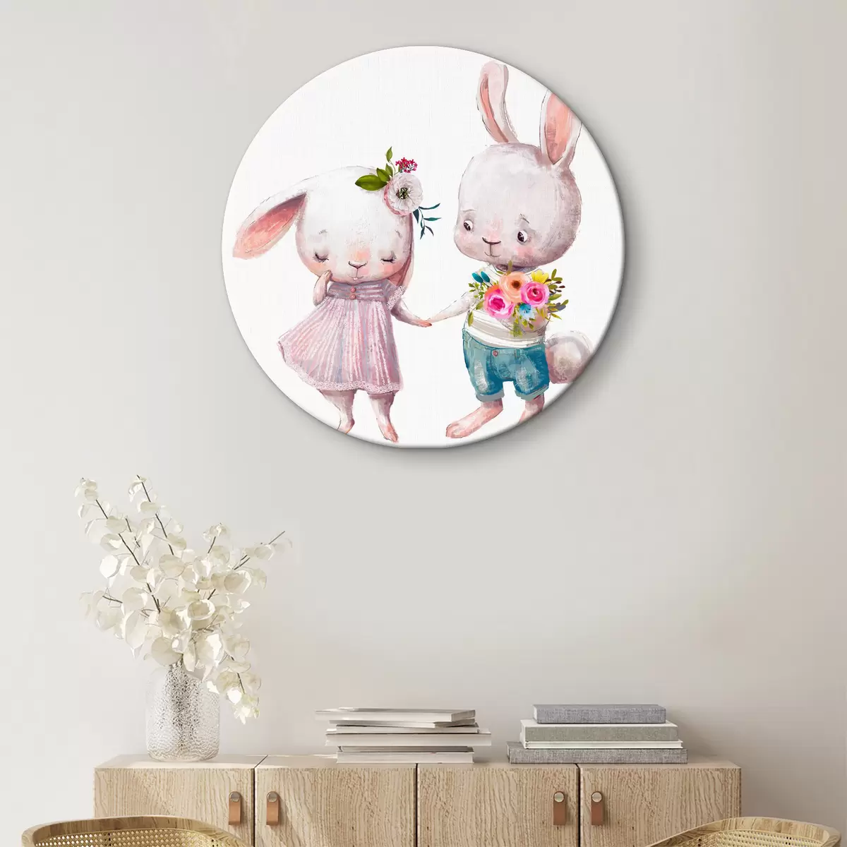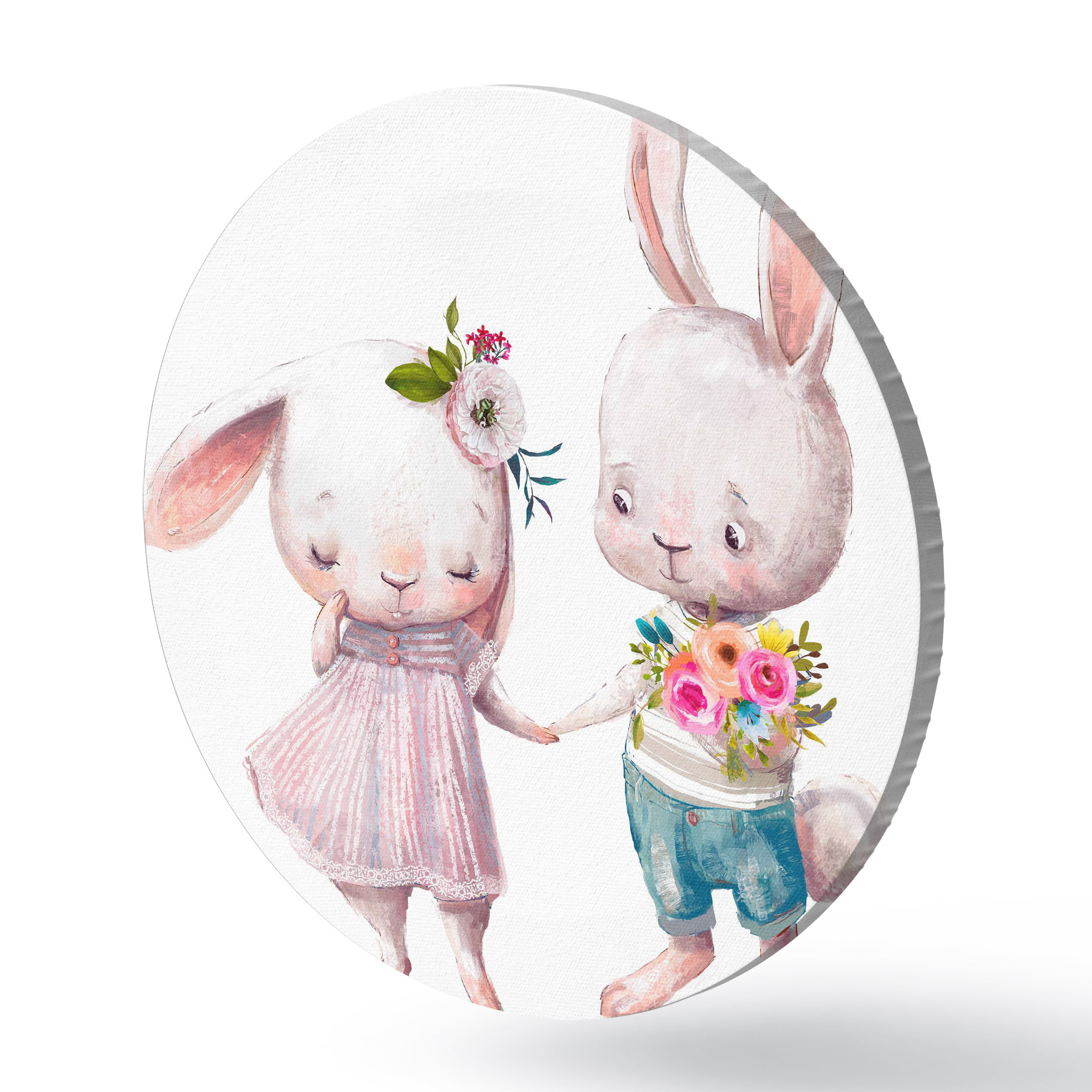 Ronde schilderijen Een paar Date konijntjes en bloemen r35055