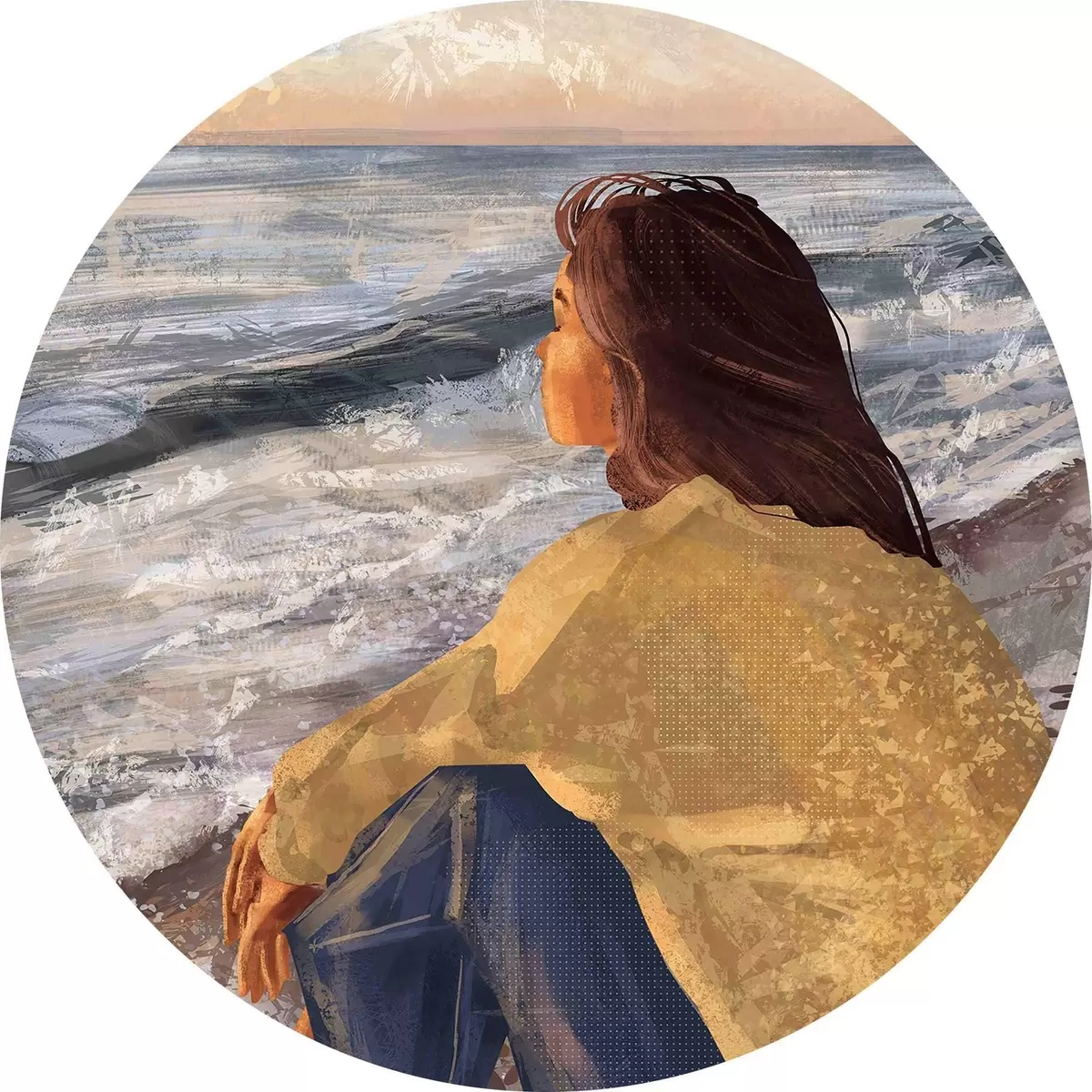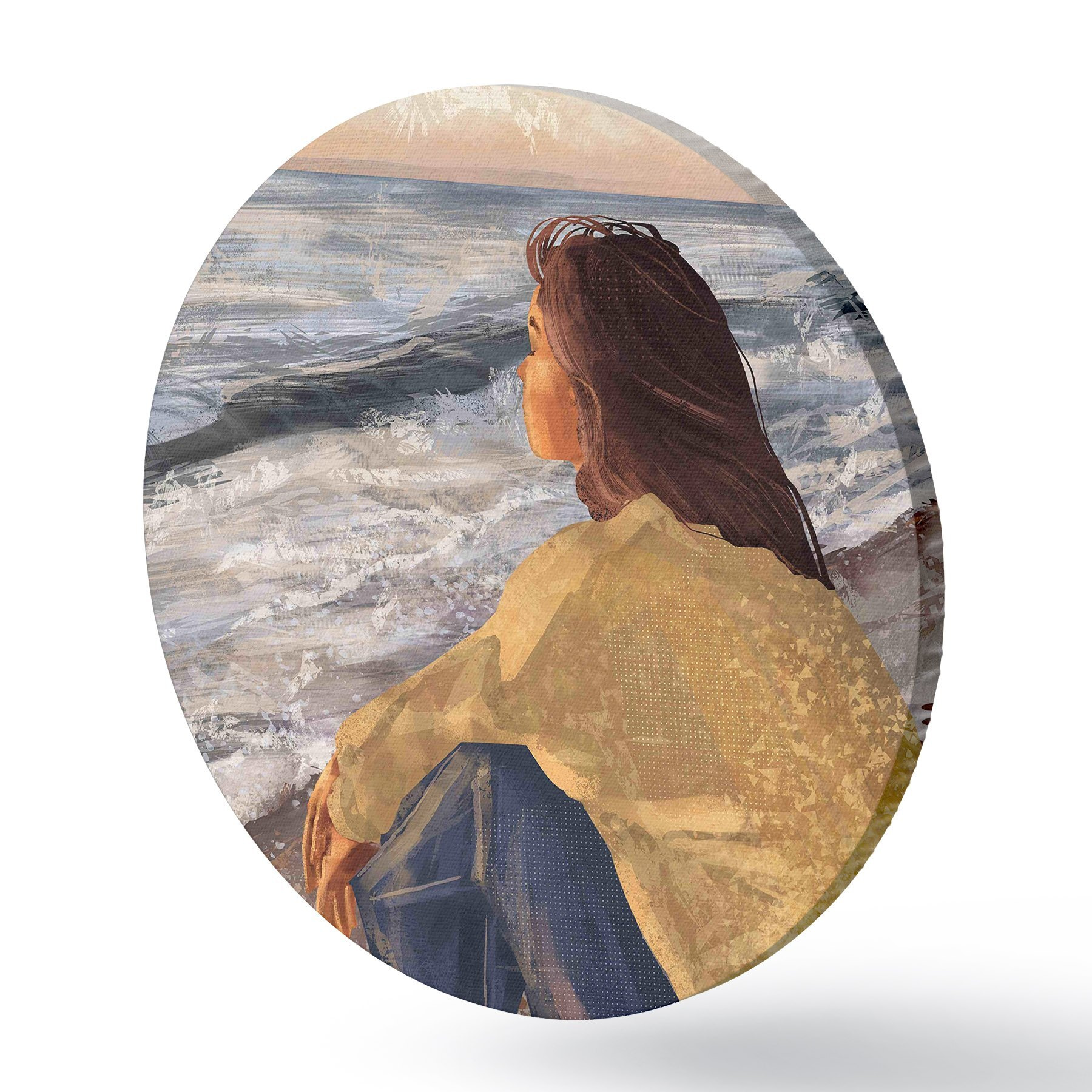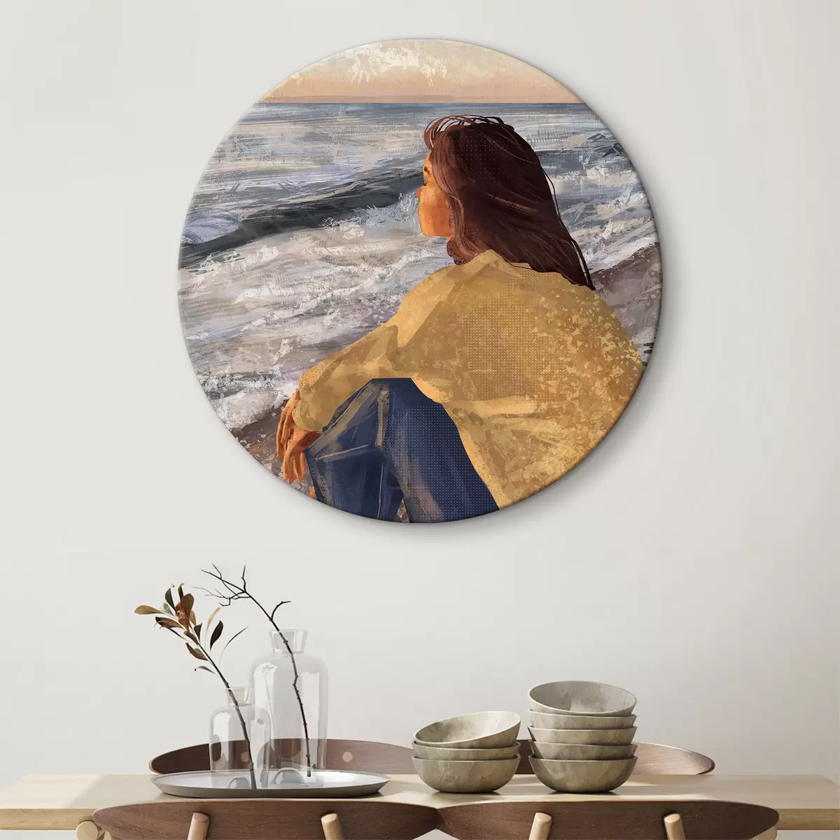 Ronde schilderijen Vrouw aan zee, kijkend naar de golven r35317