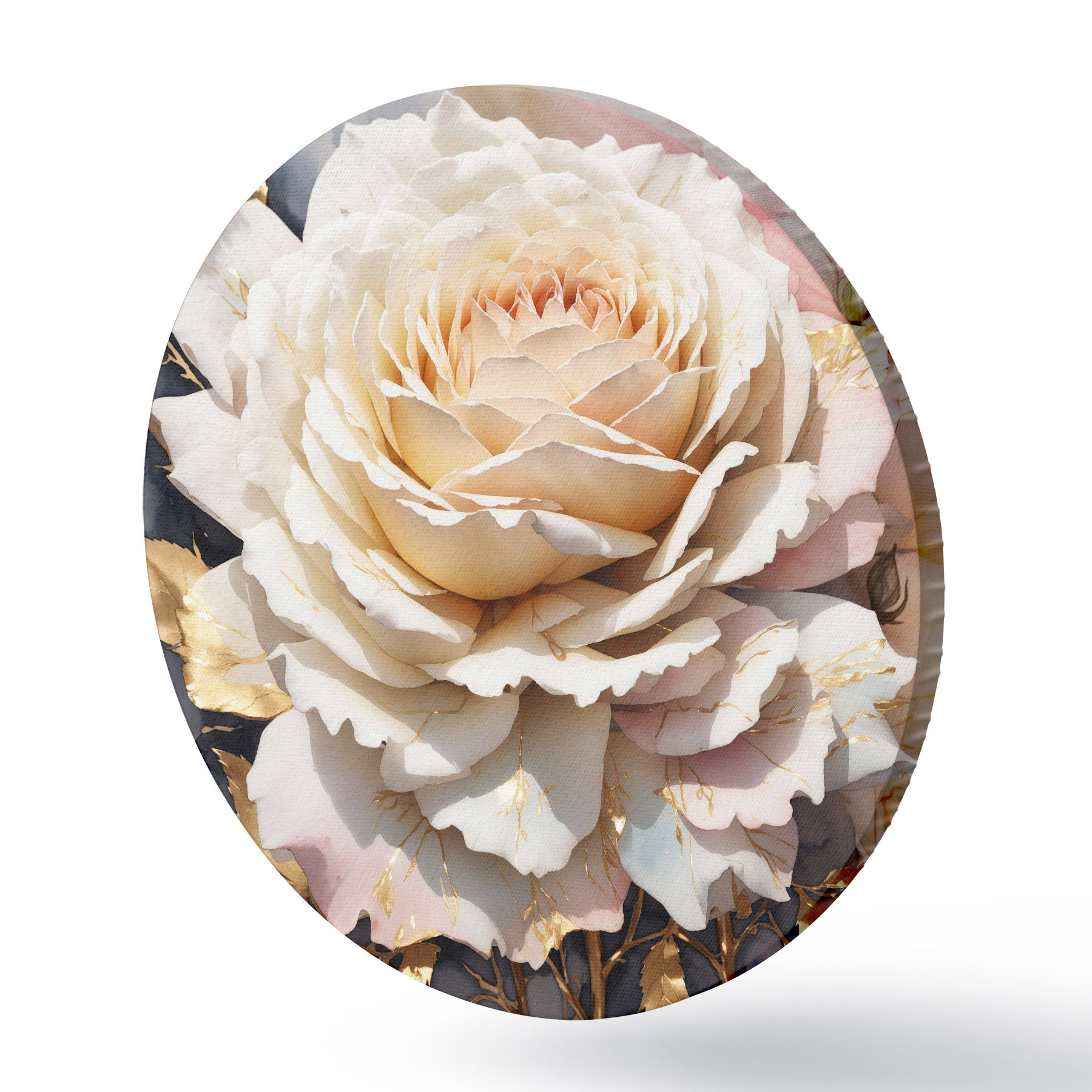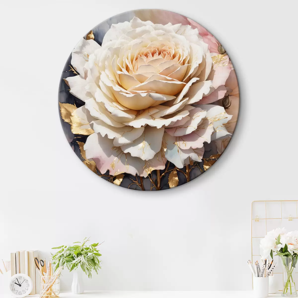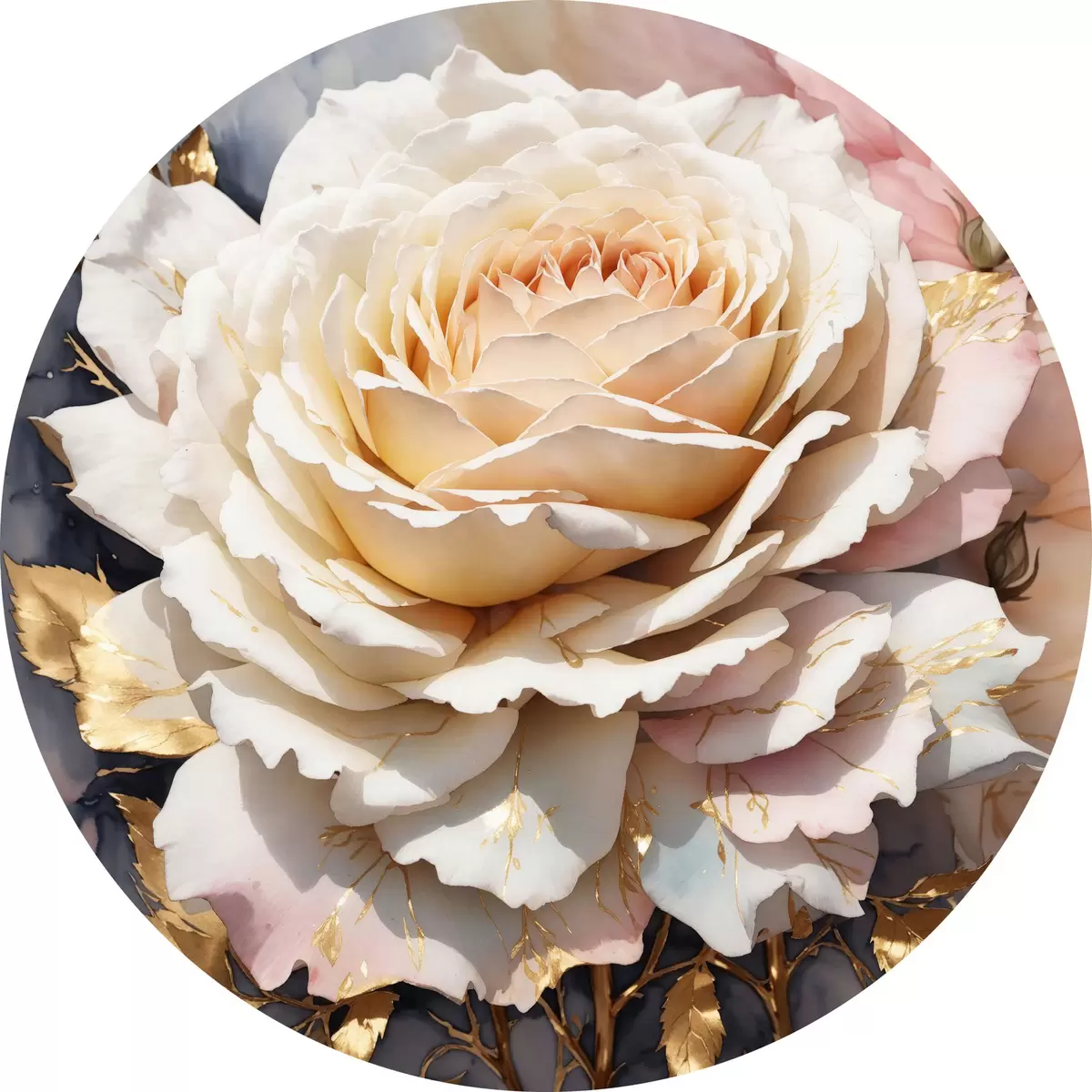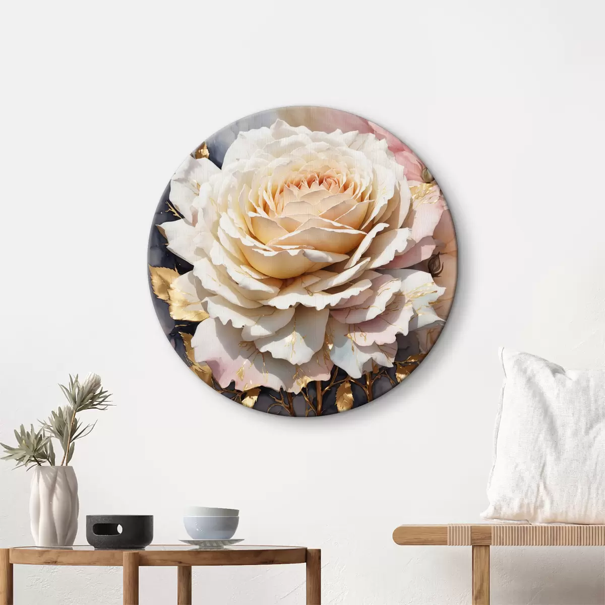 Ronde schilderijen Witte roos in aquarel met bladeren r35662