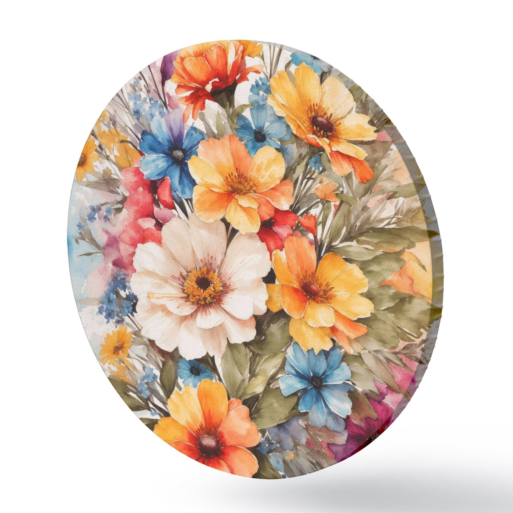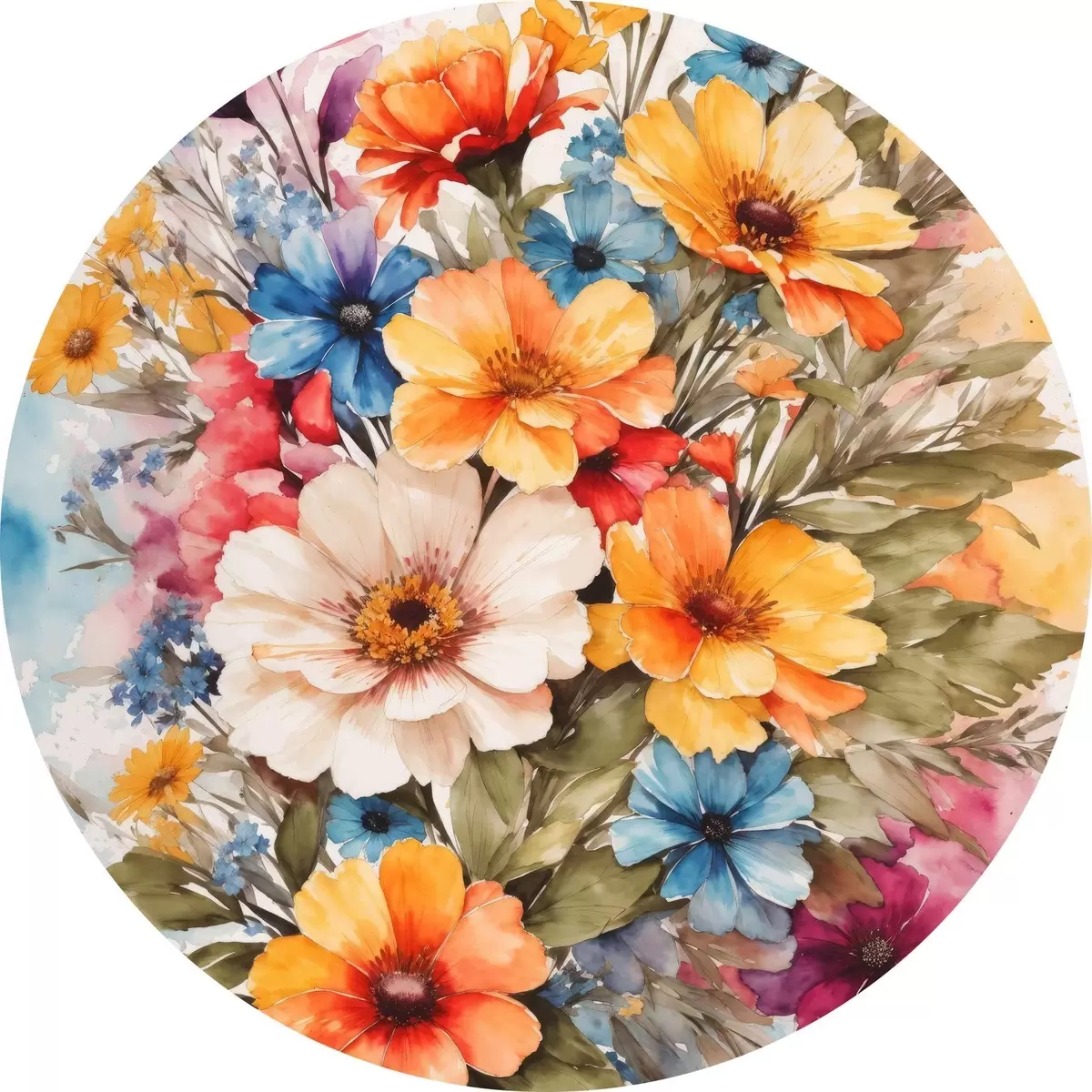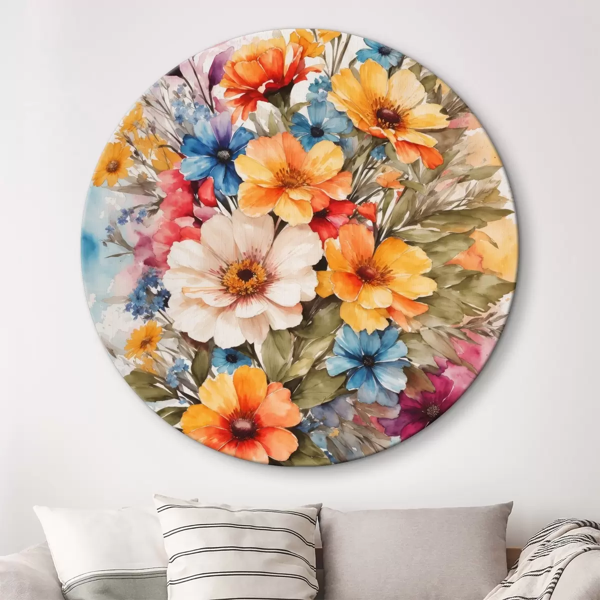 Ronde schilderijen Aquarelboeket van roze, gele, blauwe en rode bloemen r36121