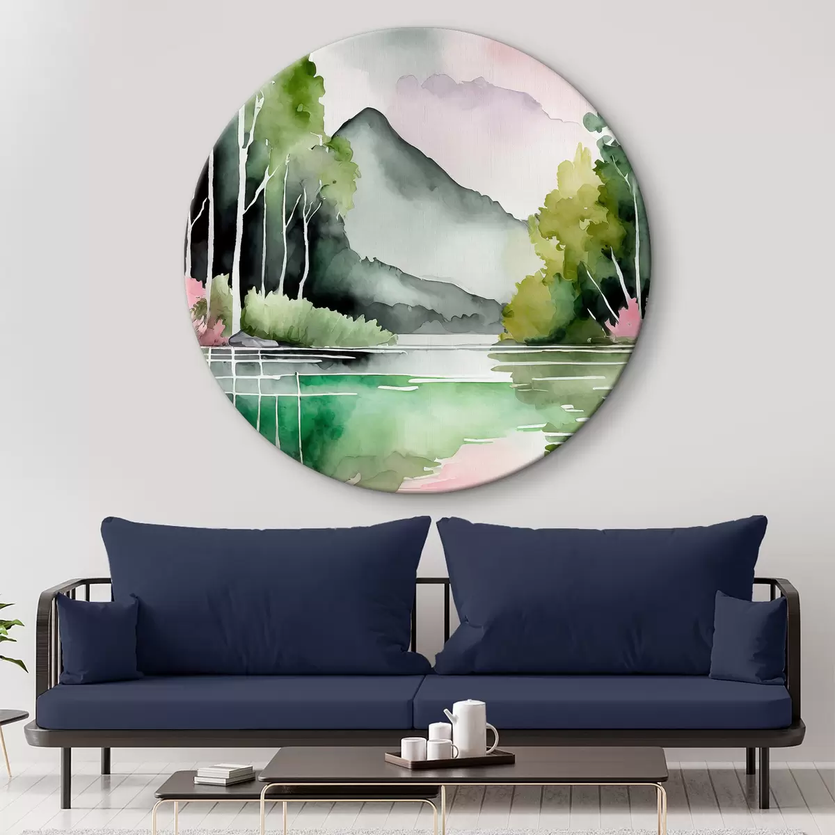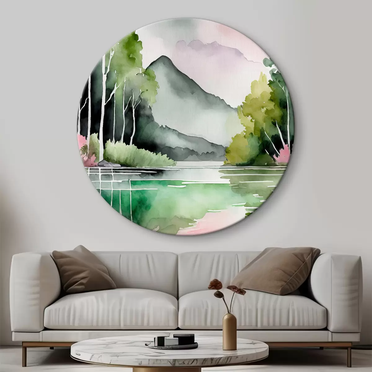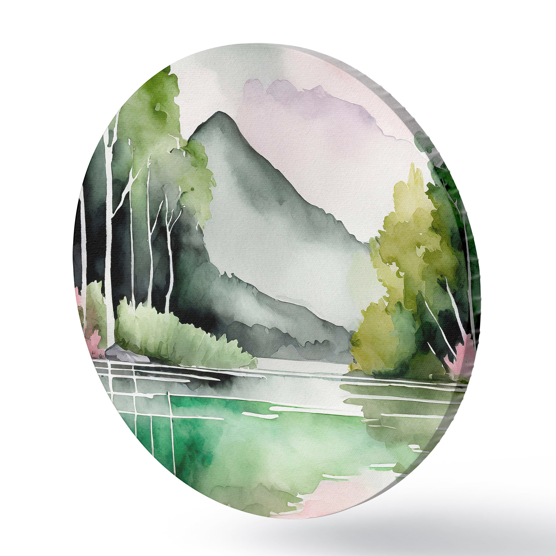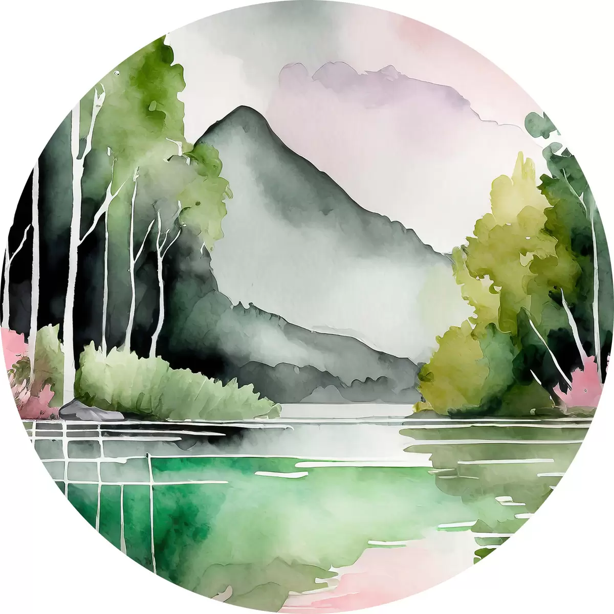 Ronde schilderijen Aquarel natuurlandschap, meer en bos, zacht groen, roze en grijze kleuren r36507