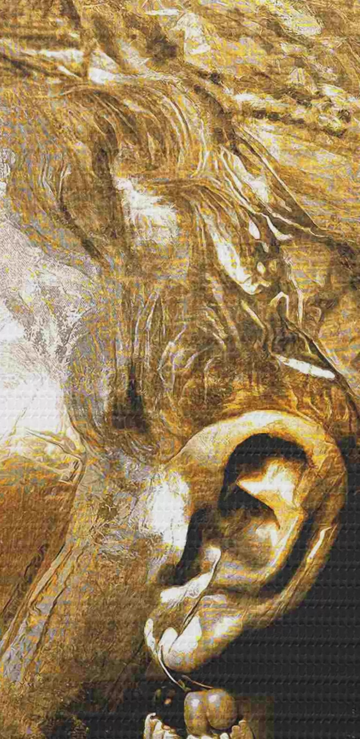 Het schilderij kan voorzichtig worden schoongeveegd met een droge zachte doek of spons; het wordt niet aanbevolen om natte producten te gebruiken. Het gebruik van een vochtige spons is alleen toegestaan als het schilderij gevernist is.