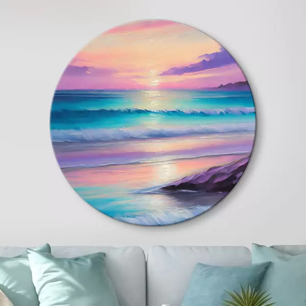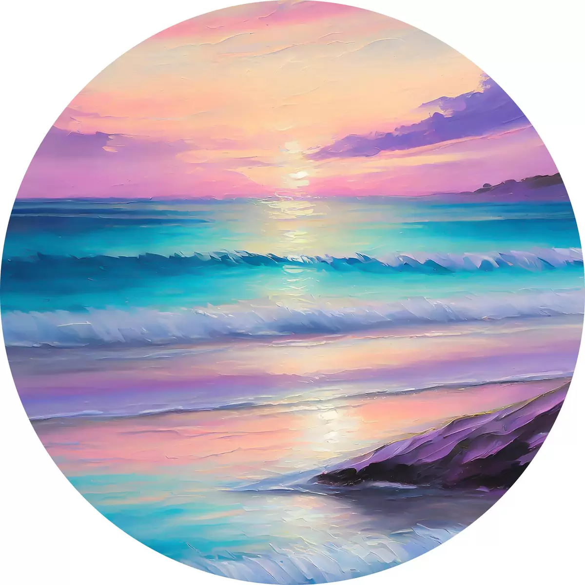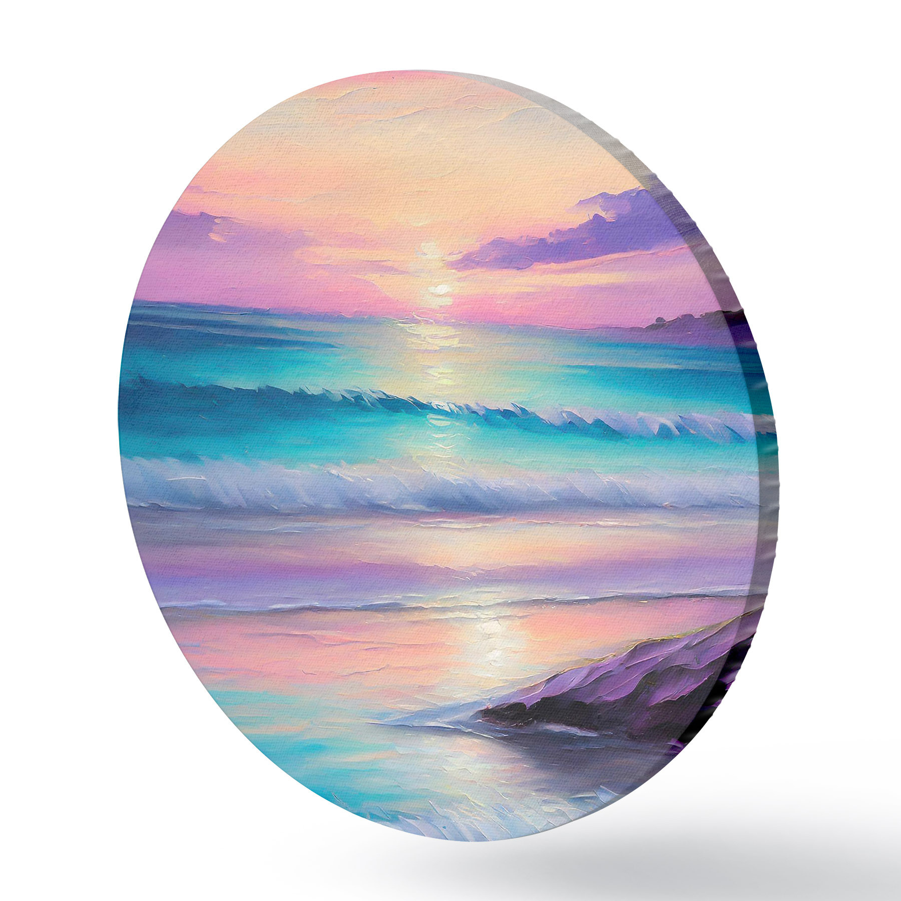 Ronde schilderijen Zachte paarse zonsondergang aan de zeekust, acryl tekening, gezellige strandsfeer r36590