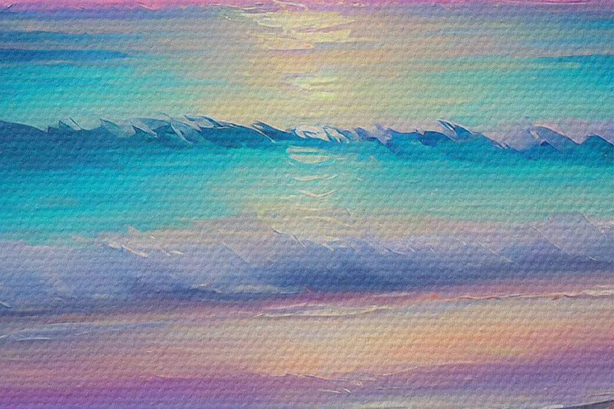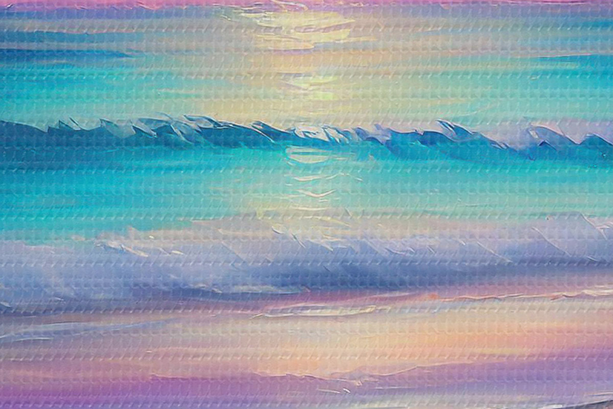 Afbeelding Zachte paarse zonsondergang aan de zeekust, acryl tekening, gezellige strandsfeer Nr r36590