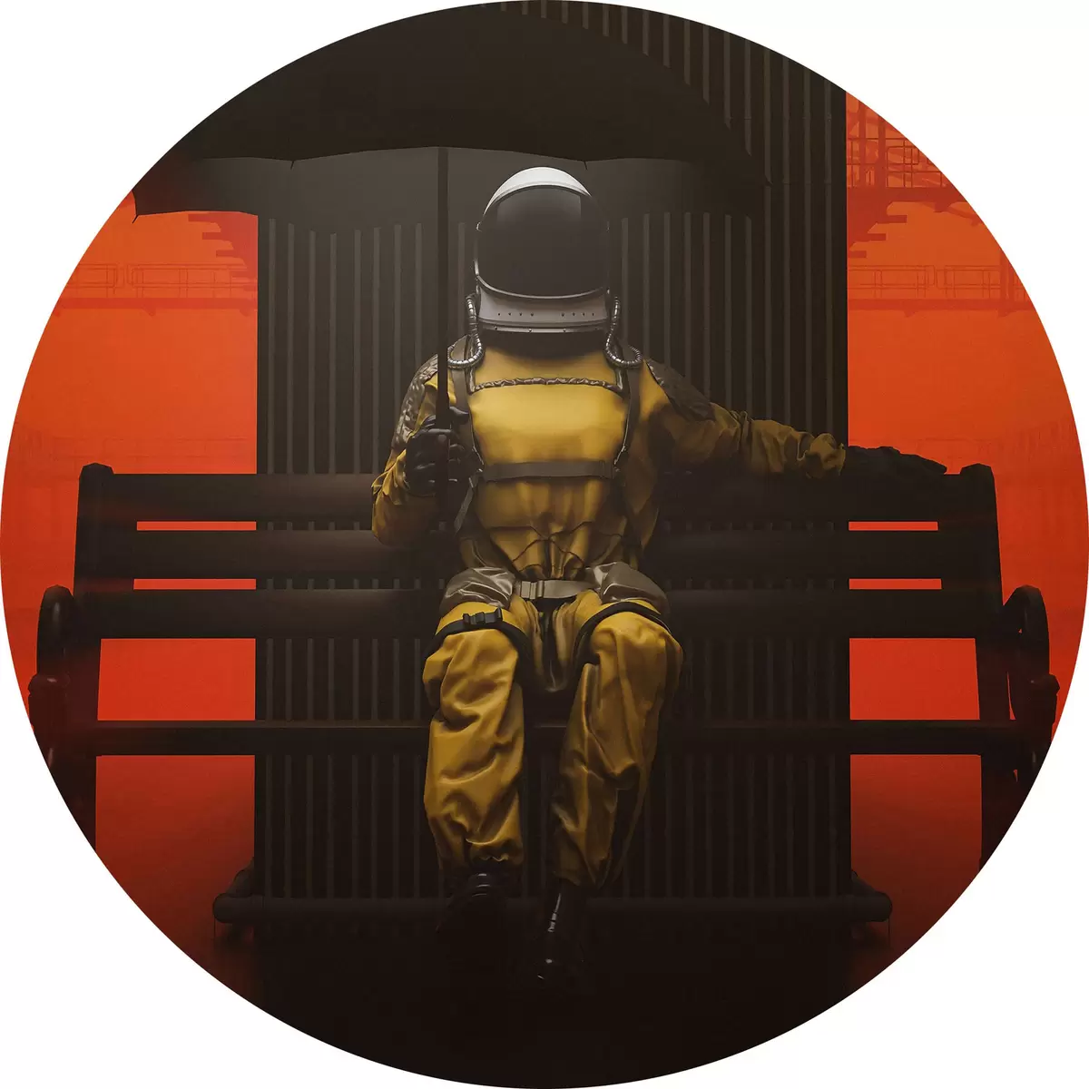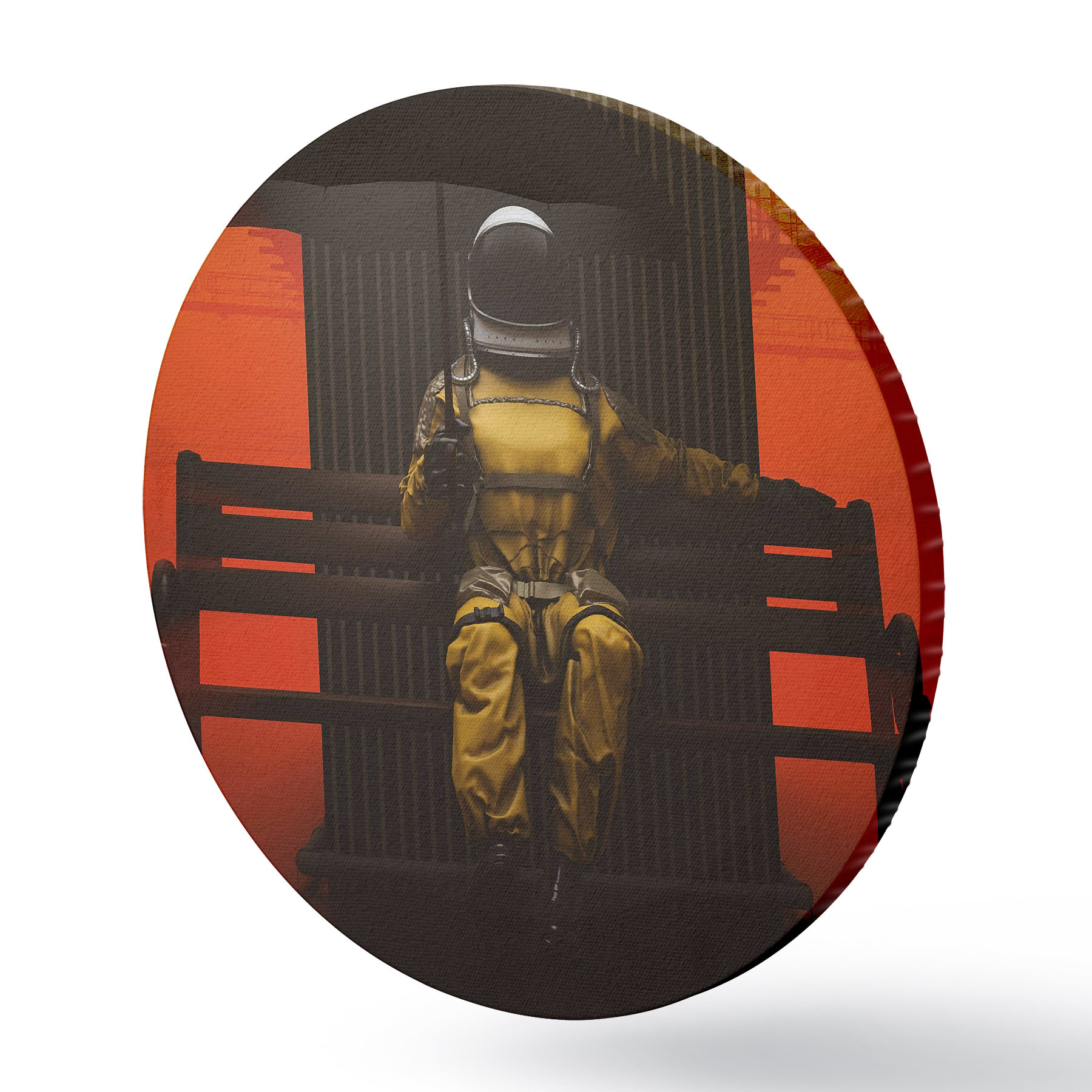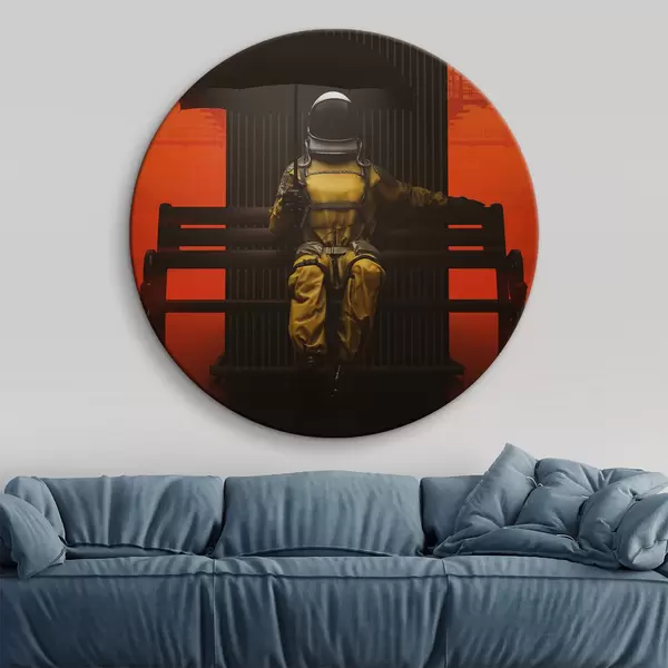 Ronde schilderijen Een persoon in een pak zittend op een bankje met een paraplu r36702