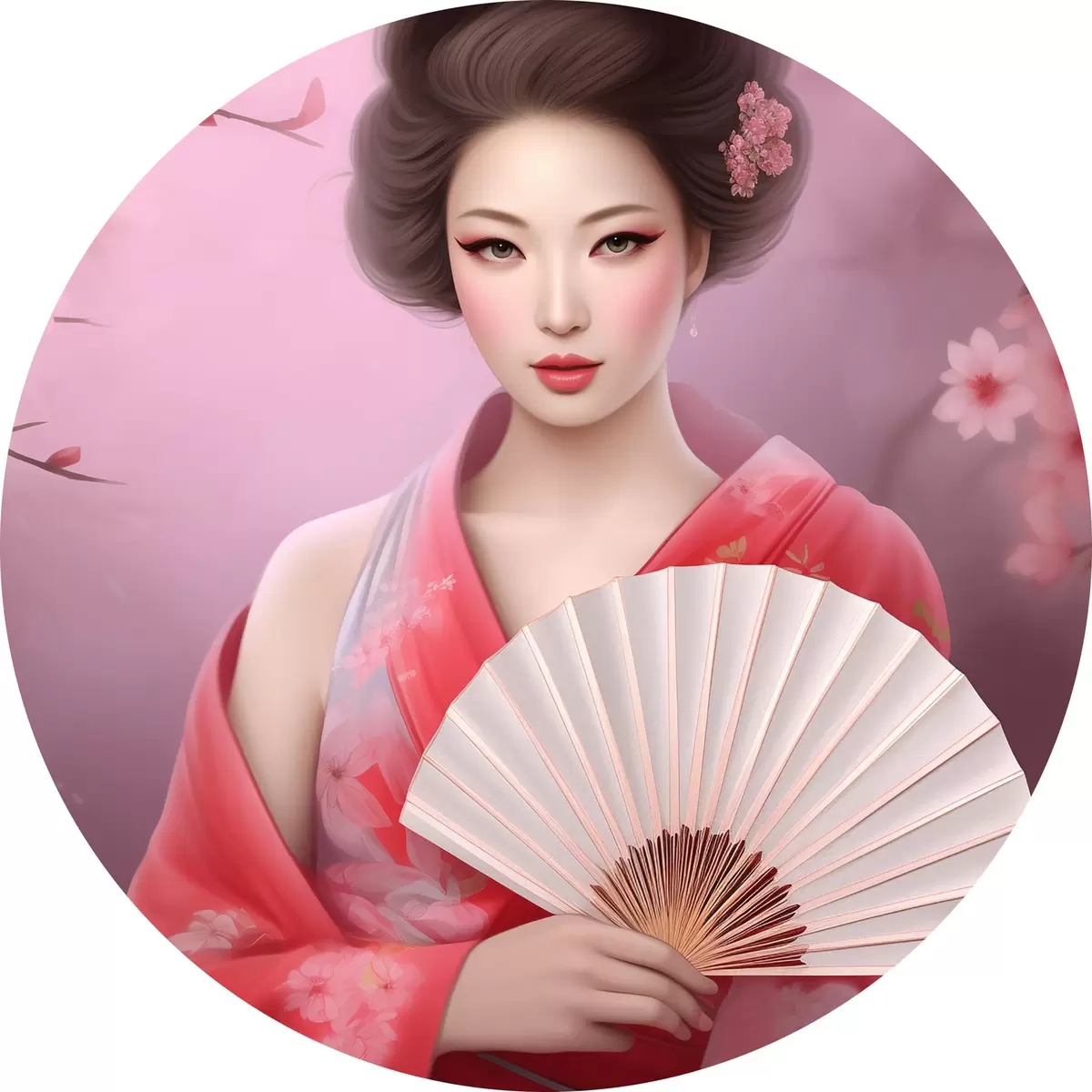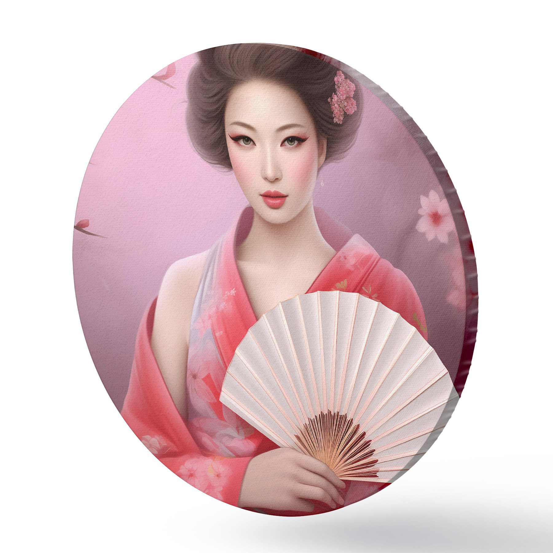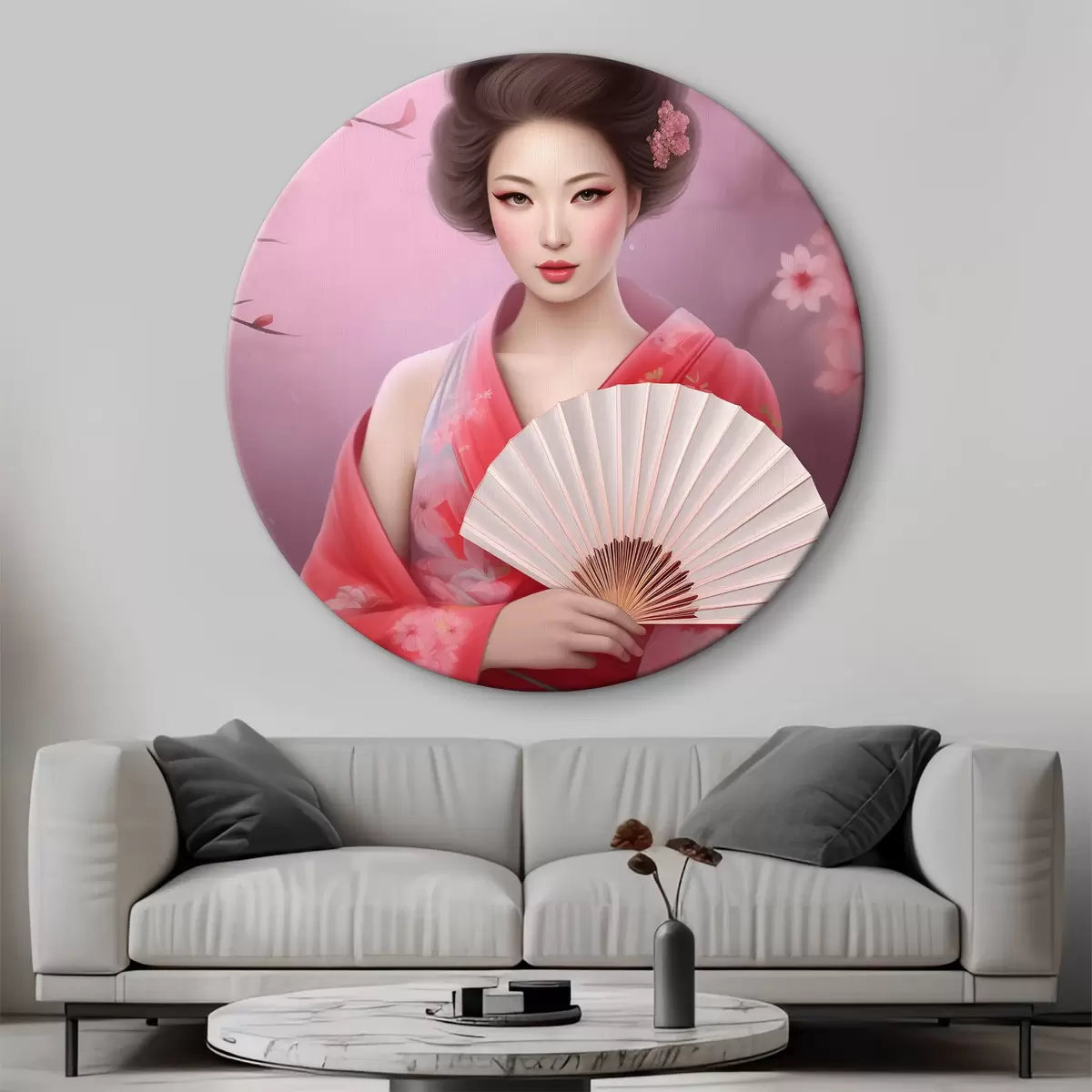 Ronde schilderijen Een vrouw in een kimono die een waaier vasthoudt r36804