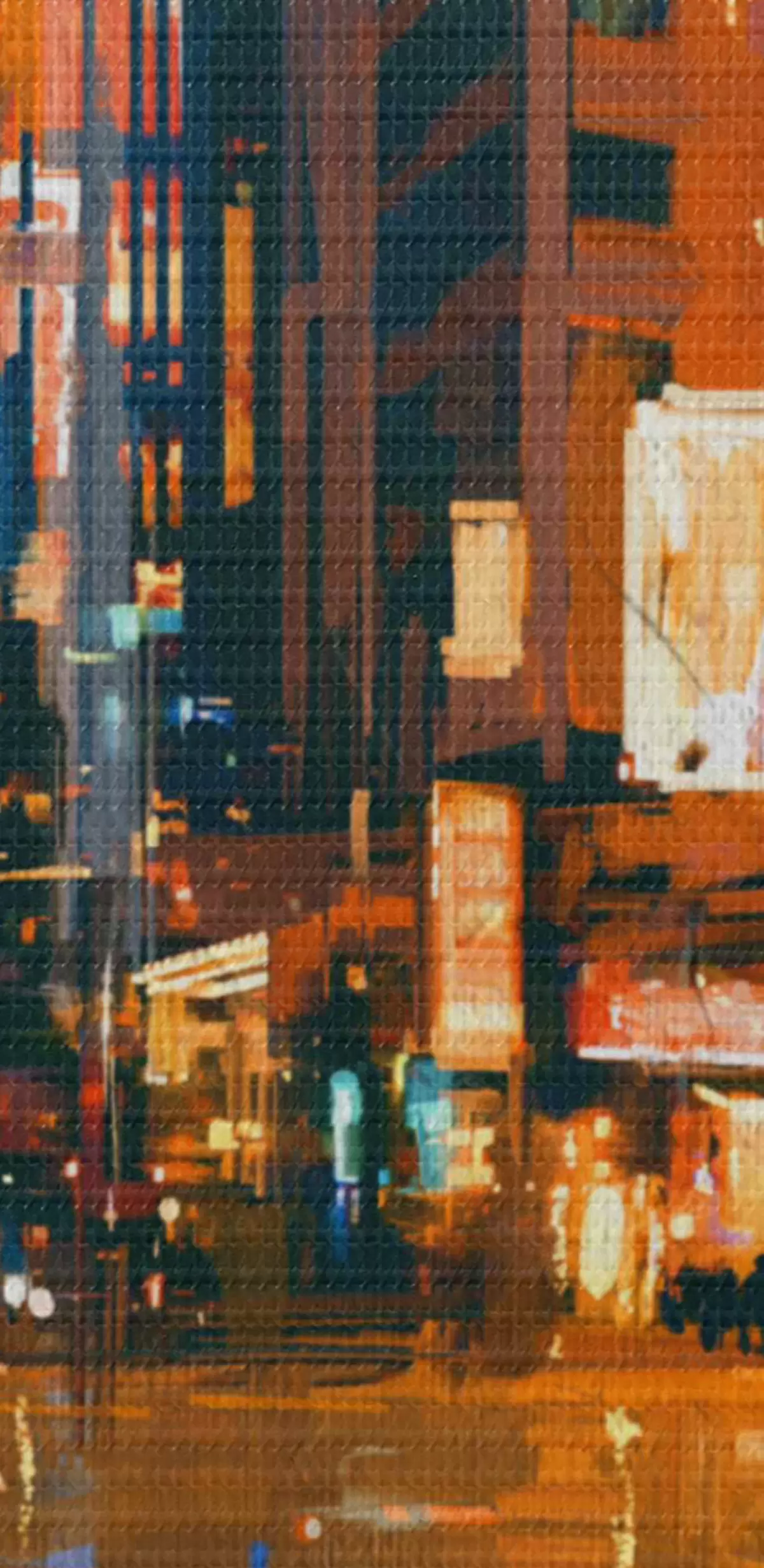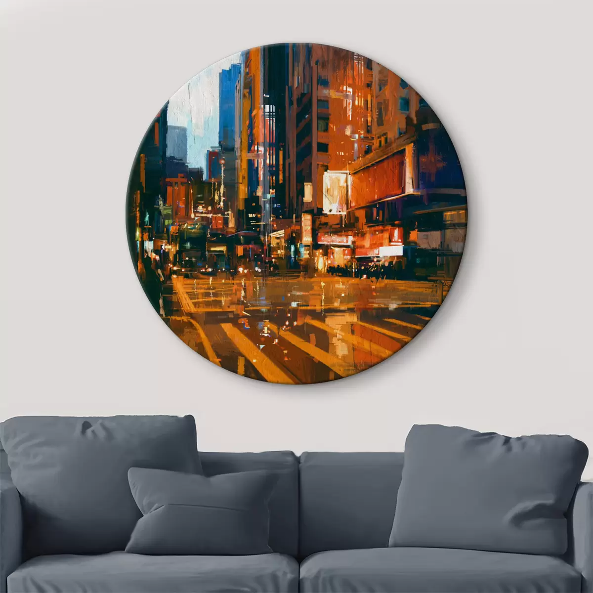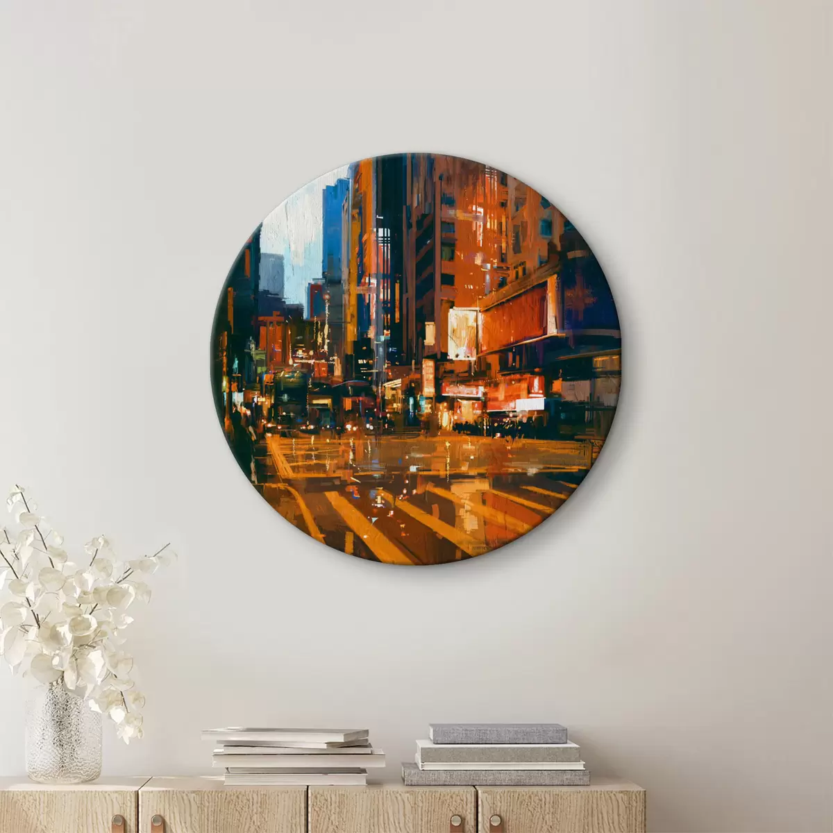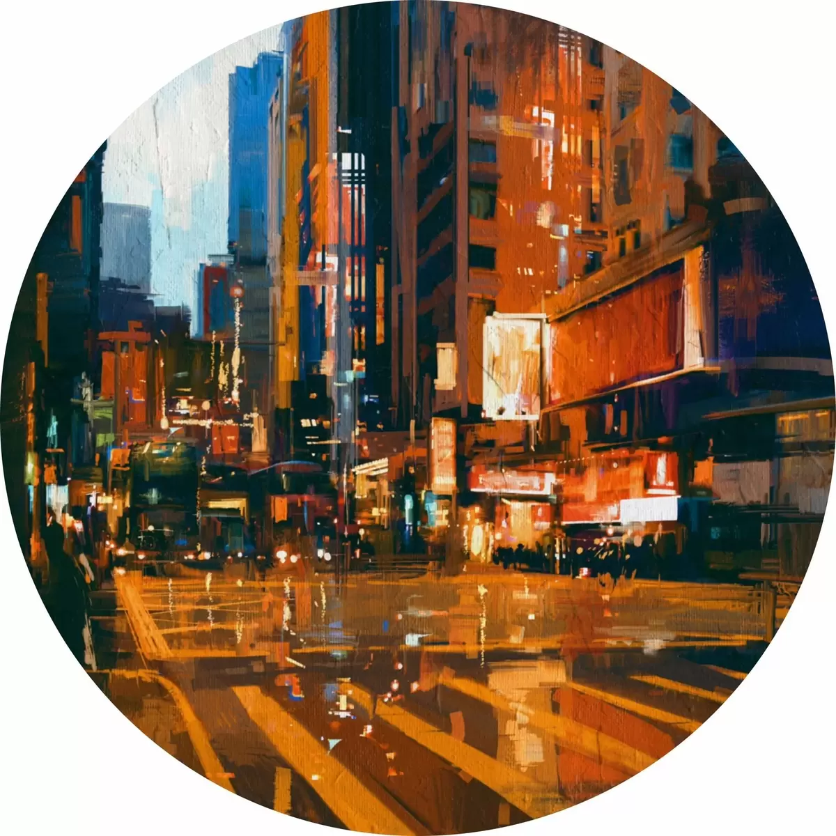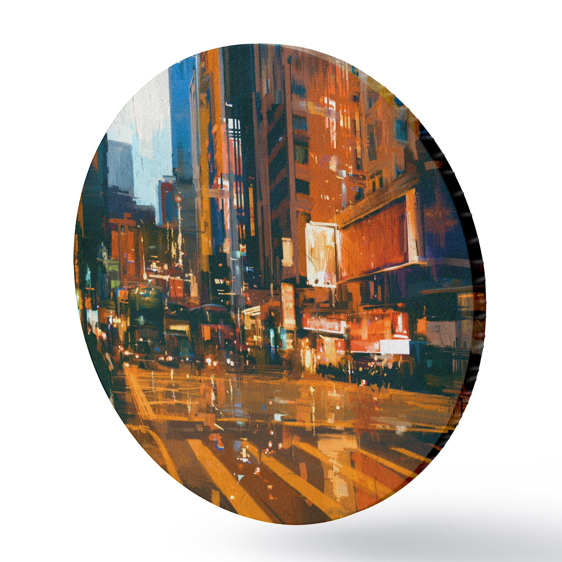 Ronde schilderijen Stadsstraat met gebouwen en lichten r37095