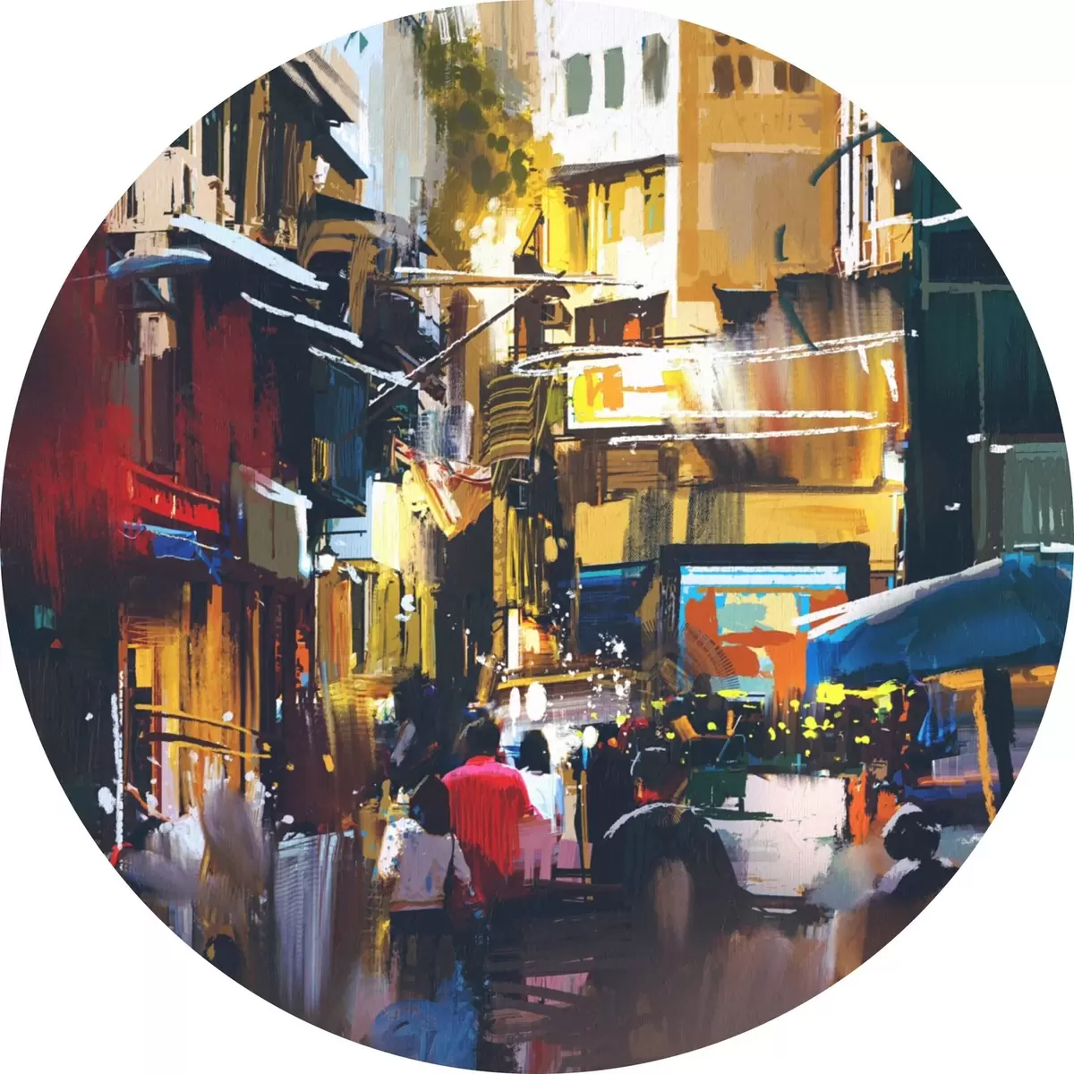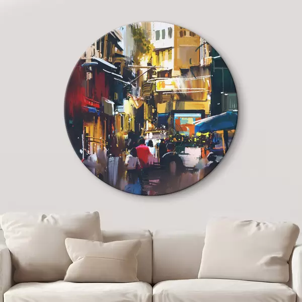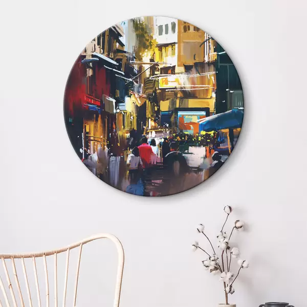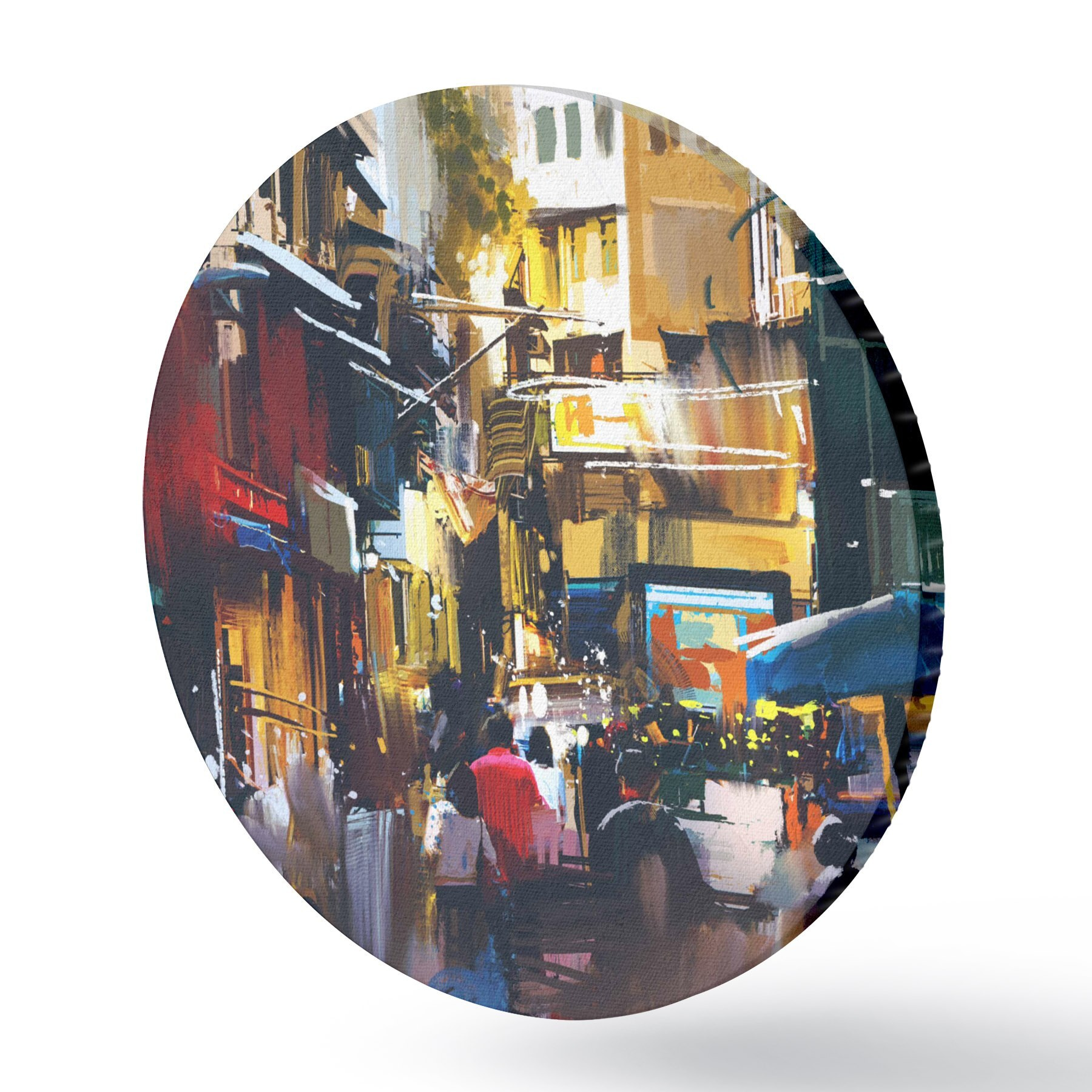 Ronde schilderijen Straat met gebouwen en lopende mensen r37096