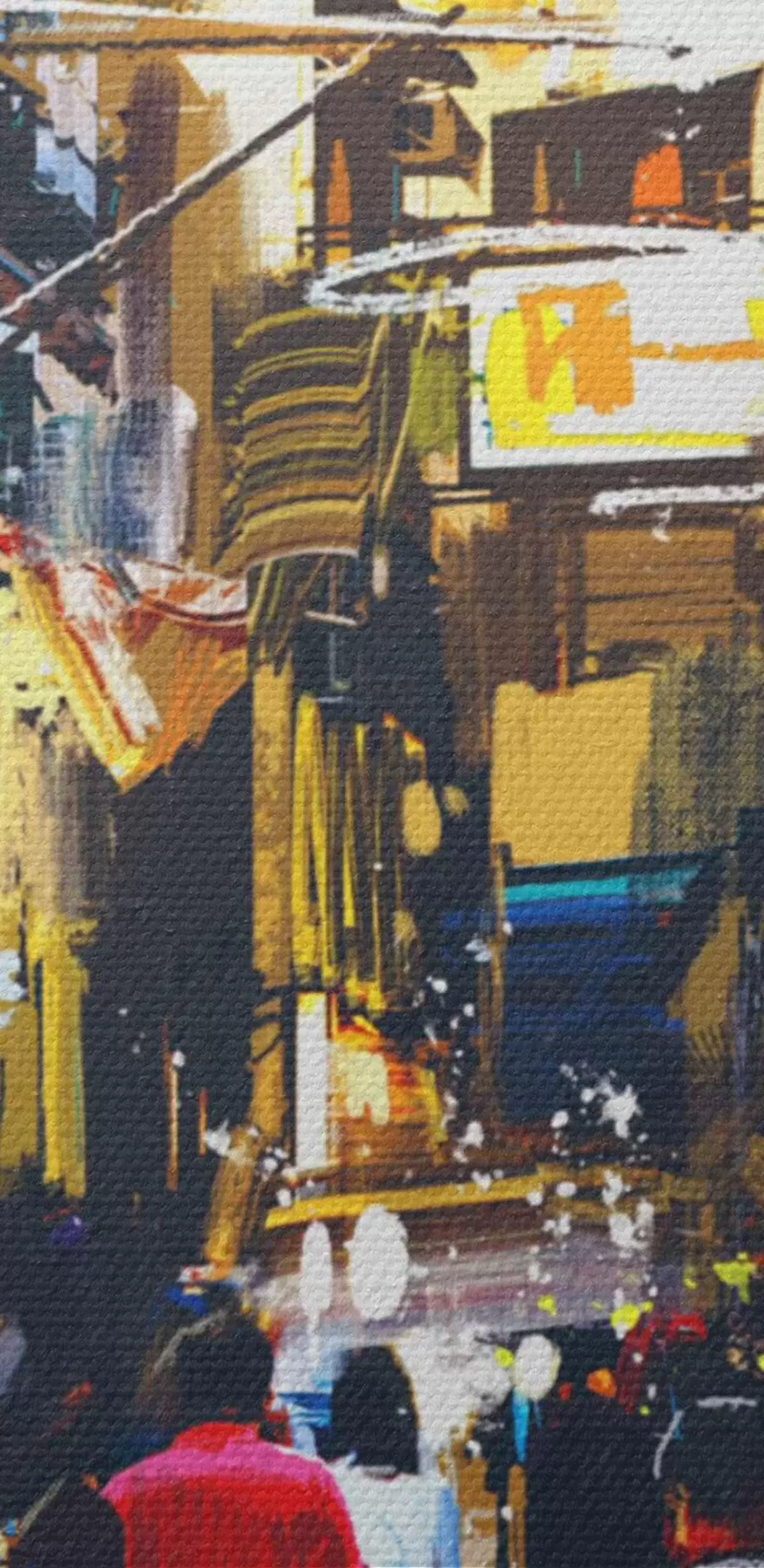Het schilderij kan direct na ontvangst worden opgehangen. Het schilderij wordt opgespannen op een 2 cm breed houten spieraam.