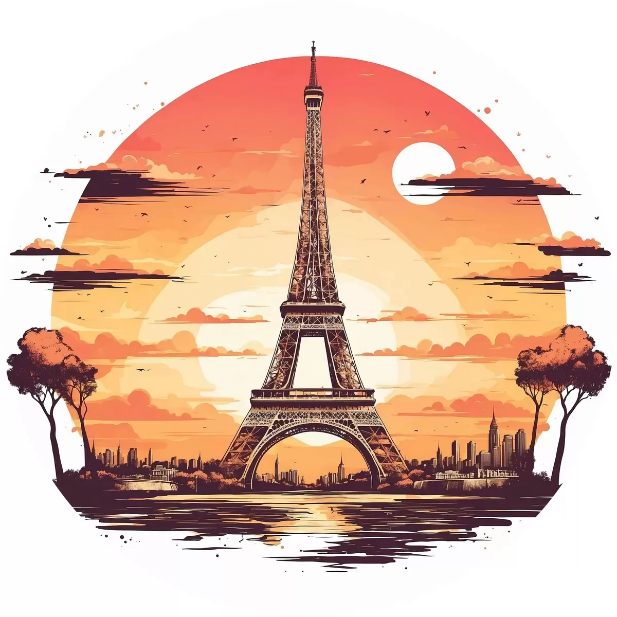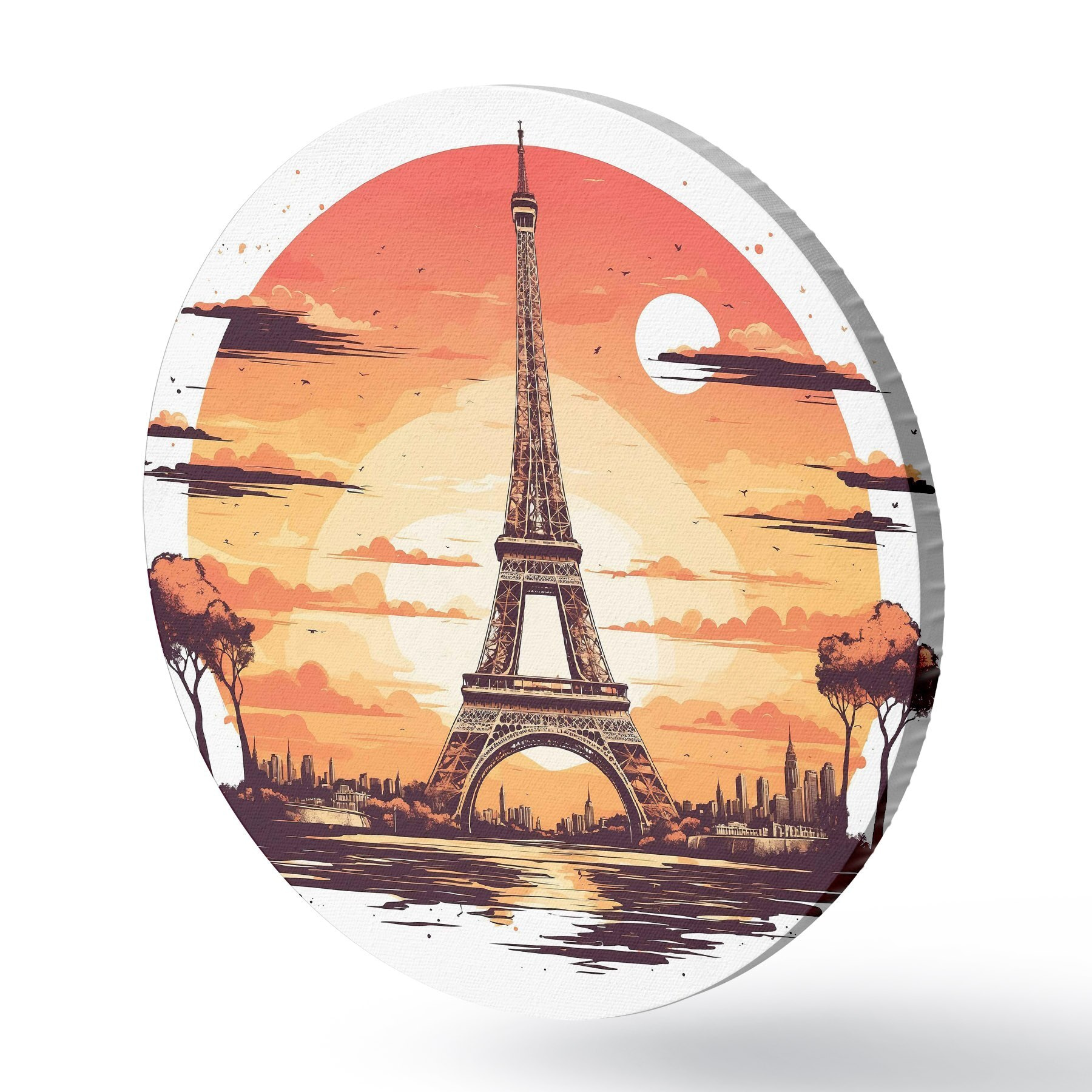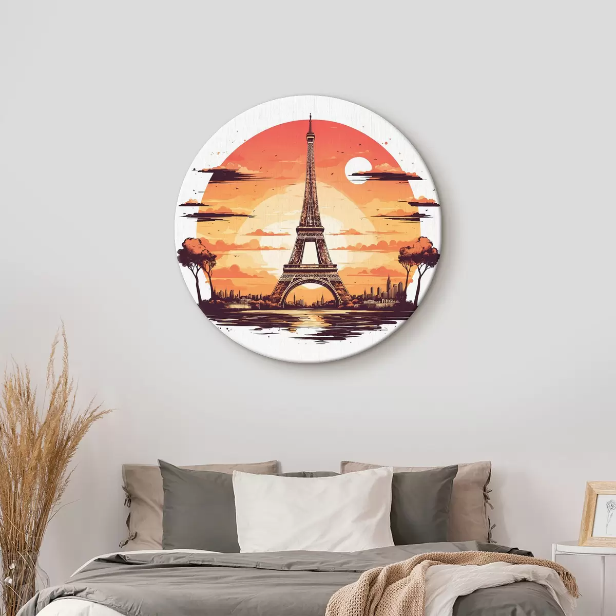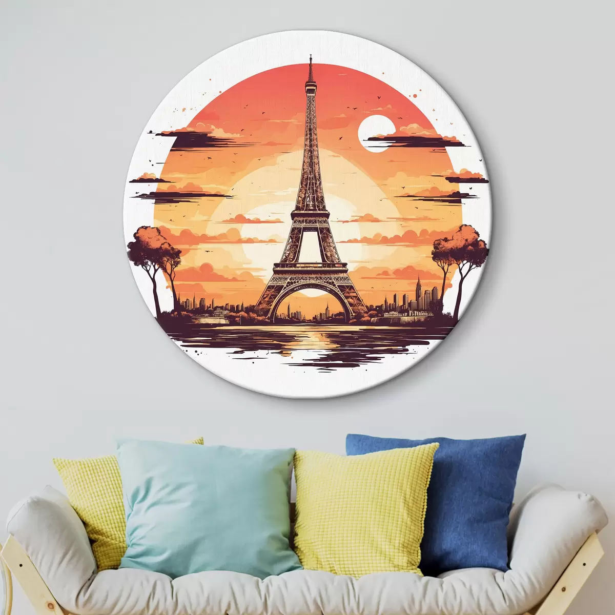 Ronde schilderijen Een toren waarachter de zon ondergaat r37124