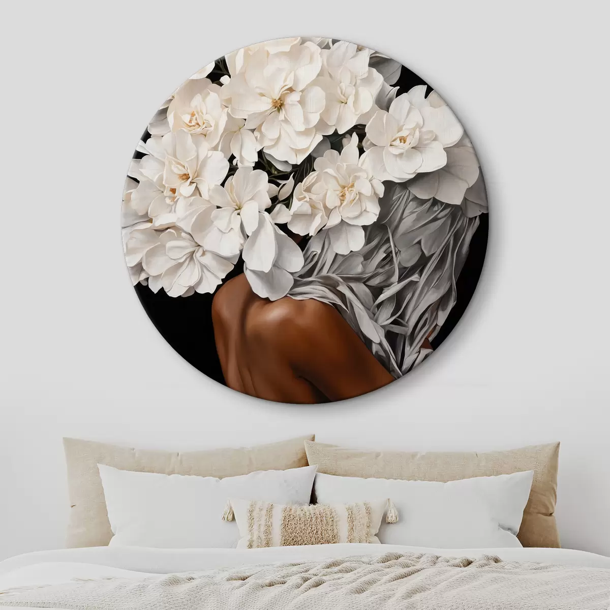 Ronde schilderijen Vrouw met witte bloemen op zwarte achtergrond r37163