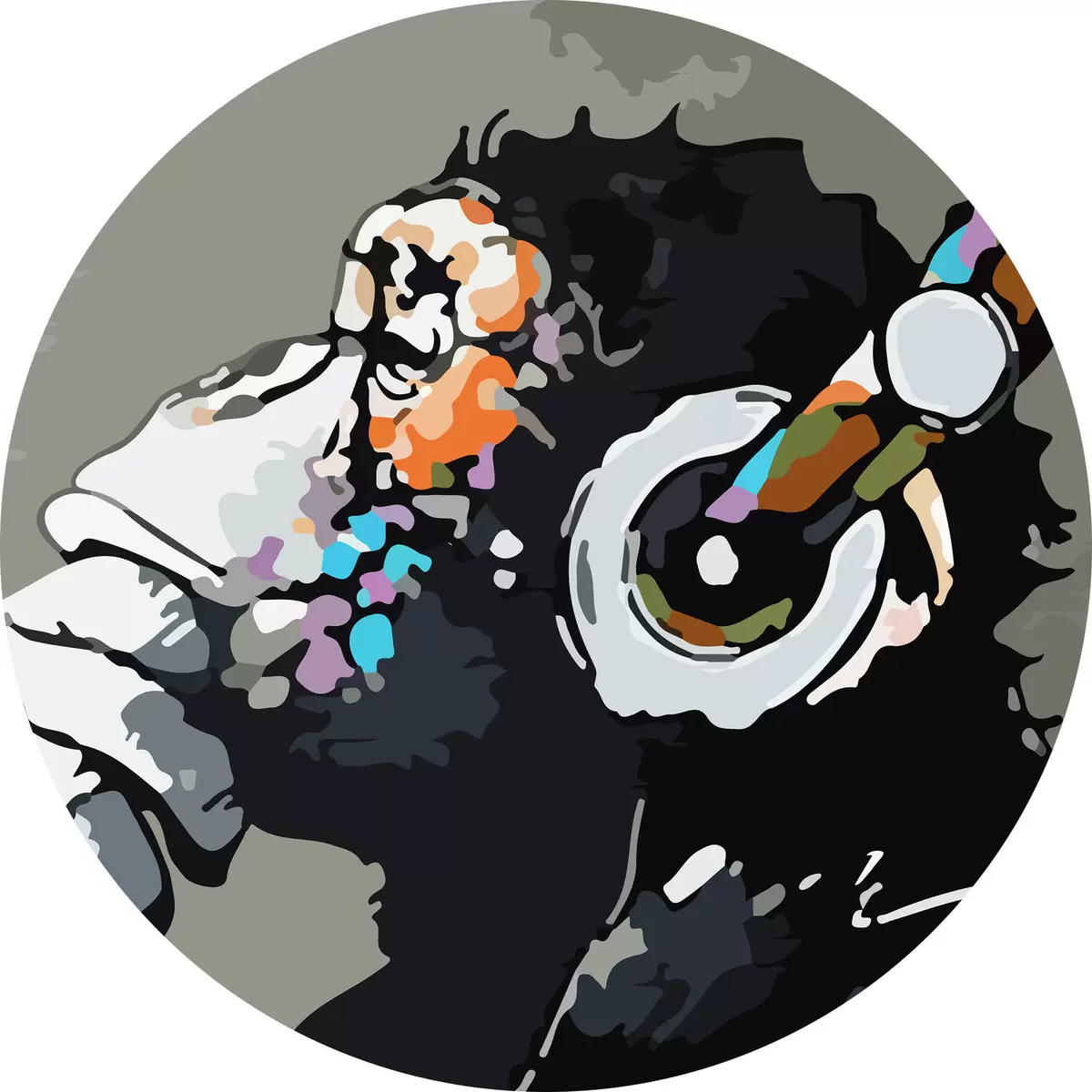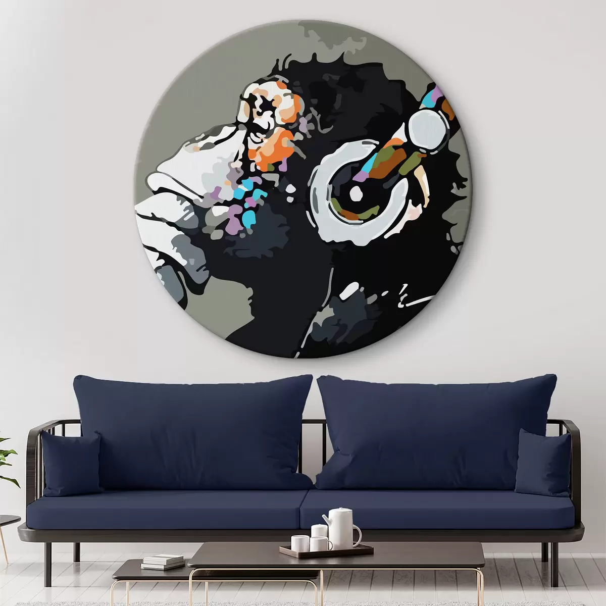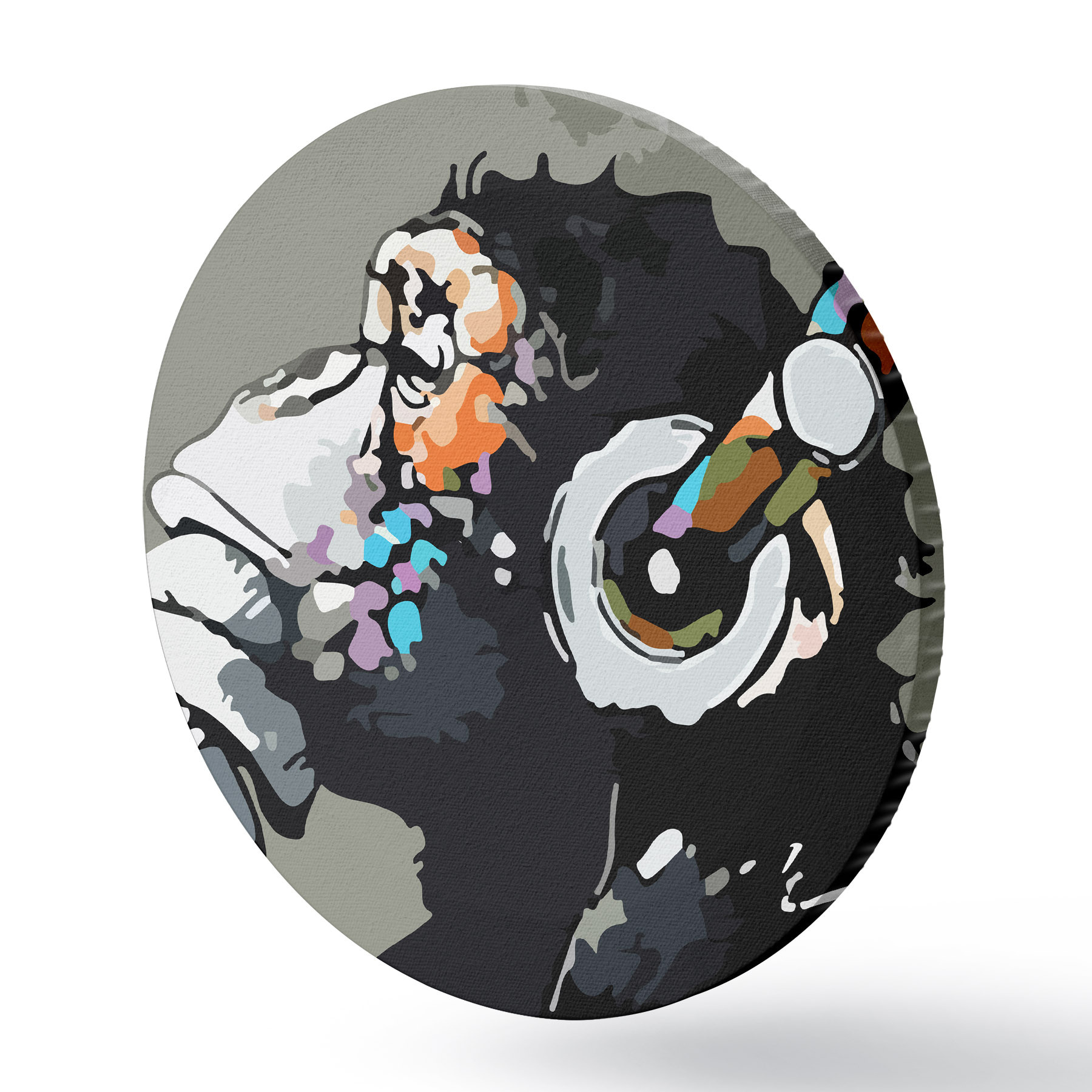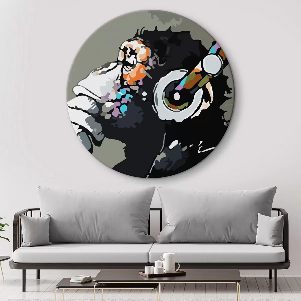 Ronde schilderijen Aap met koptelefoon op grijze achtergrond r37269