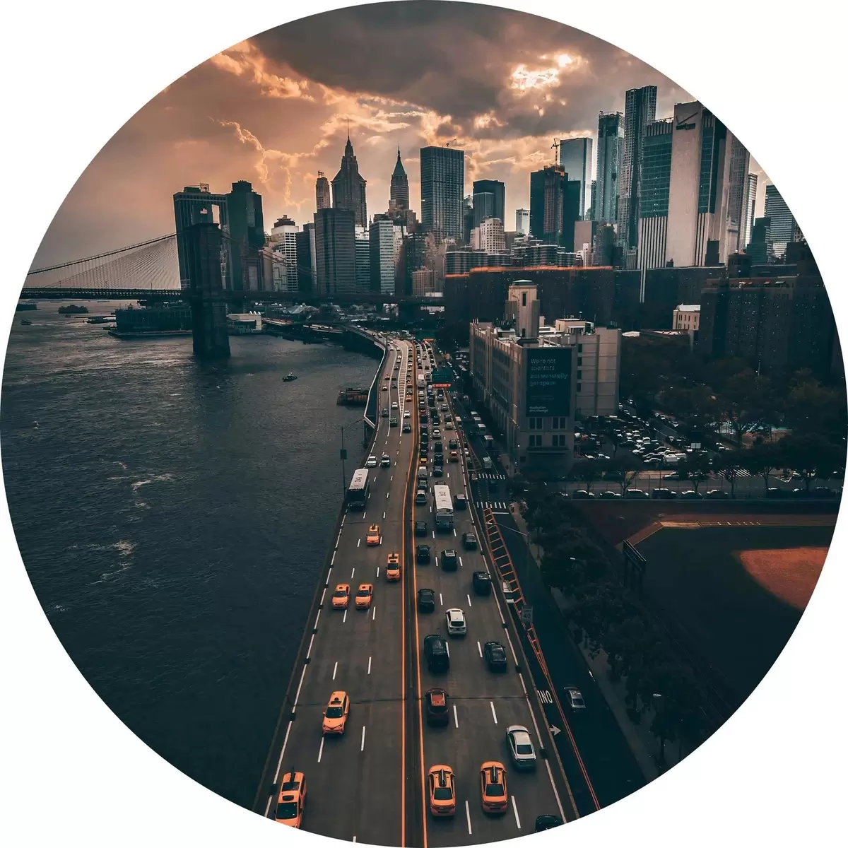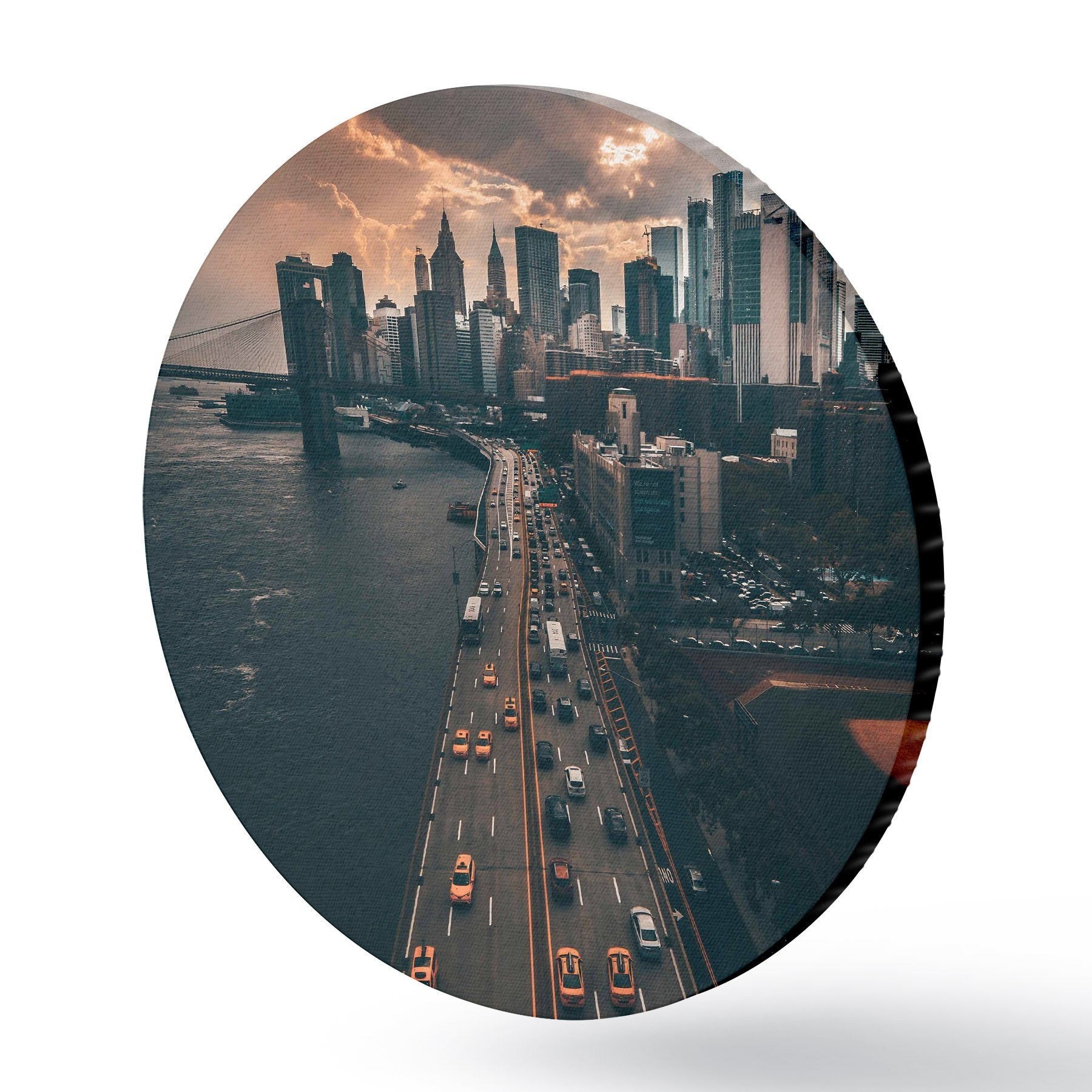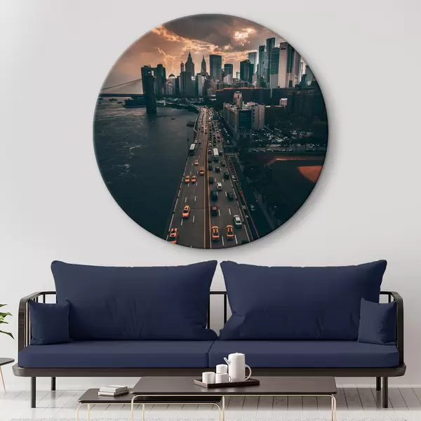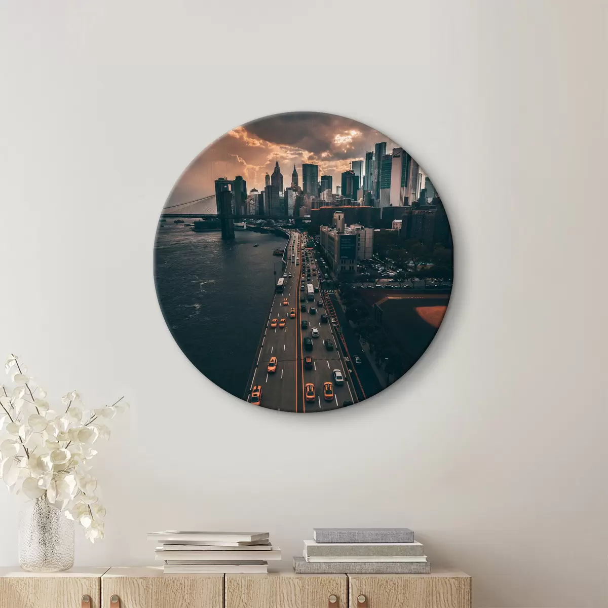 Ronde schilderijen Brug over water met auto's en gebouwen op de achtergrond r37482