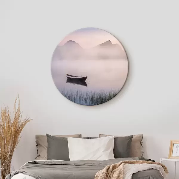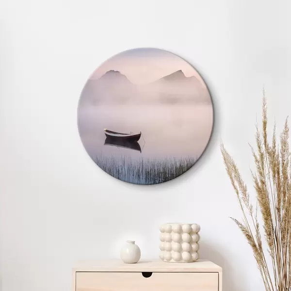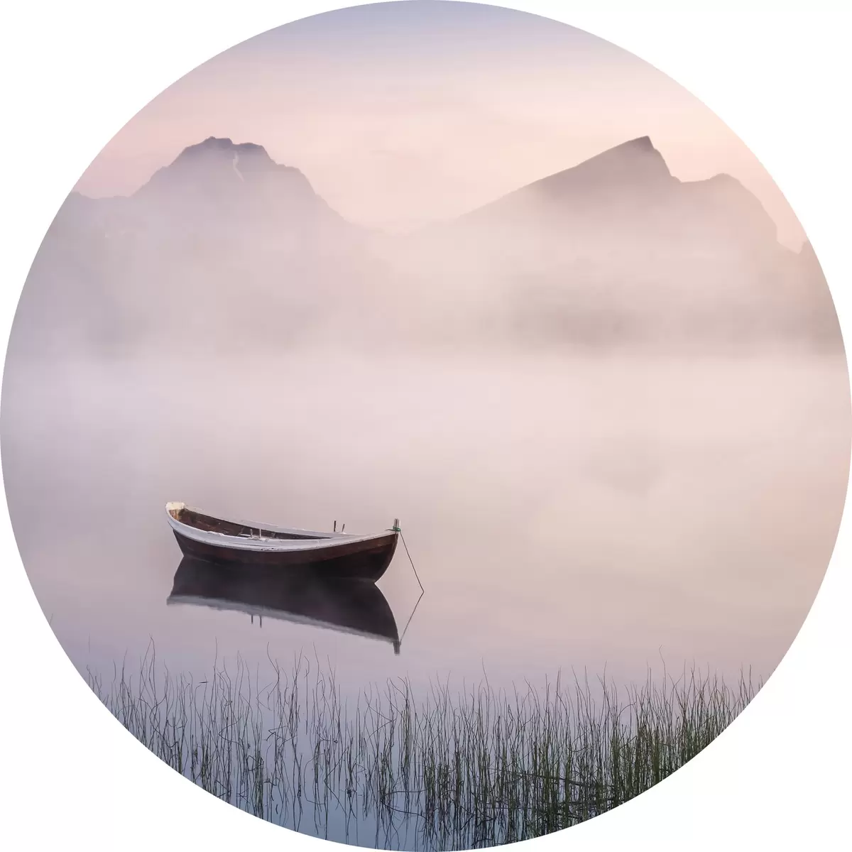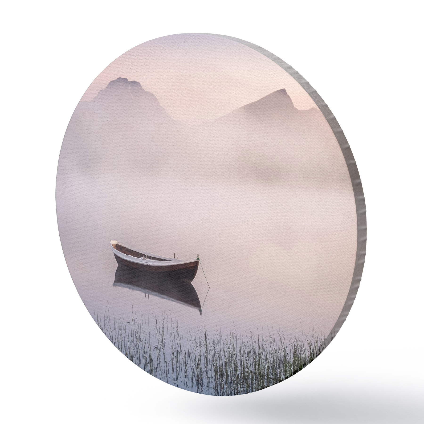 Ronde schilderijen Boot op een meer met gras en bergen op de achtergrond r37622