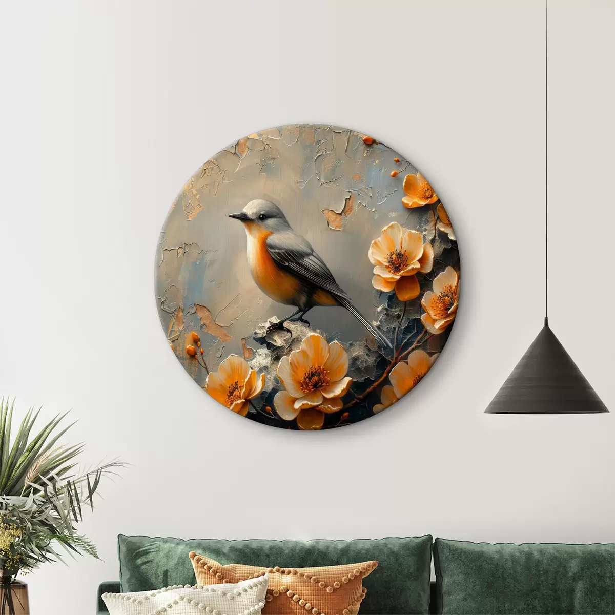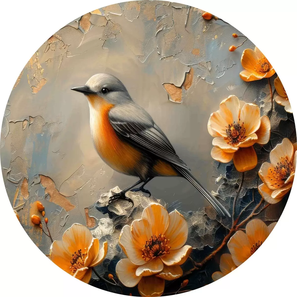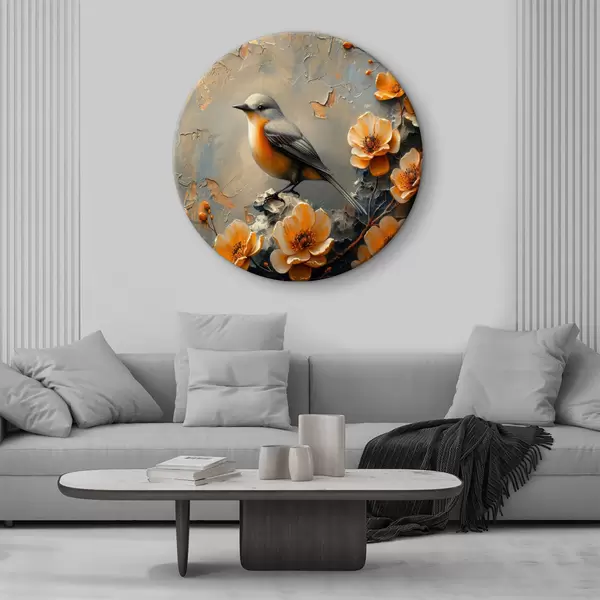 Ronde schilderijen Vogel op een tak met bloemen r37770