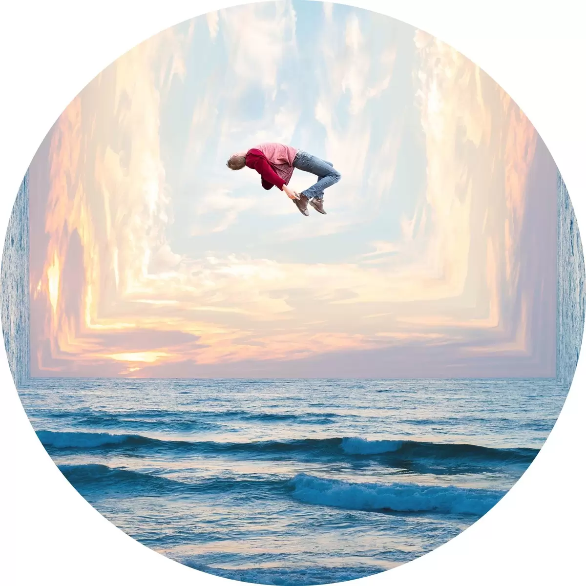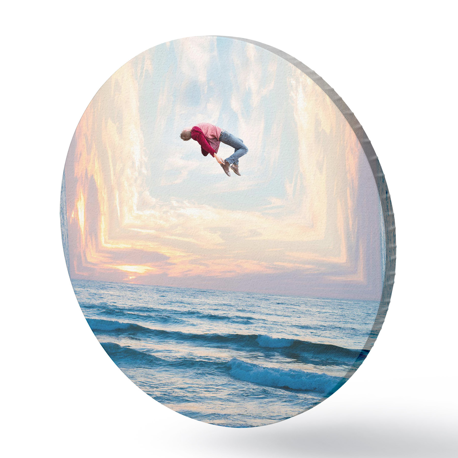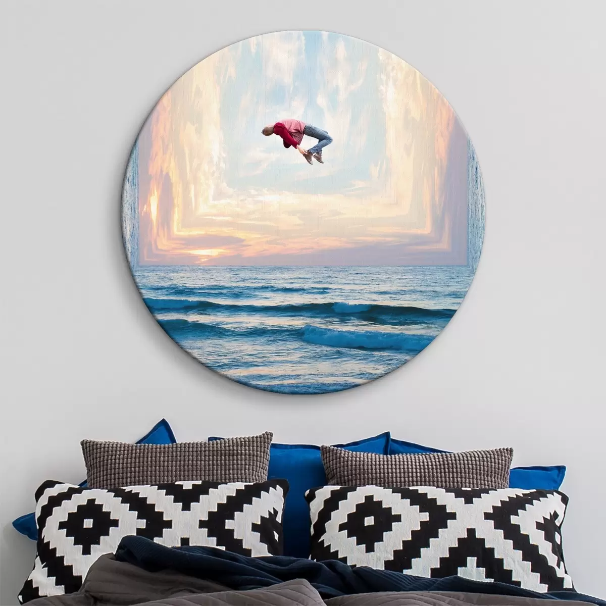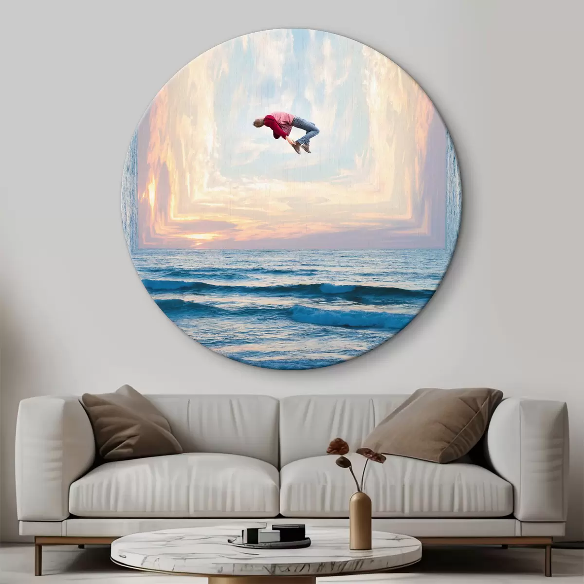 Ronde schilderijen Een man springt in de lucht boven het water r37786
