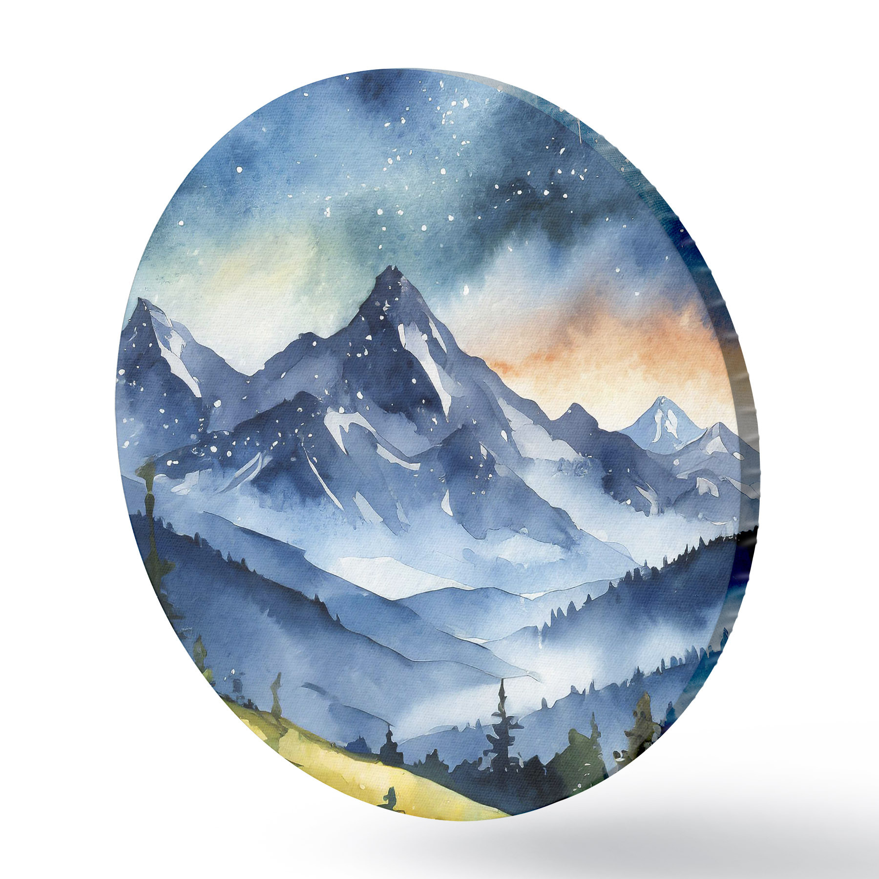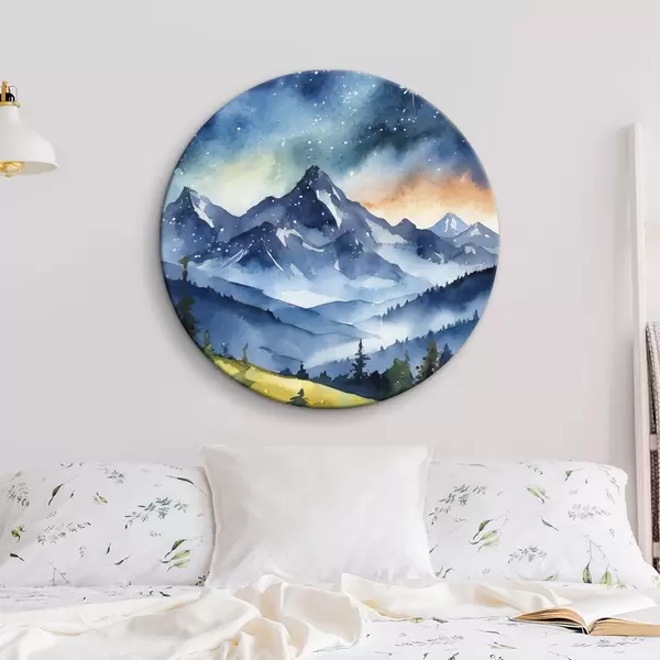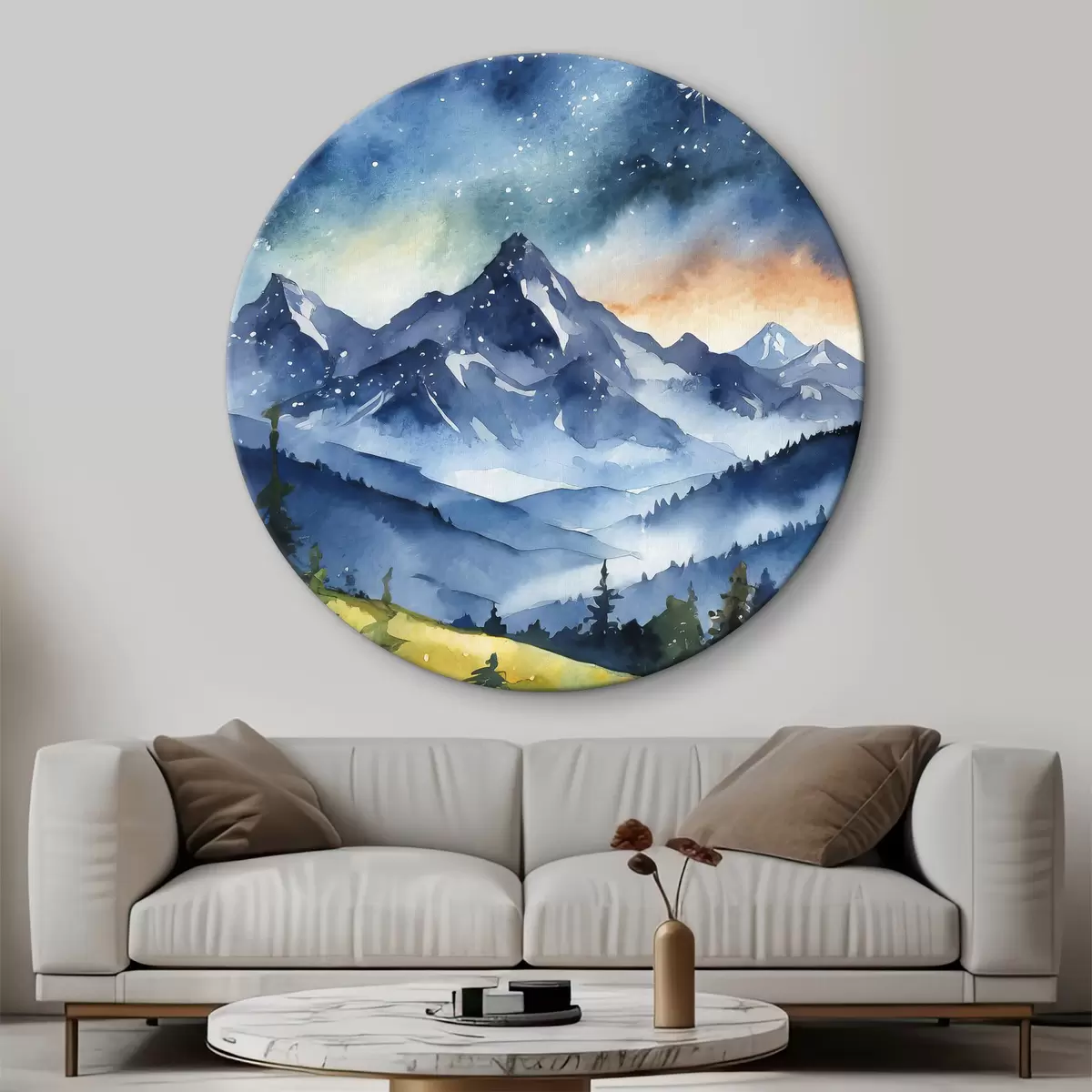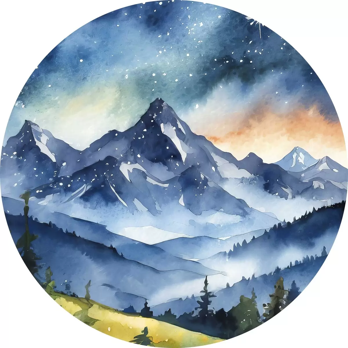 Ronde schilderijen Aquarel berglandschap, bos, sterrenhemel, zonsondergang kleuren r37946