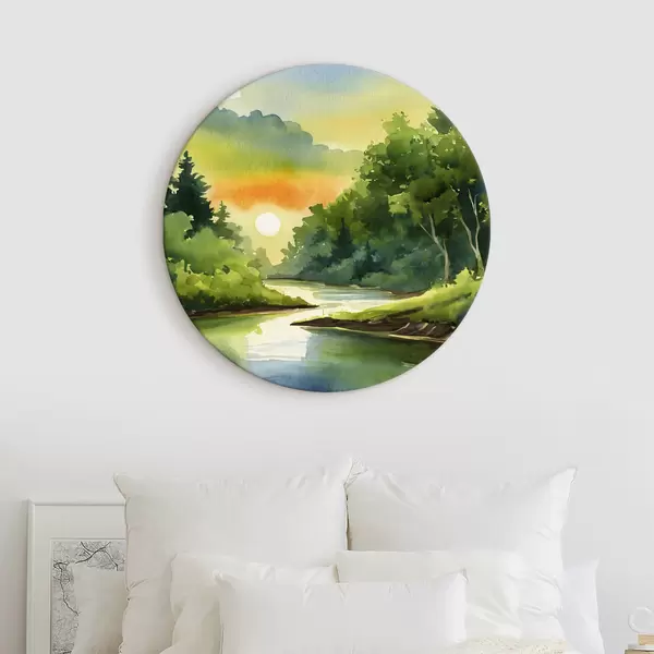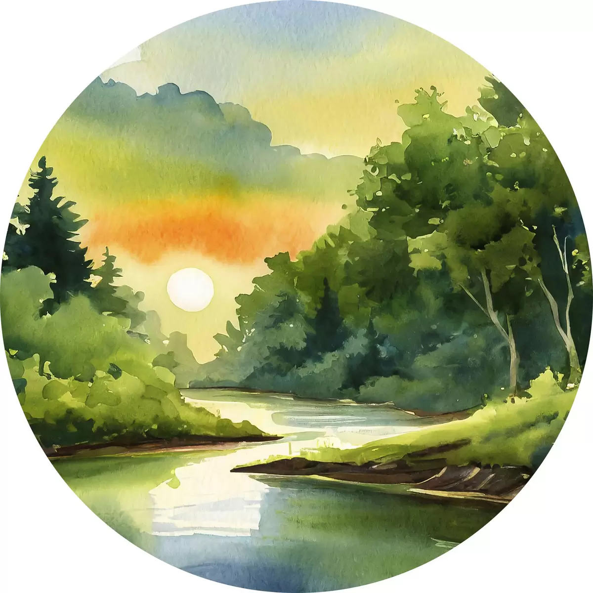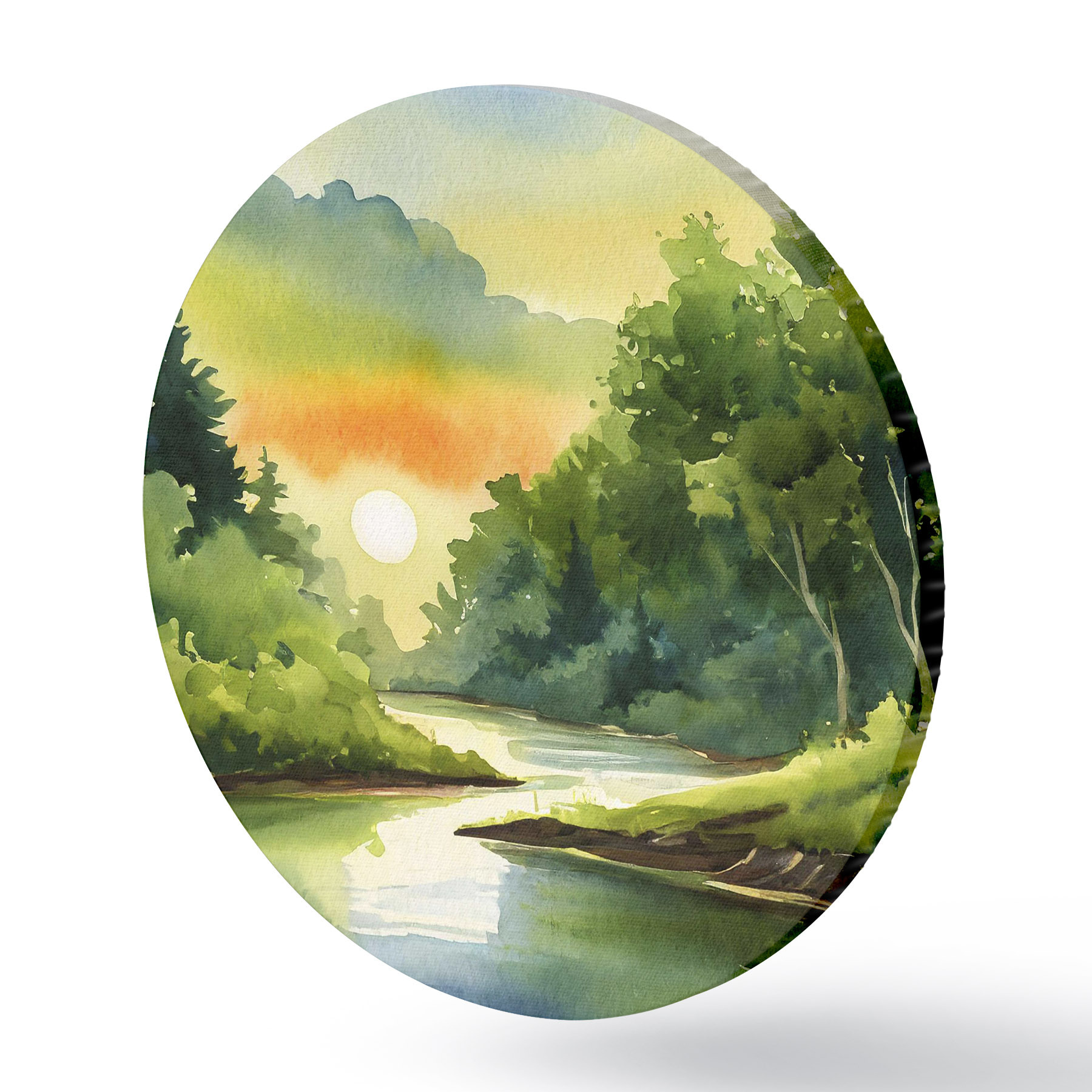 Ronde schilderijen Zonsondergang op de rivier, bos, aquarel, zonsondergang, groen, natuur r37949