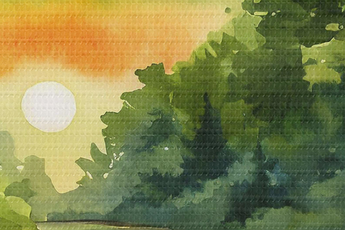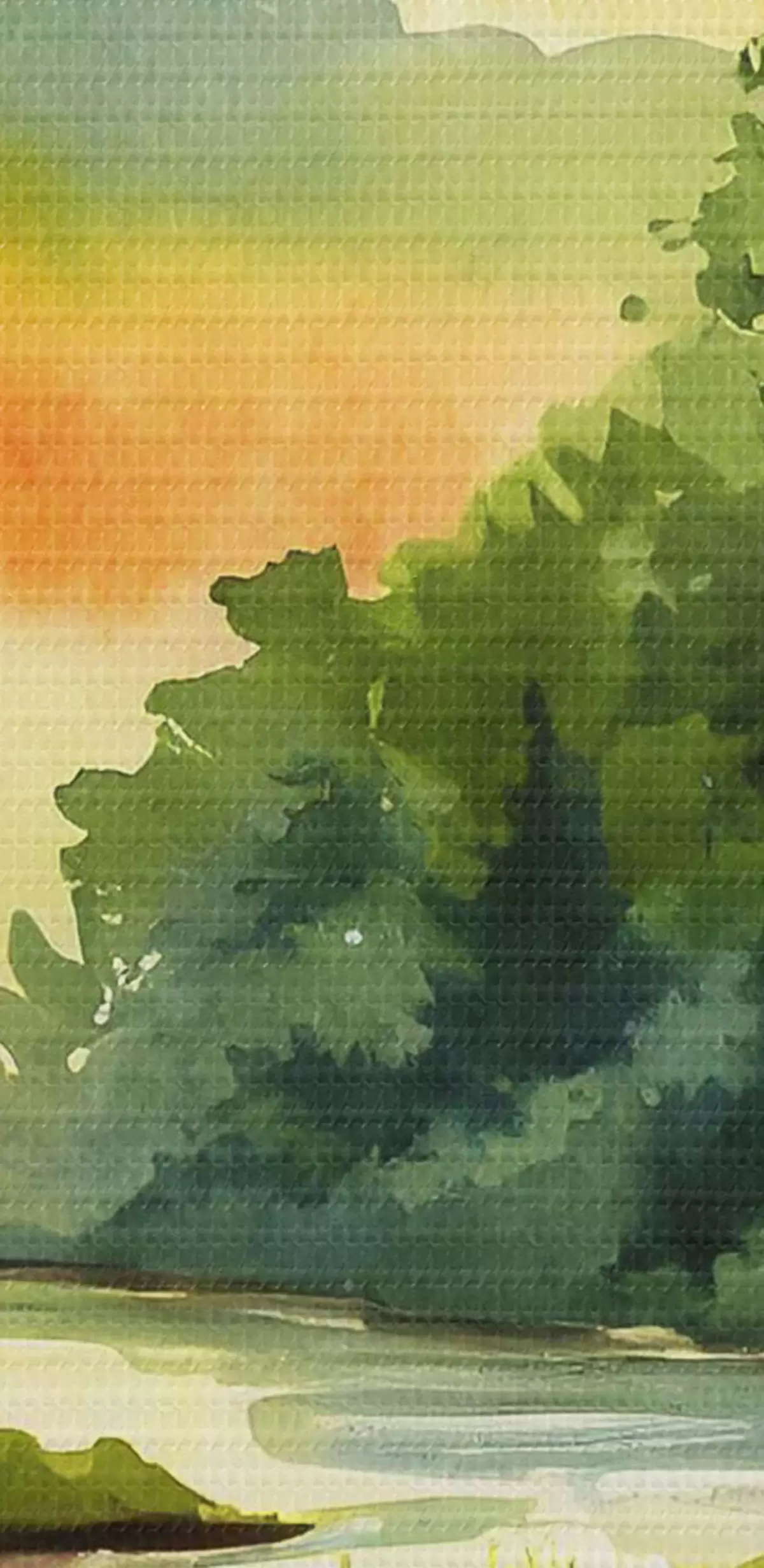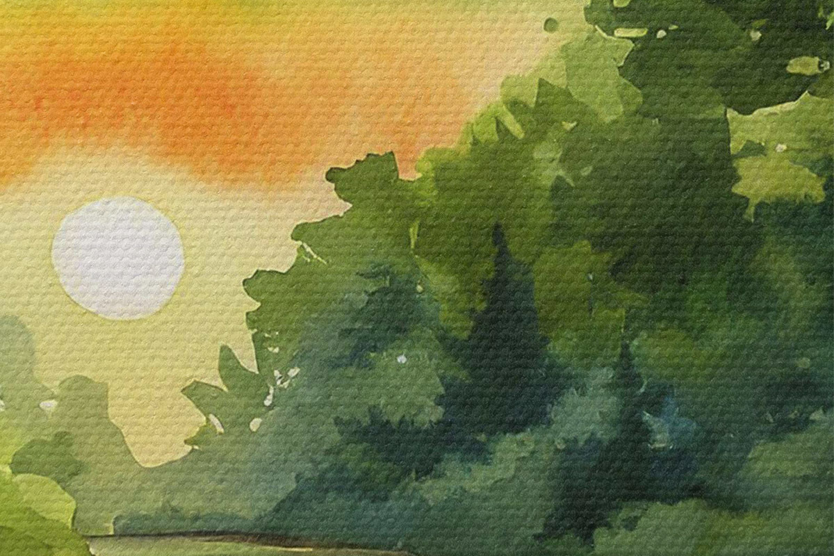 Afbeelding Zonsondergang op de rivier, bos, aquarel, zonsondergang, groen, natuur Nr r37949