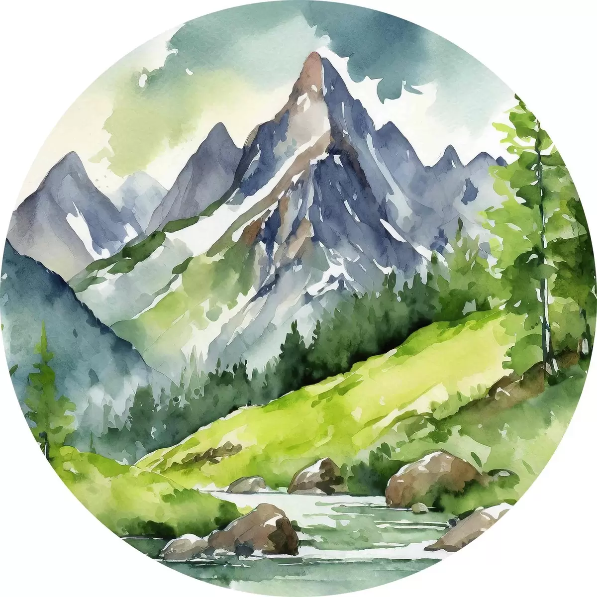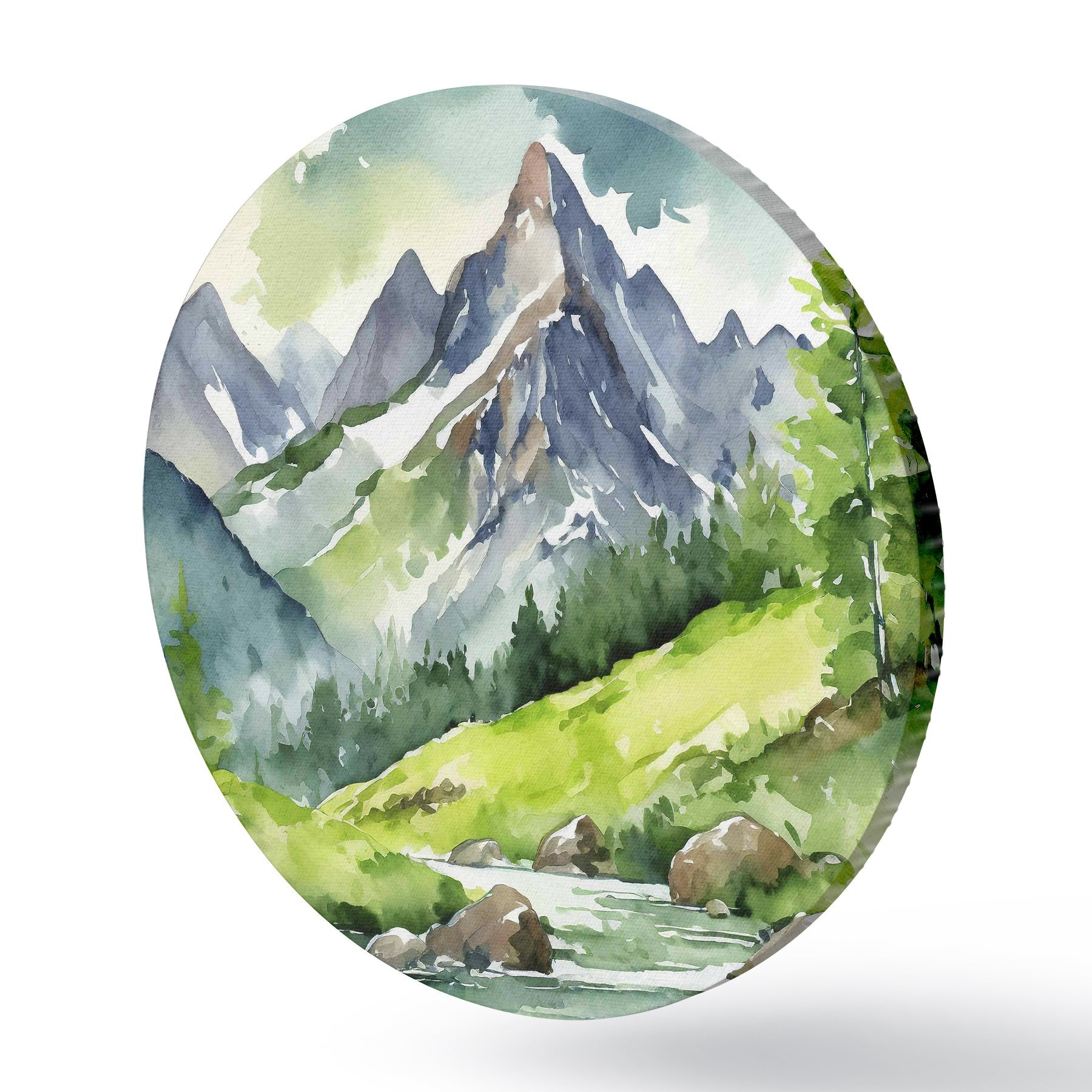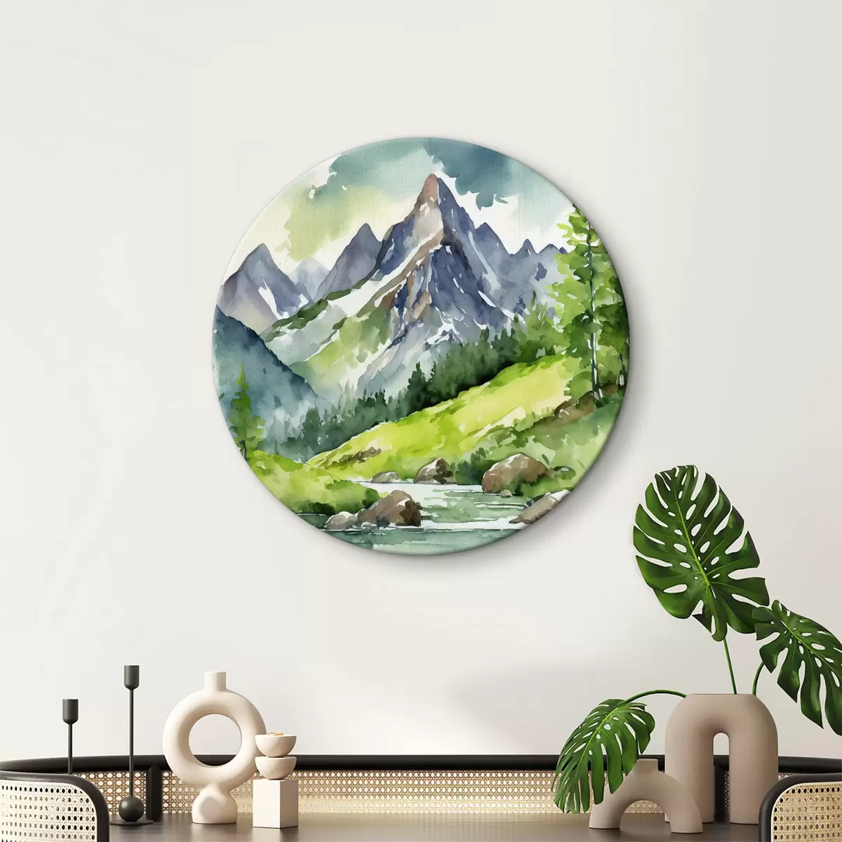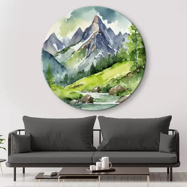 Ronde schilderijen Majestueuze bergen onder een zachte hemel r37958
