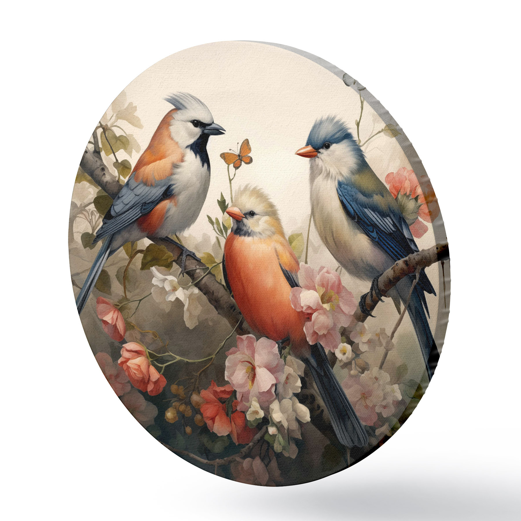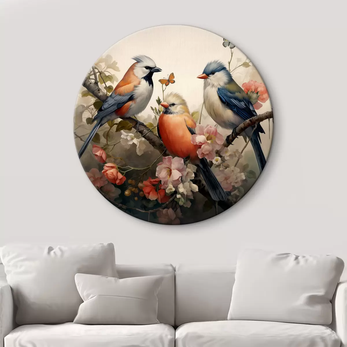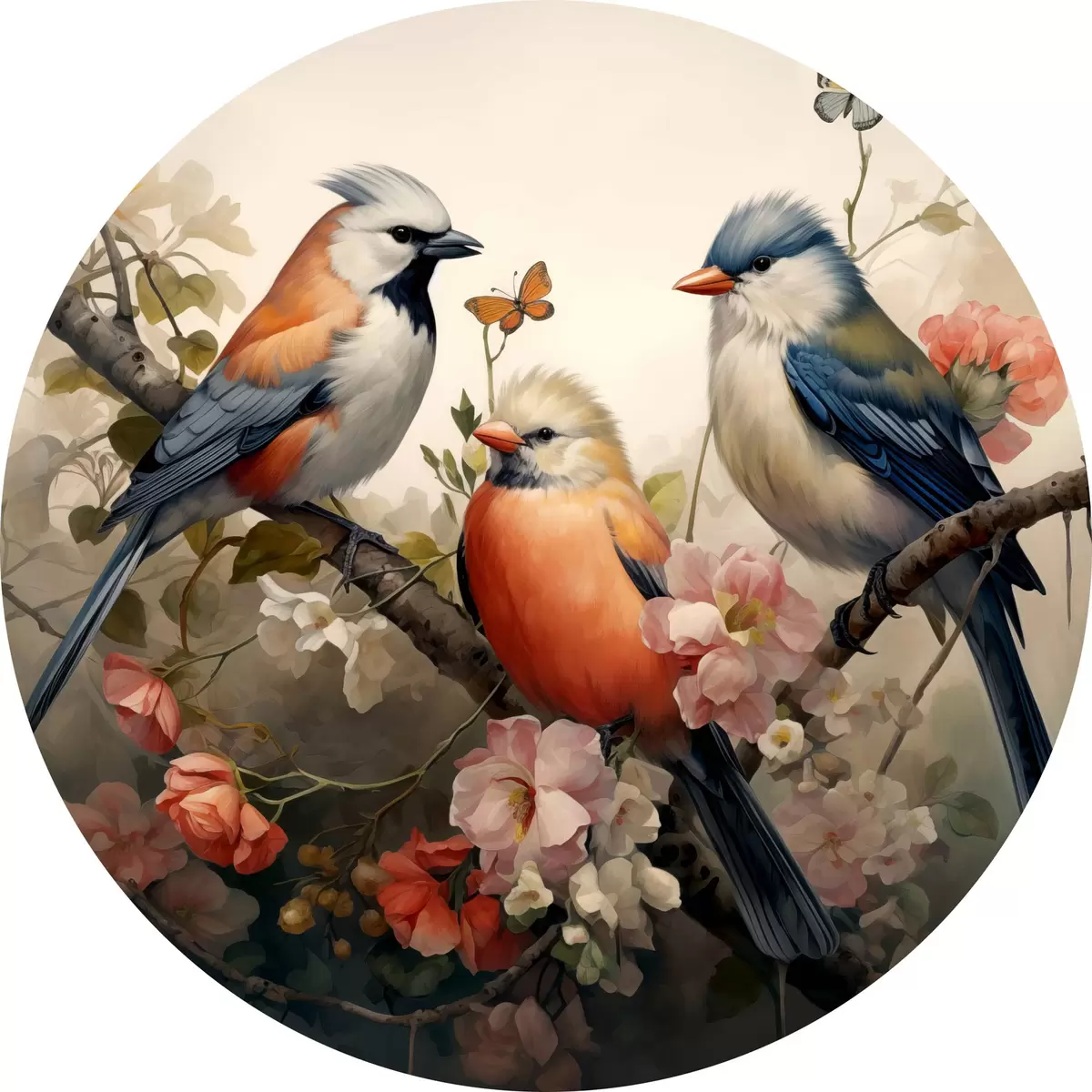 Ronde schilderijen Een groep vogels op een tak met bloemen r38103
