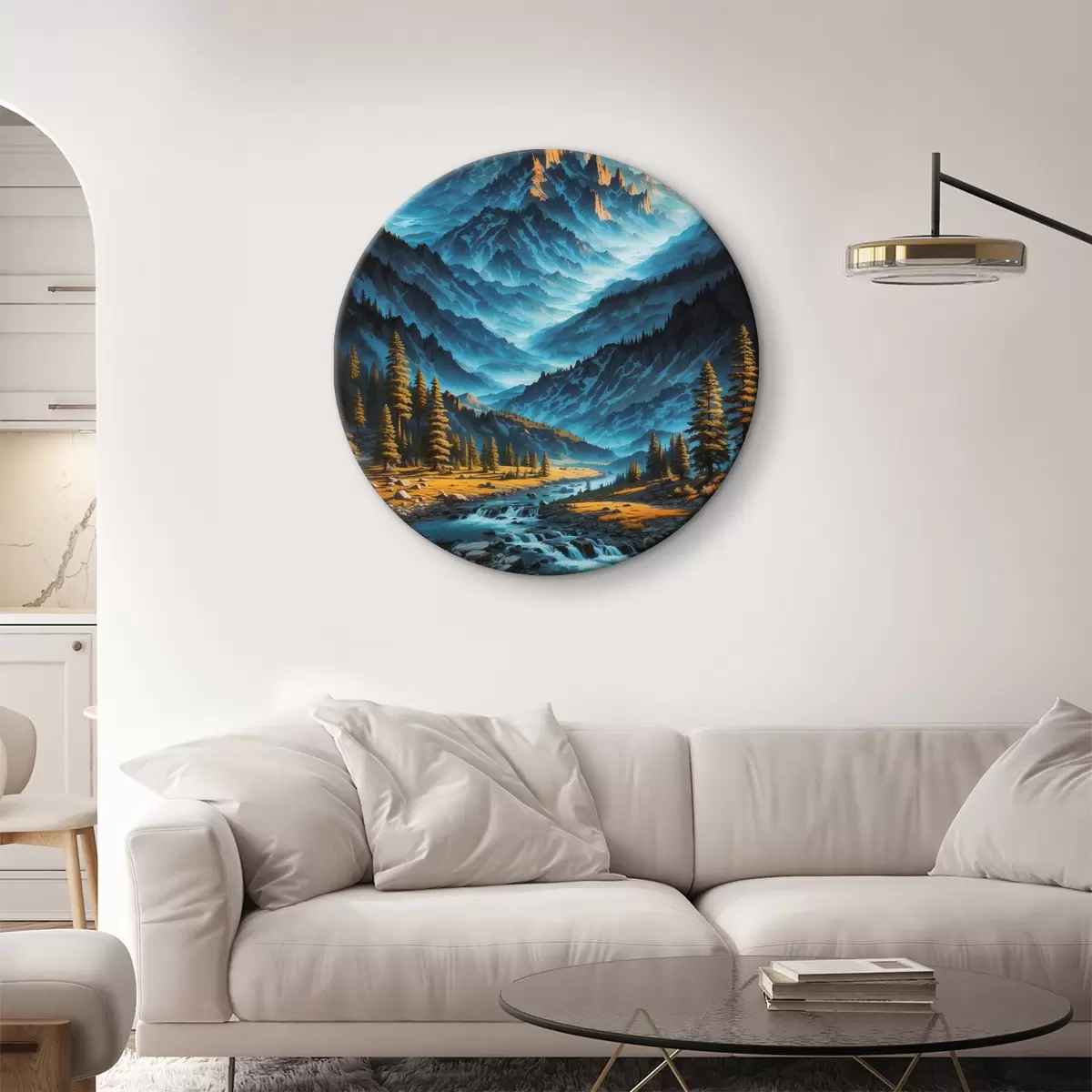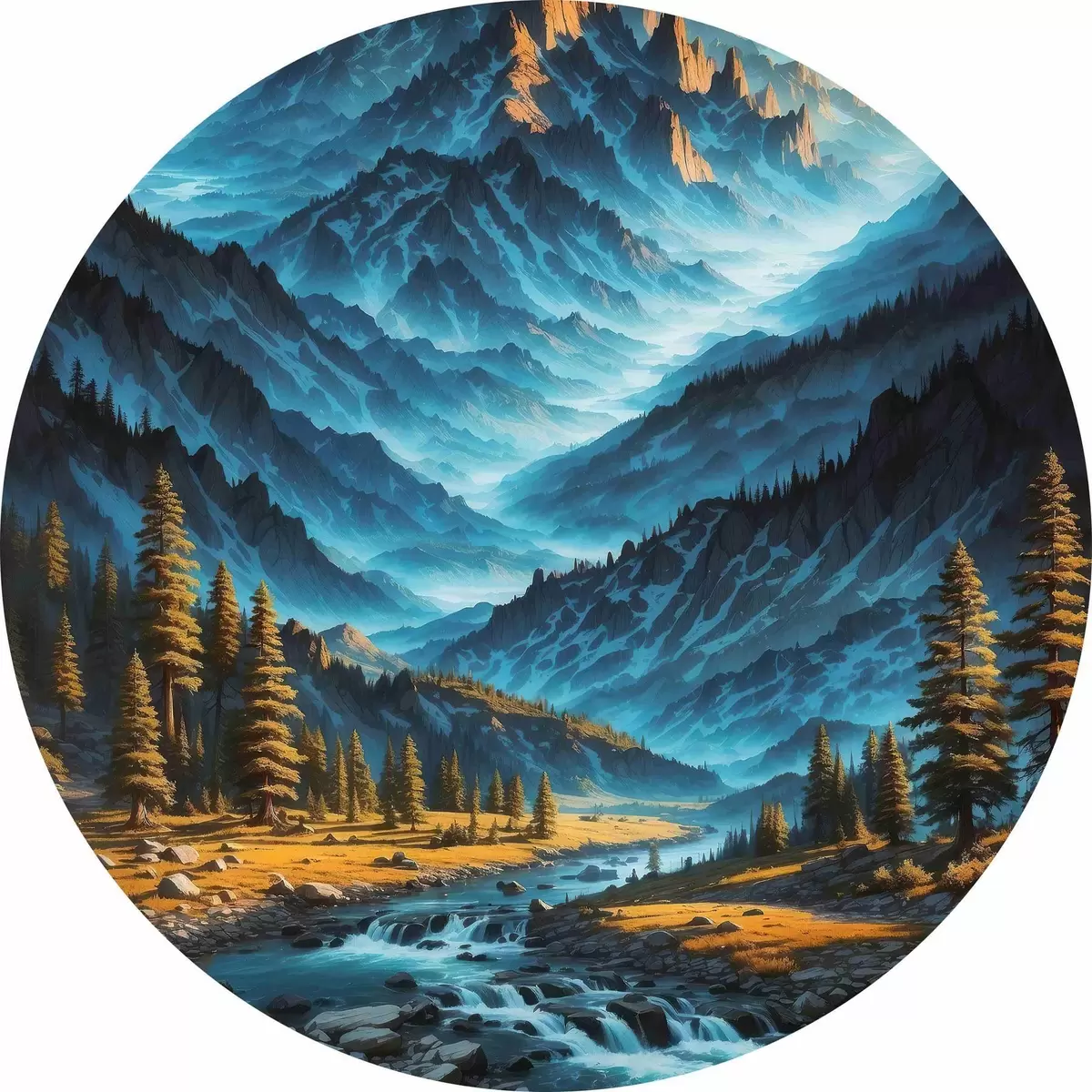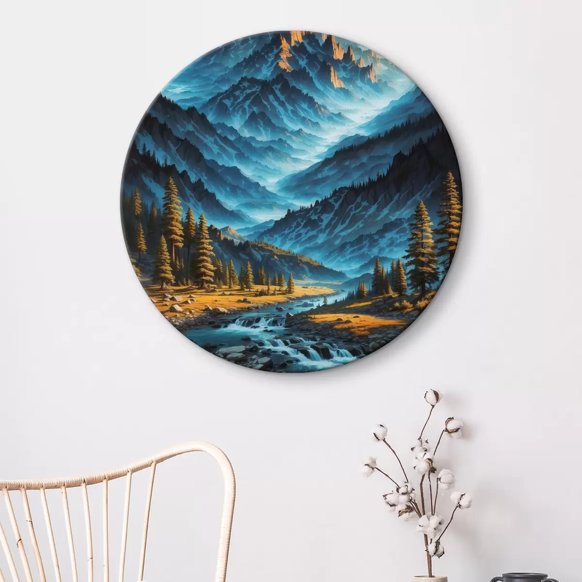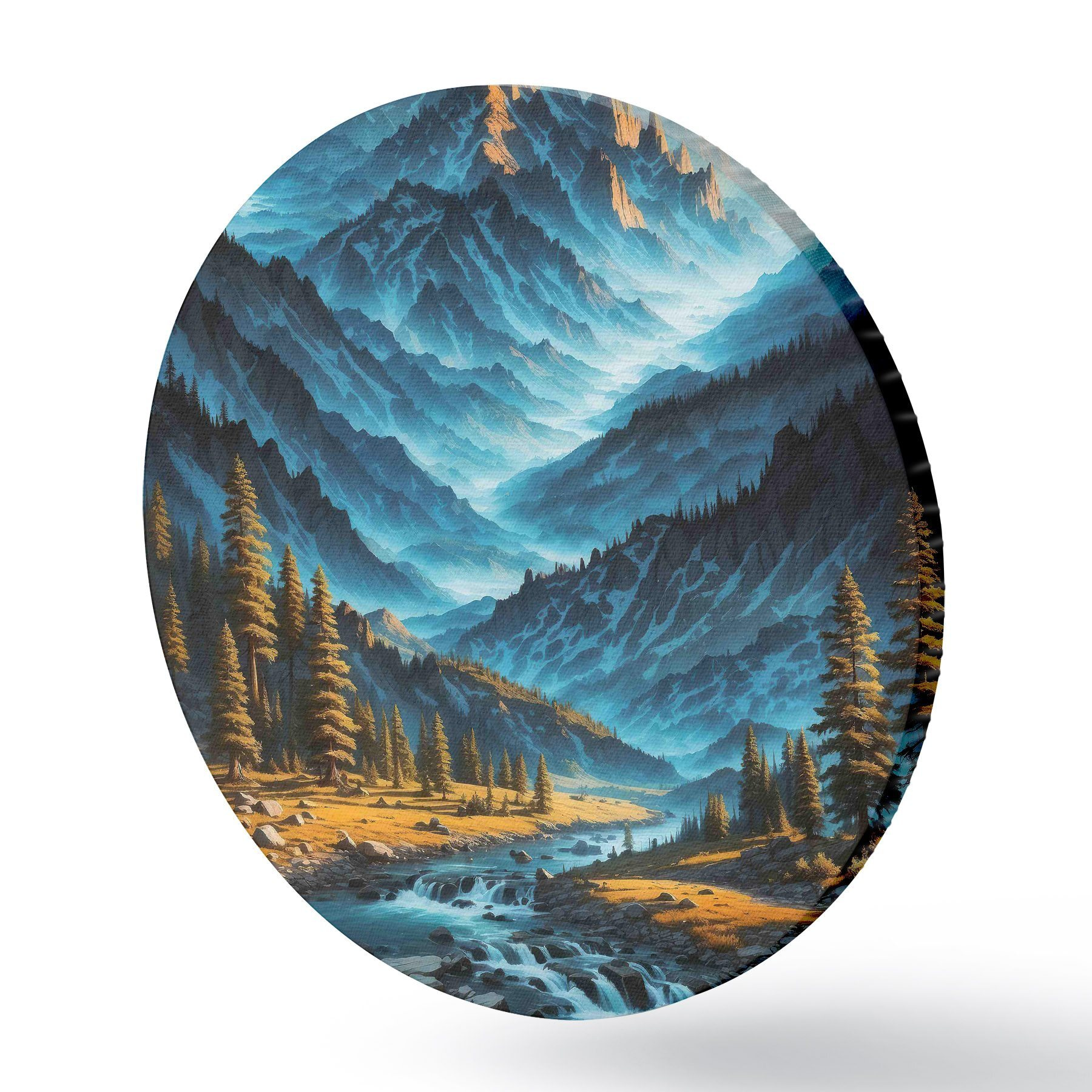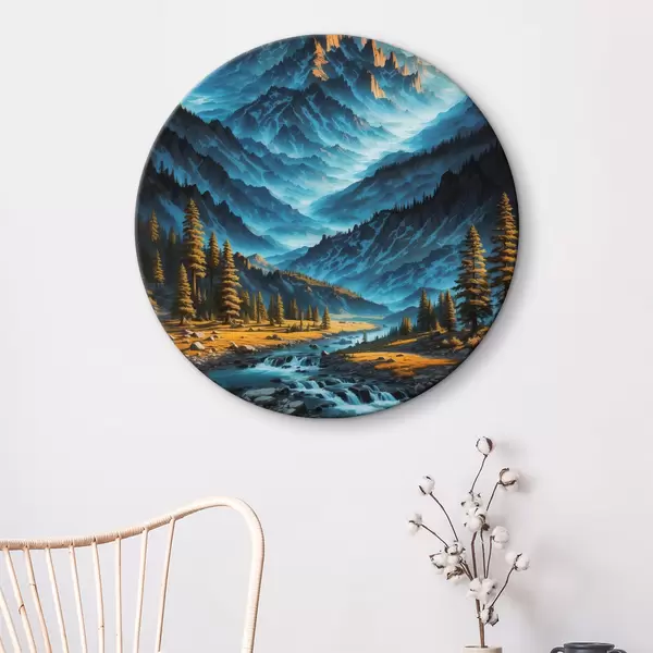 Ronde schilderijen Bergketen met bomen en rivier r38134