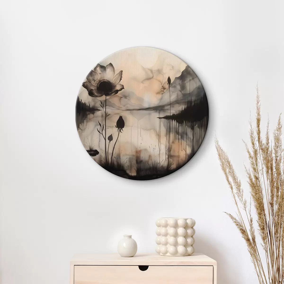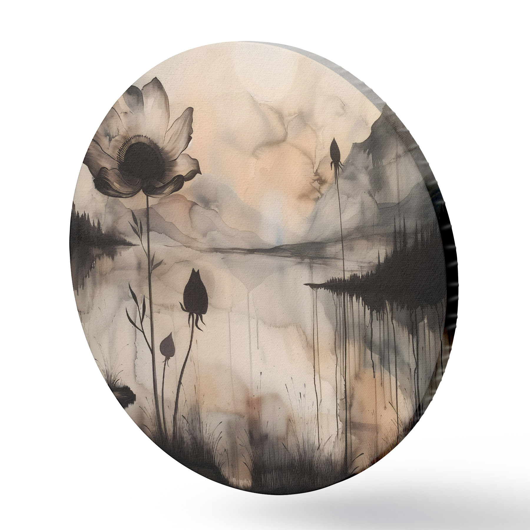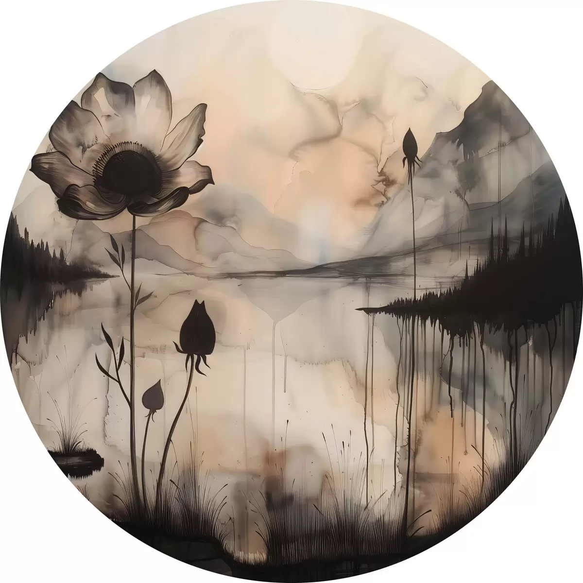 Ronde schilderijen Een schilderij van een bloem en een meer r38161