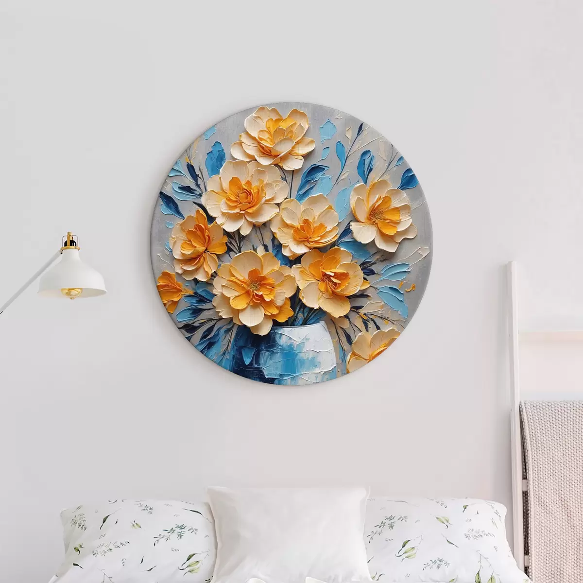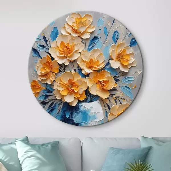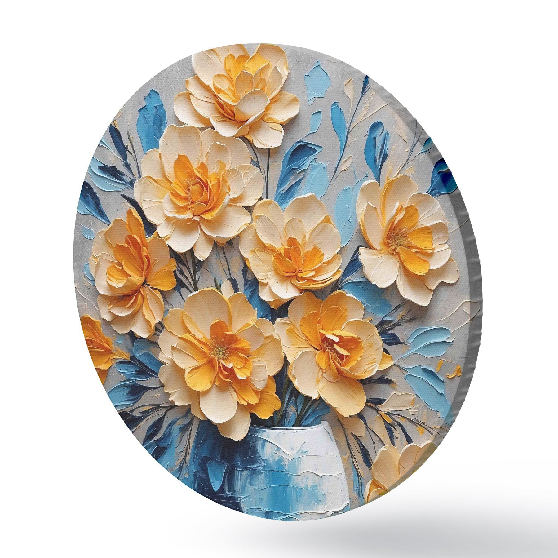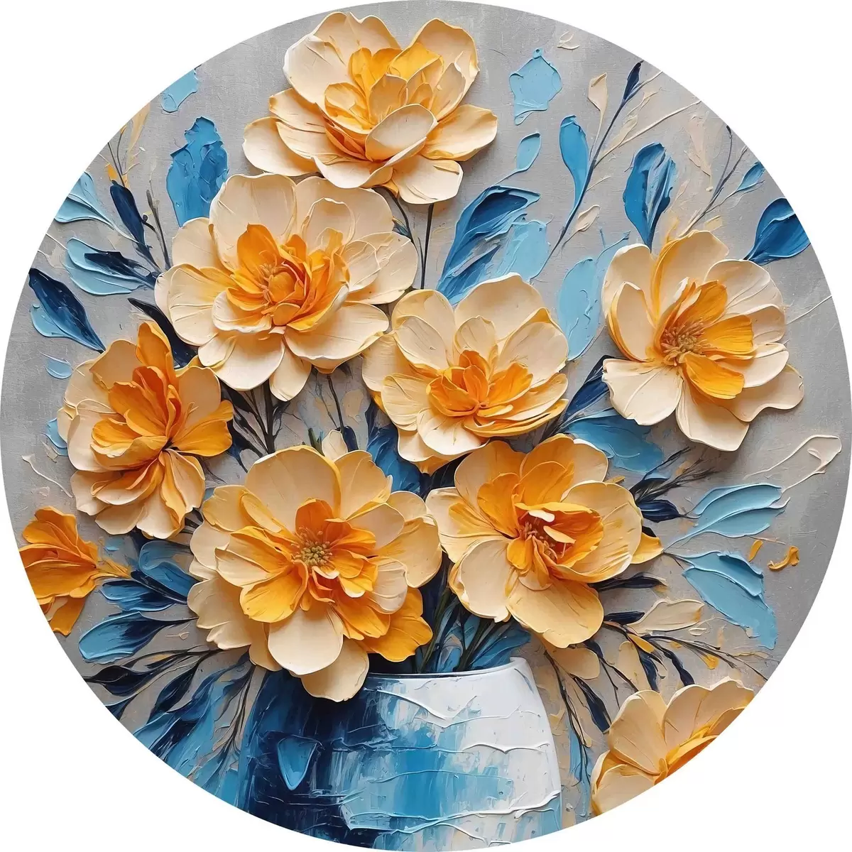 Ronde schilderijen Bloemen in een blauwe vaas op een grijze achtergrond r38175