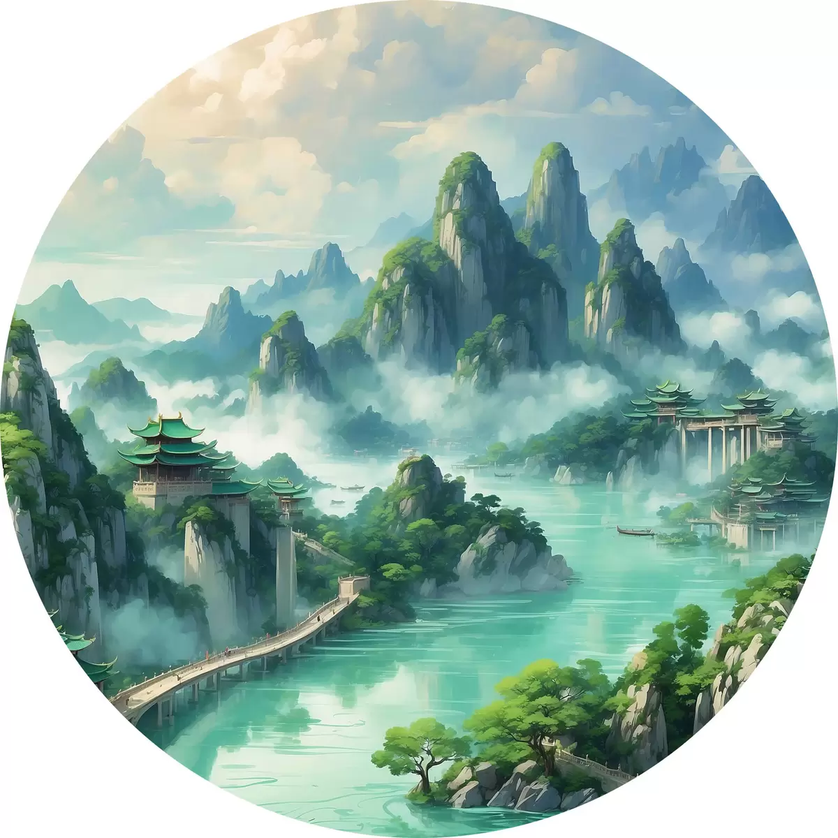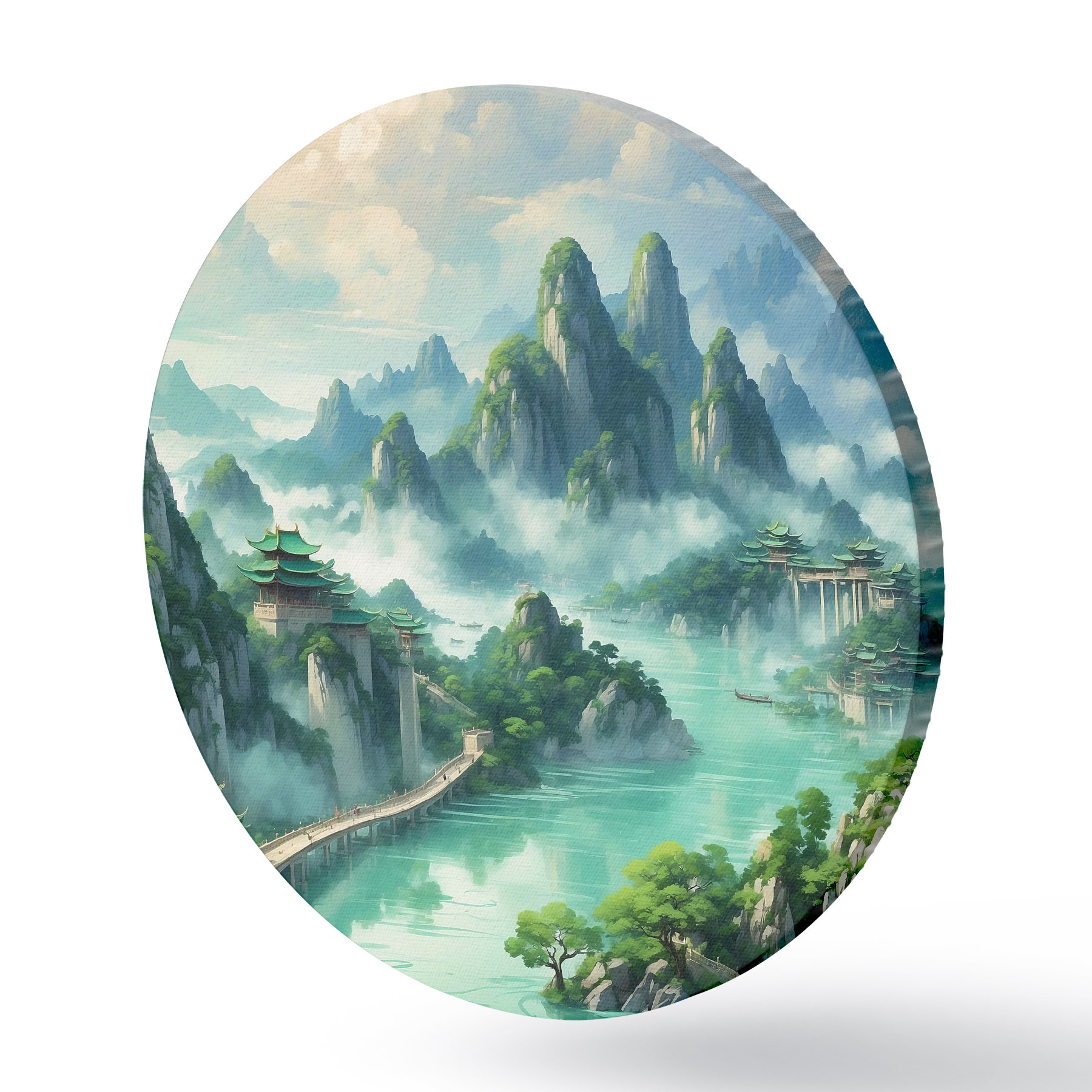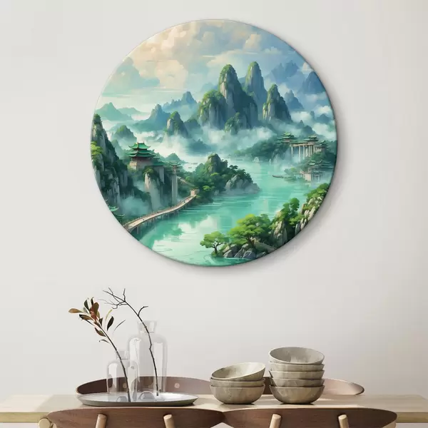 Ronde schilderijen Rivier met brug en gebouwen r38184