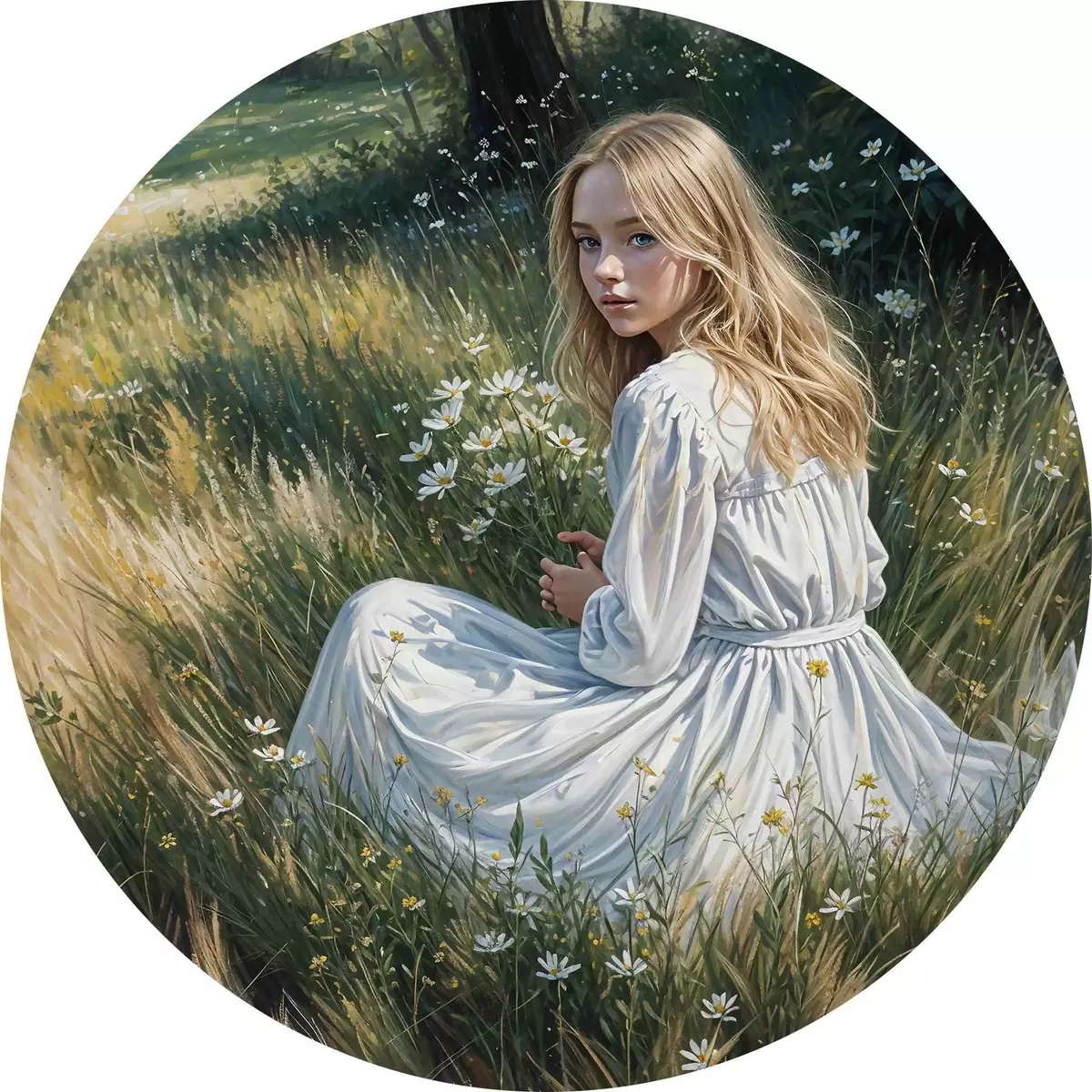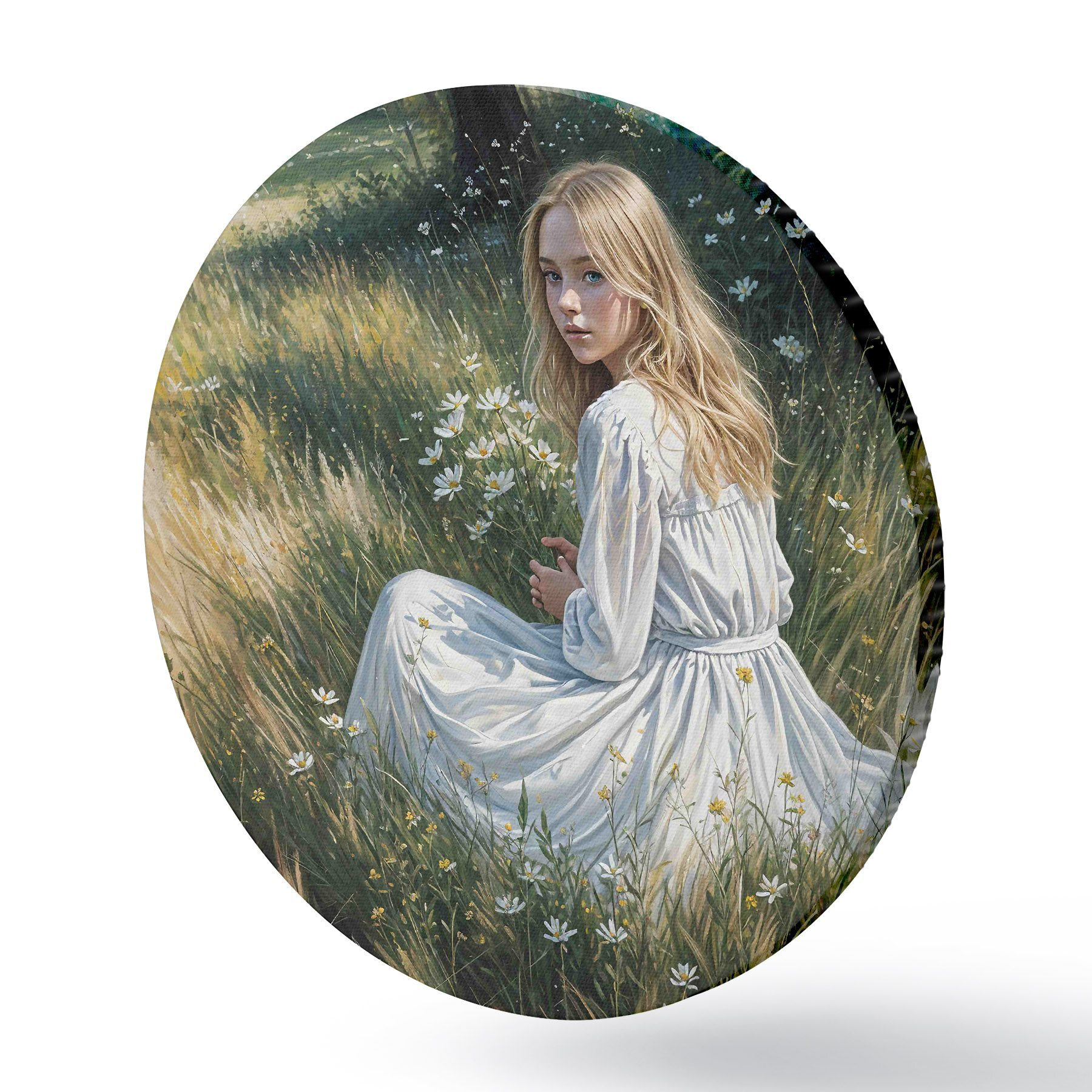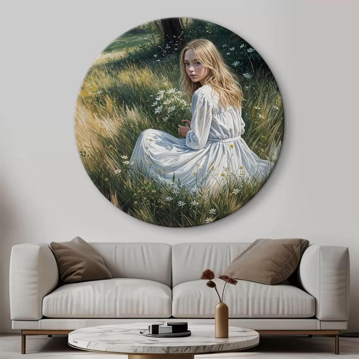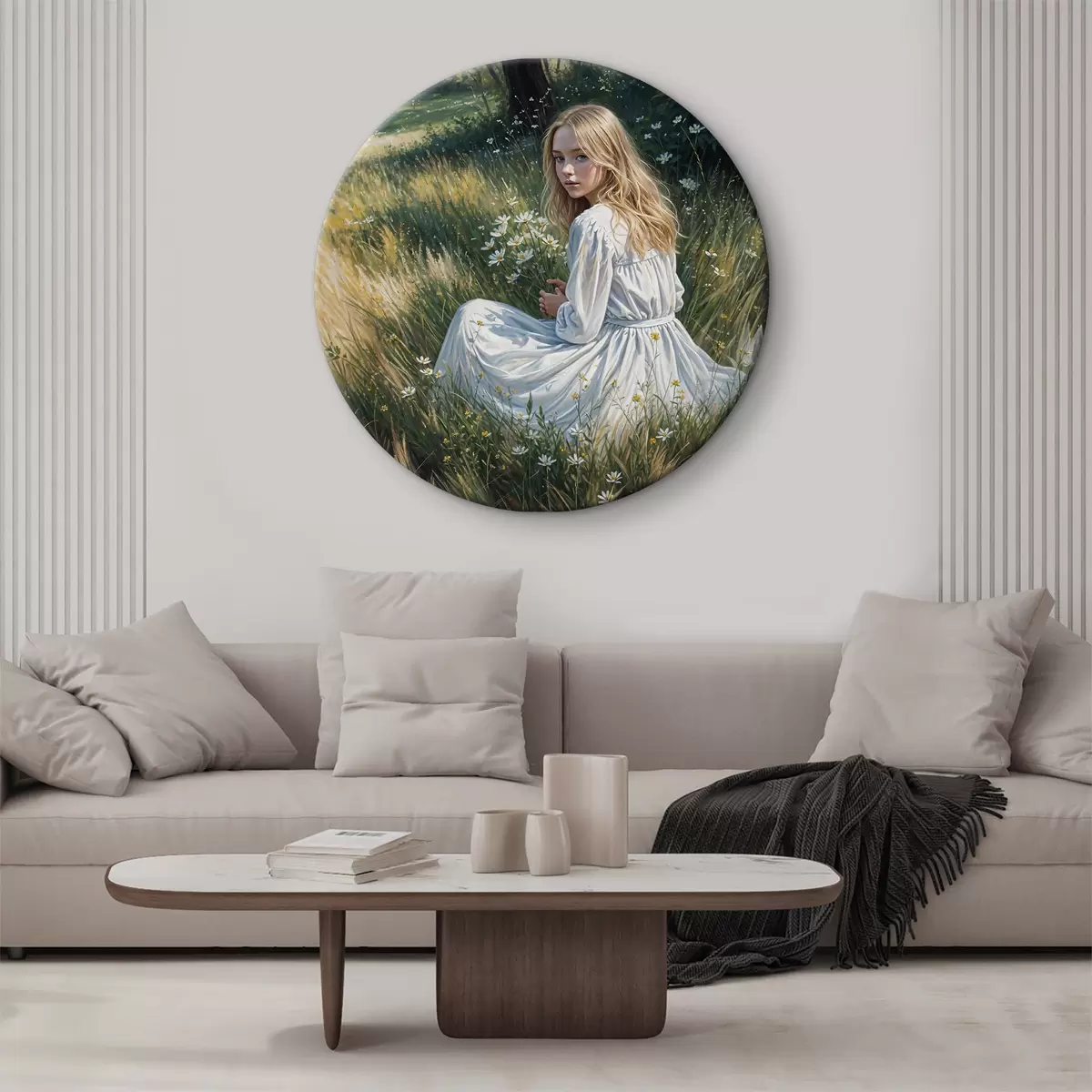 Ronde schilderijen Een meisje in een witte jurk zittend in een bloemenveld r38196