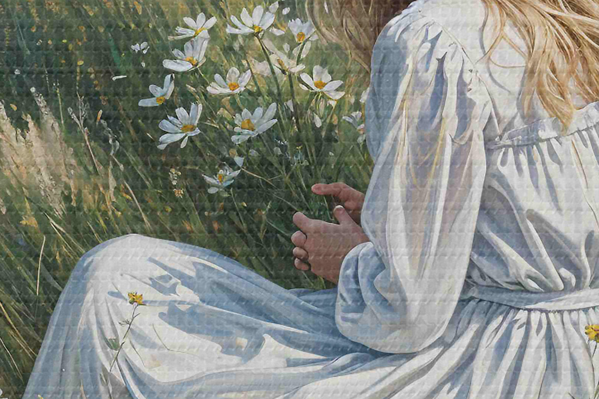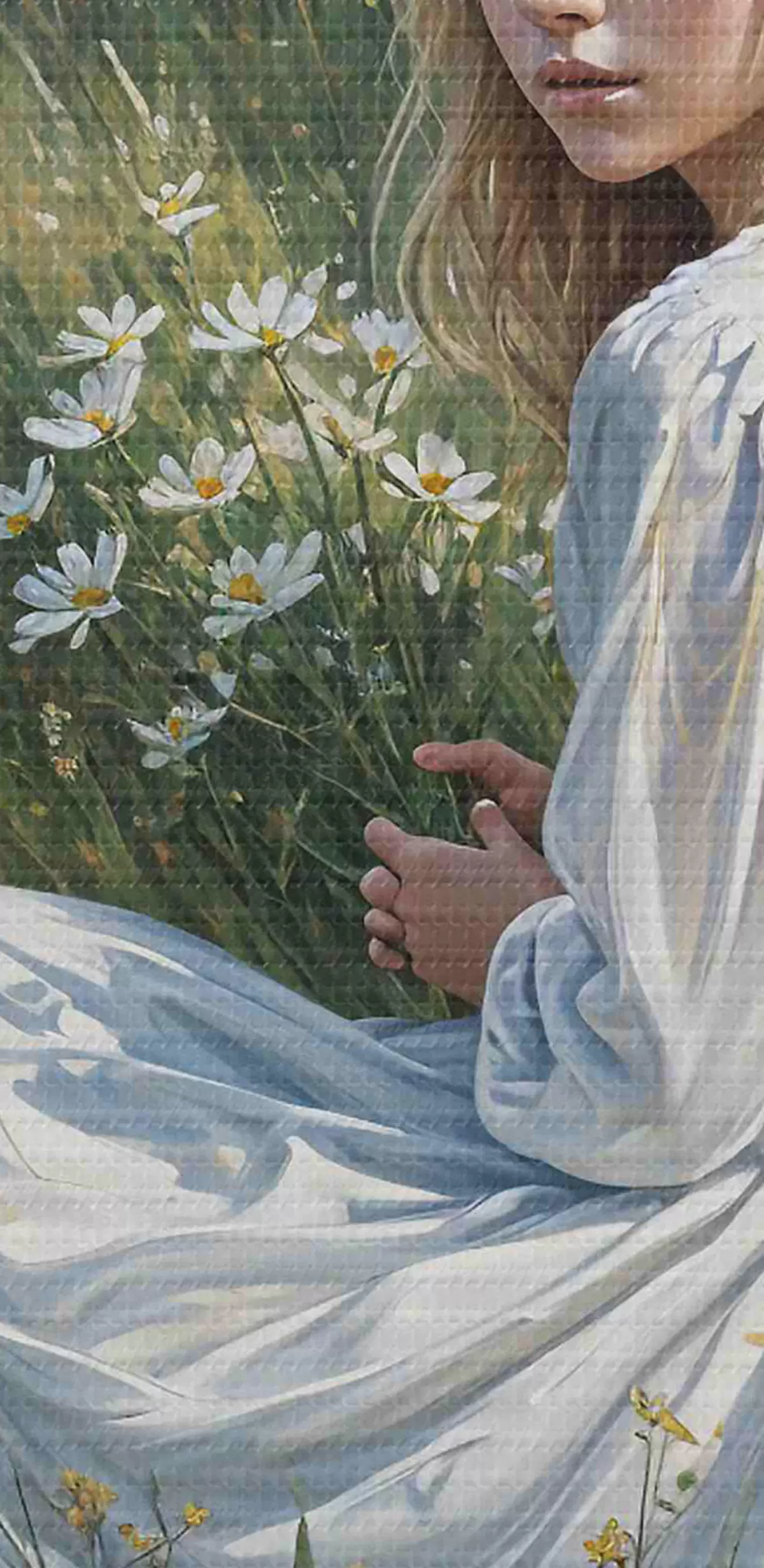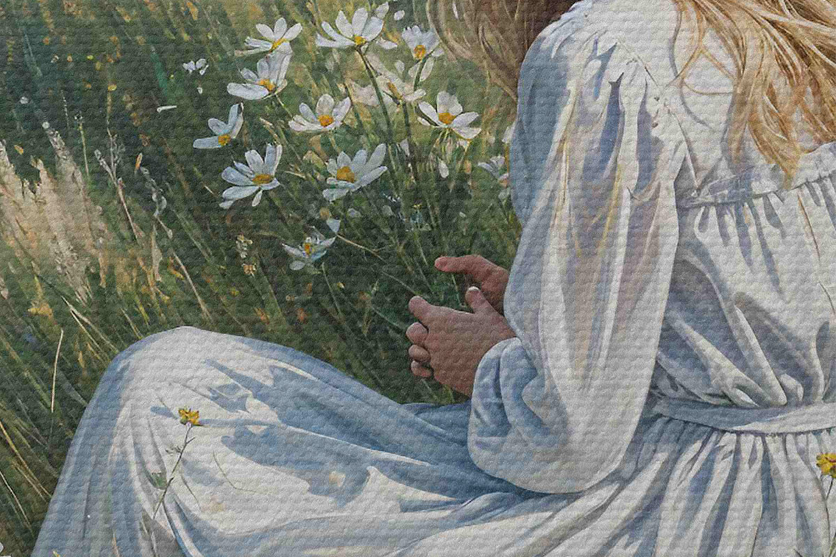Afbeelding Een meisje in een witte jurk zittend in een bloemenveld Nr r38196