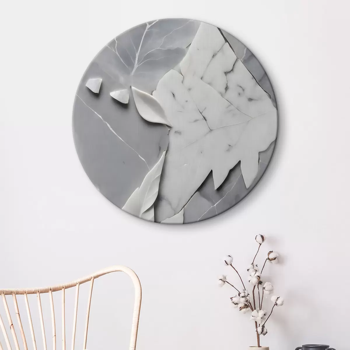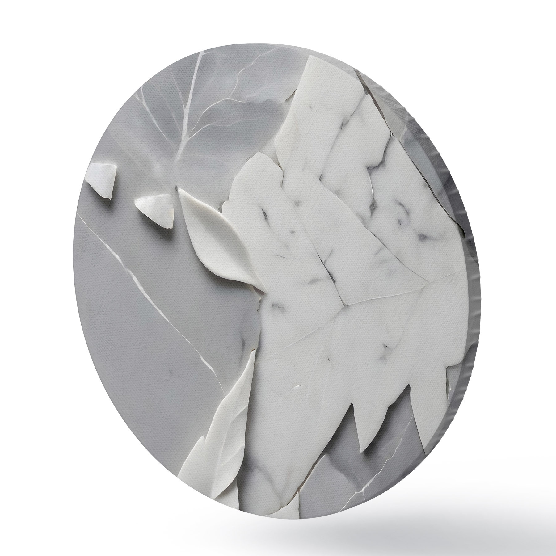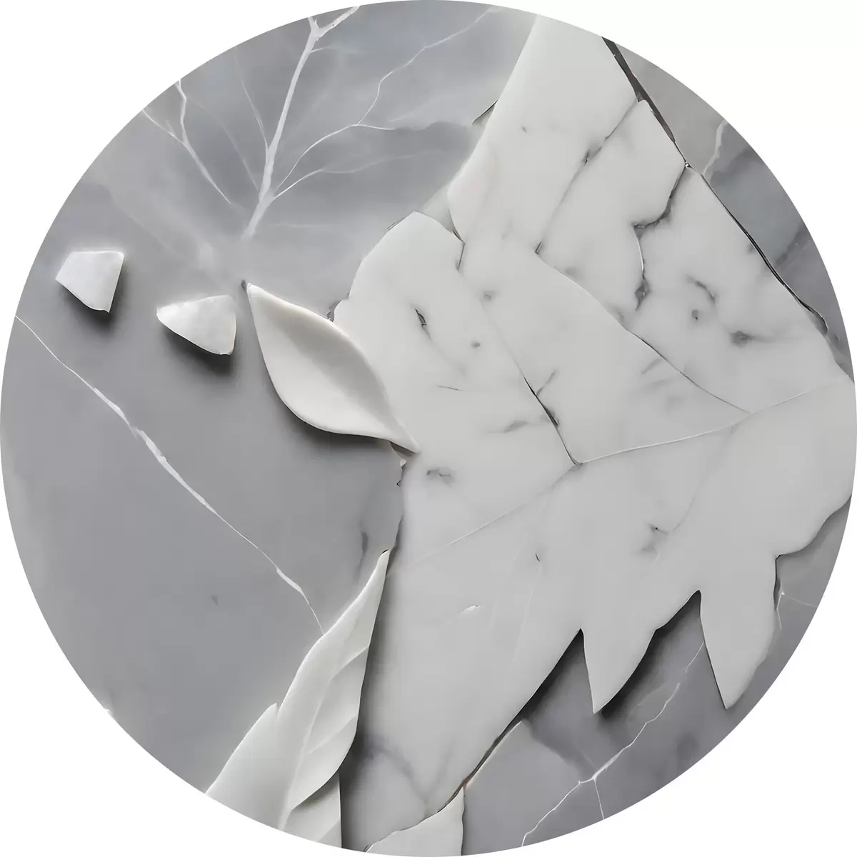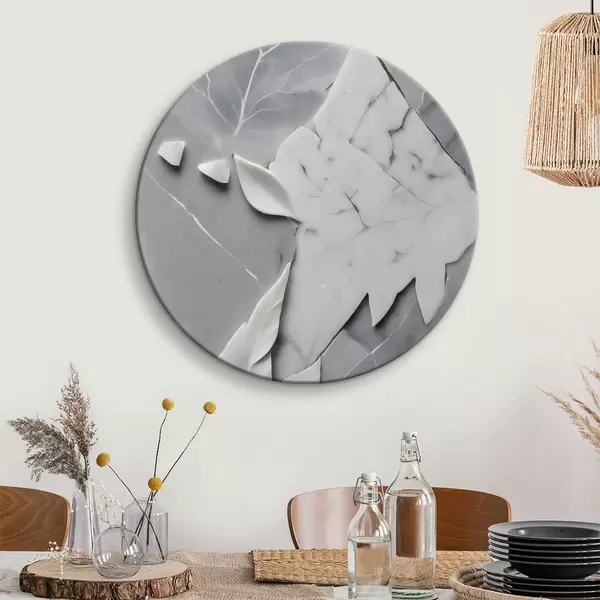 Ronde schilderijen Wit en grijs marmeren oppervlak met bladeren r38272