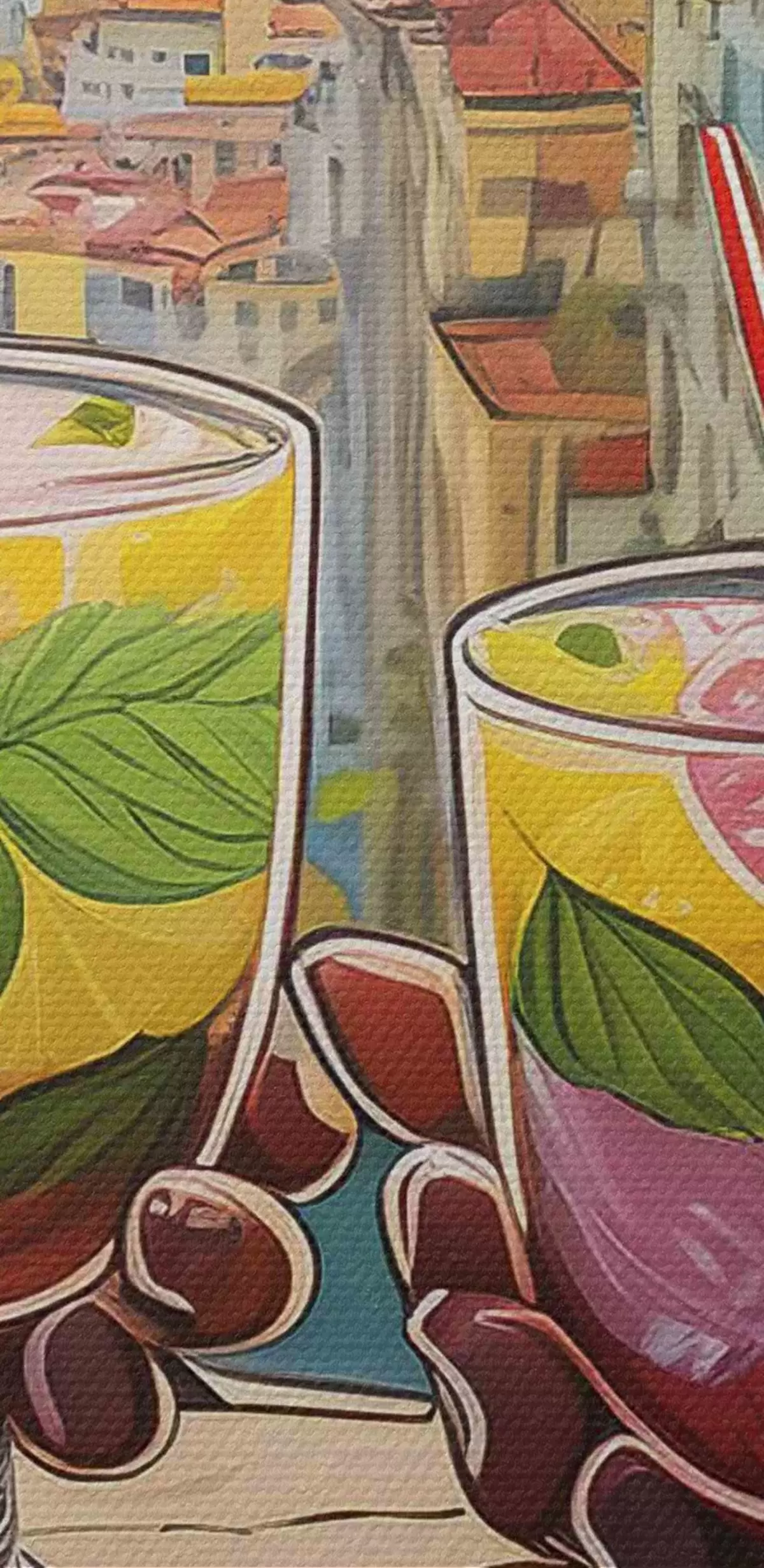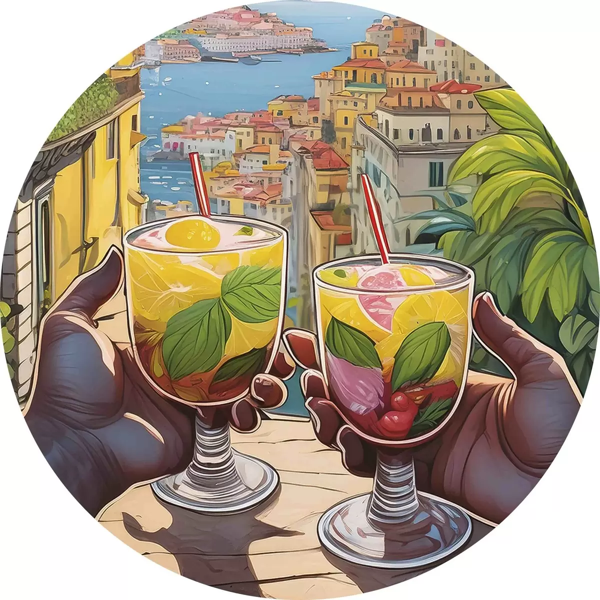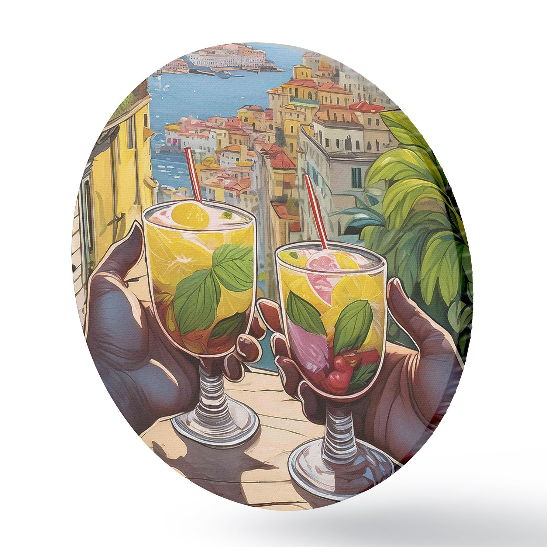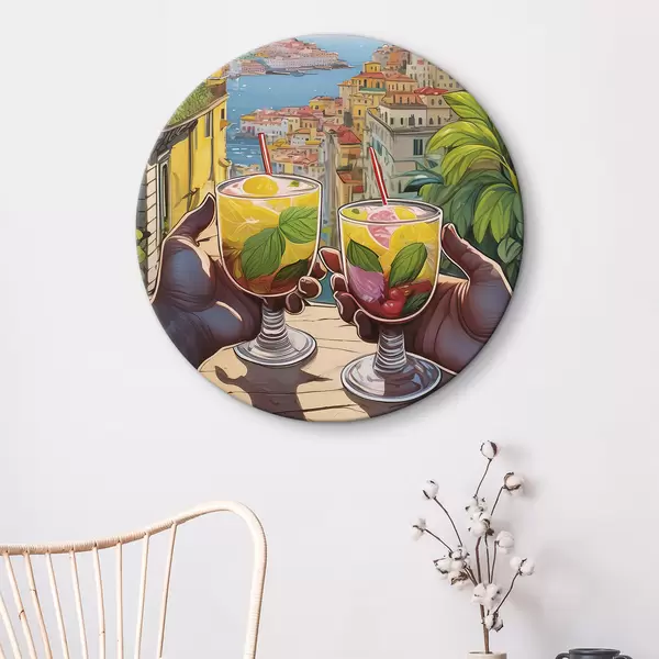 Ronde schilderijen Paar handen houden glazen met vruchten en bladeren vast r38405