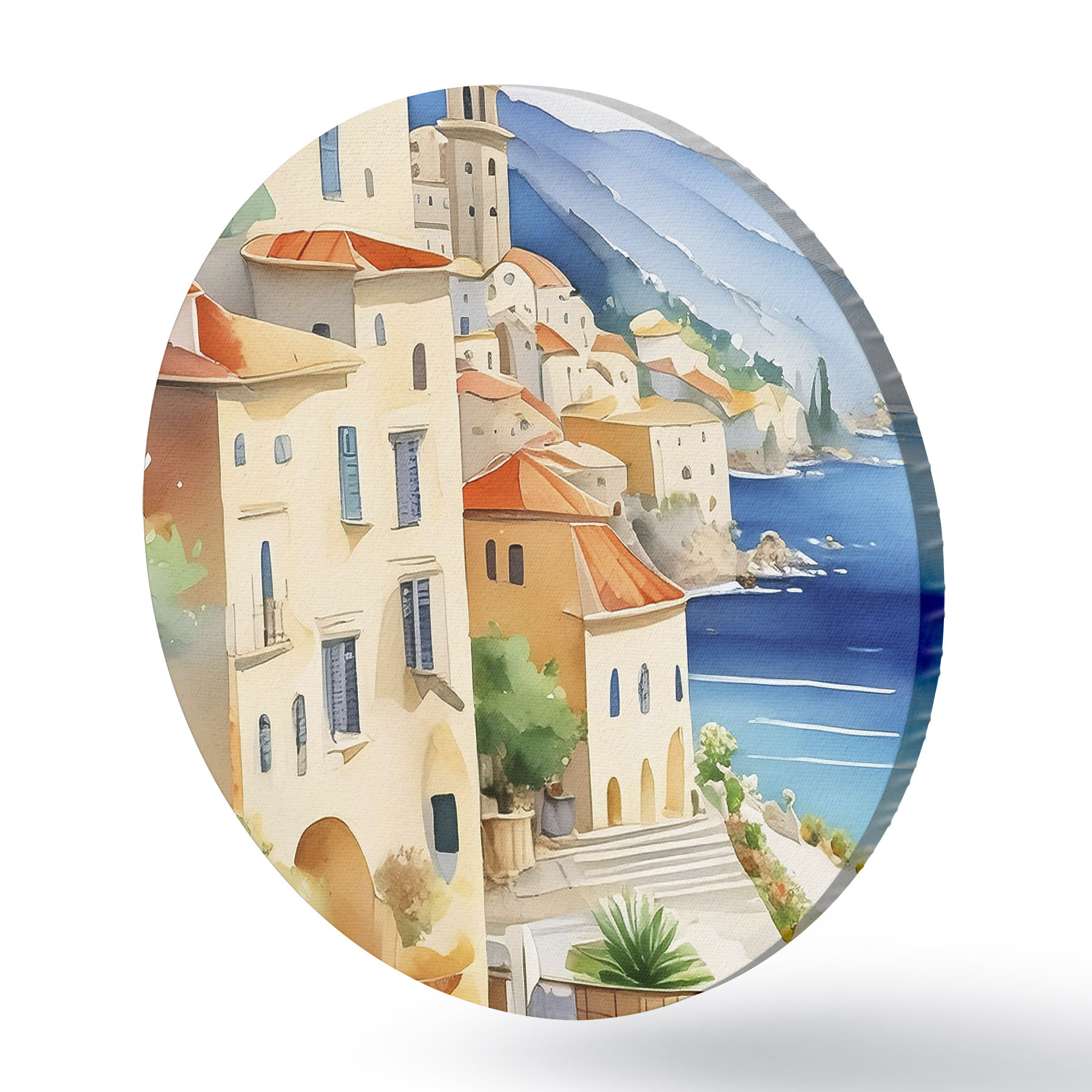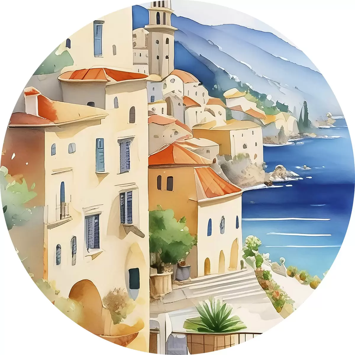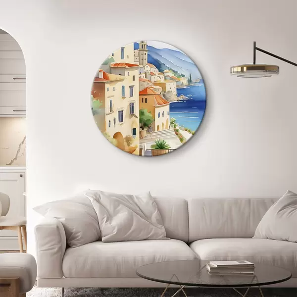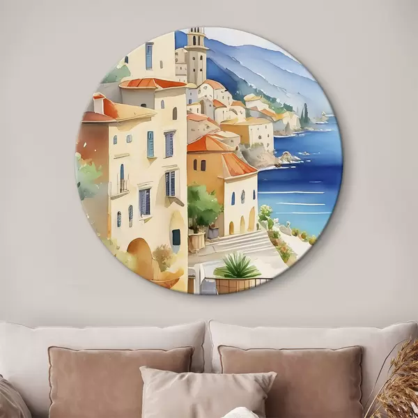 Ronde schilderijen Een aquarel van een stad op een heuvel boven de zee r38409
