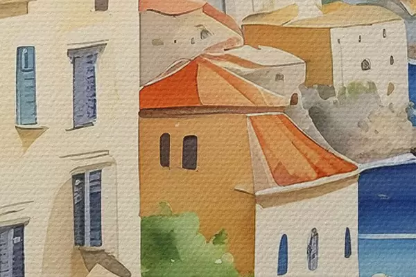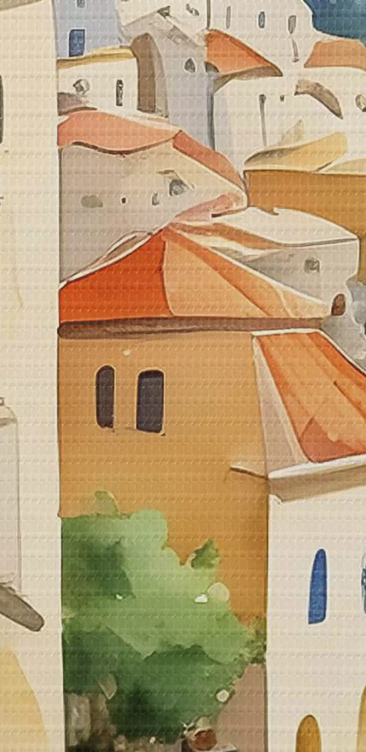 Afbeelding Een aquarel van een stad op een heuvel boven de zee Nr r38409