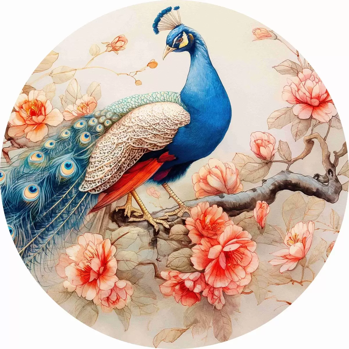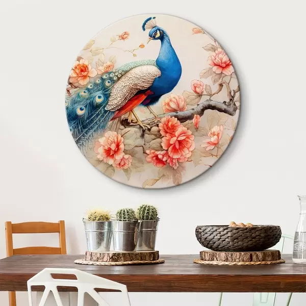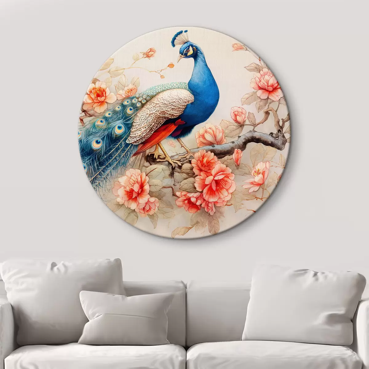 Ronde schilderijen Een schilderij van een pauw op een tak met bloemen r38451