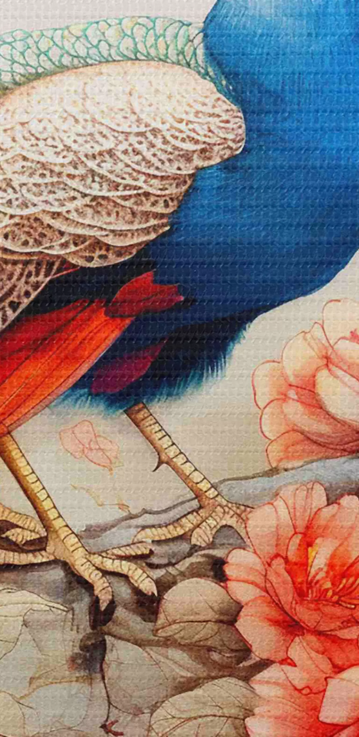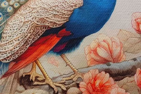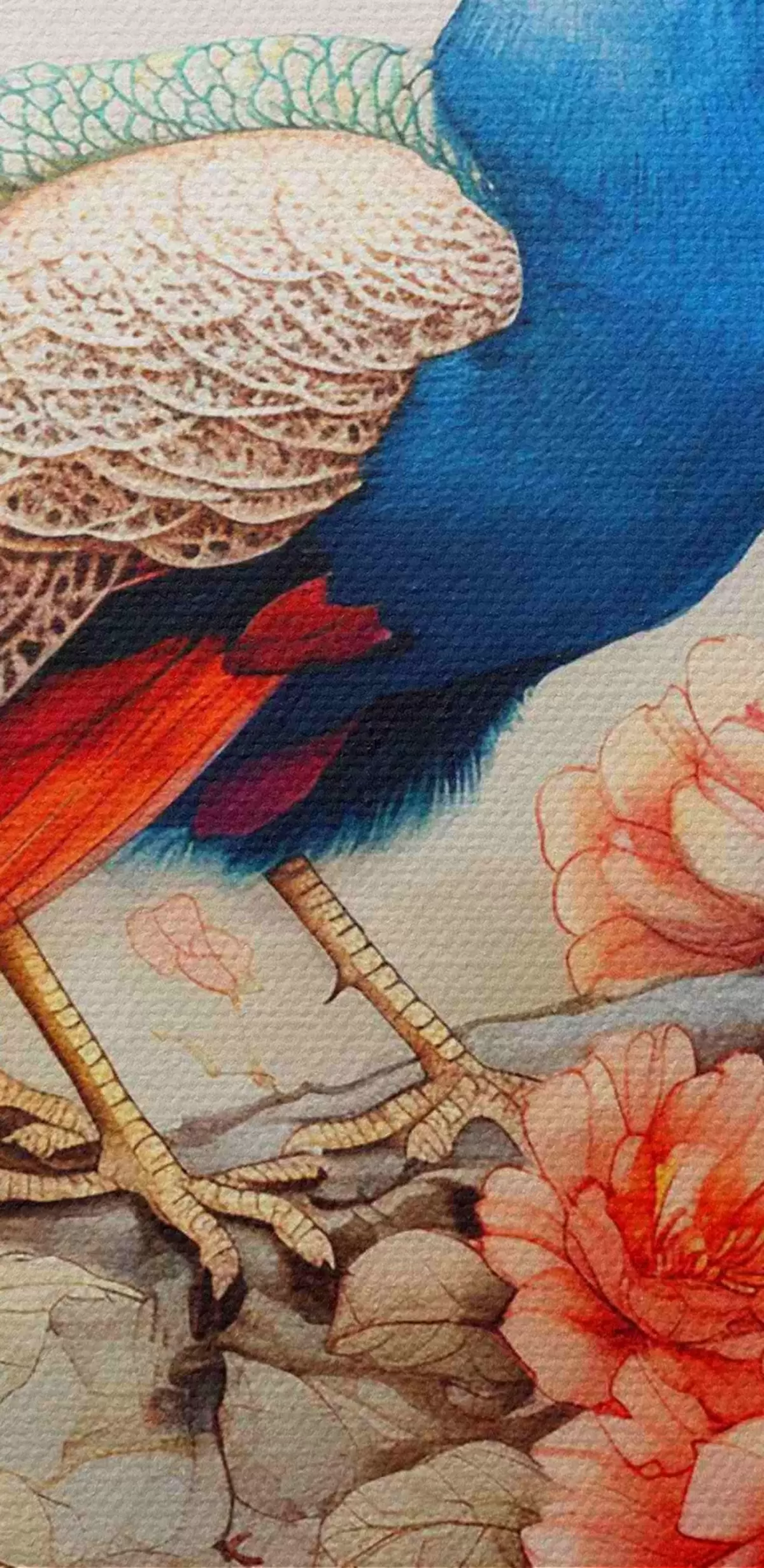 Afbeelding Een schilderij van een pauw op een tak met bloemen Nr r38451