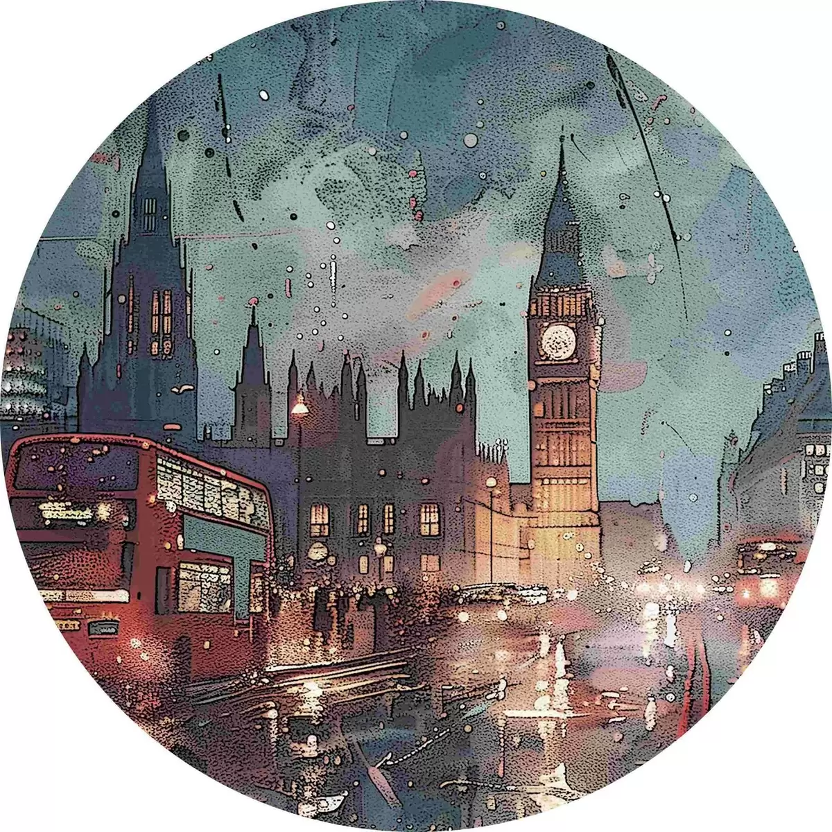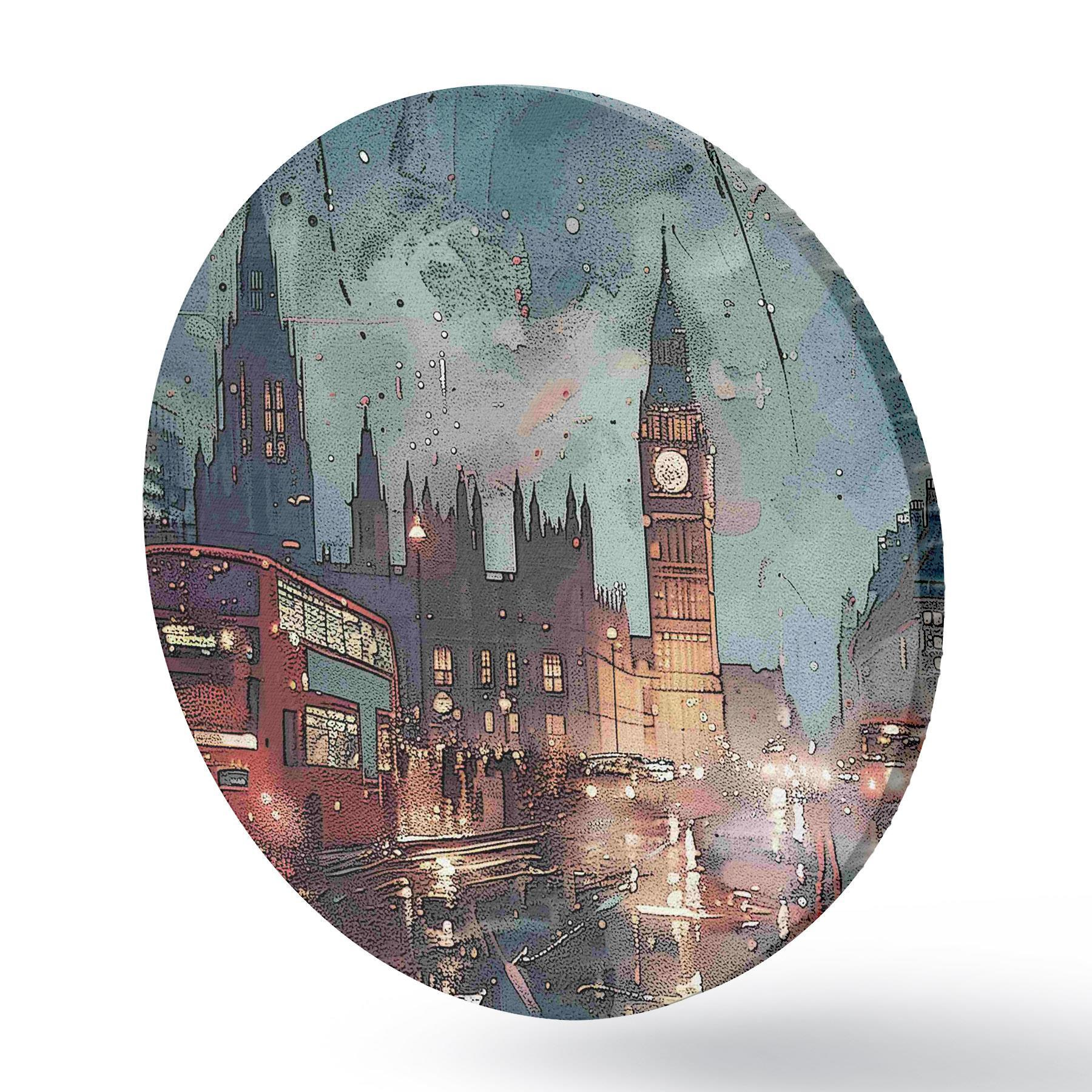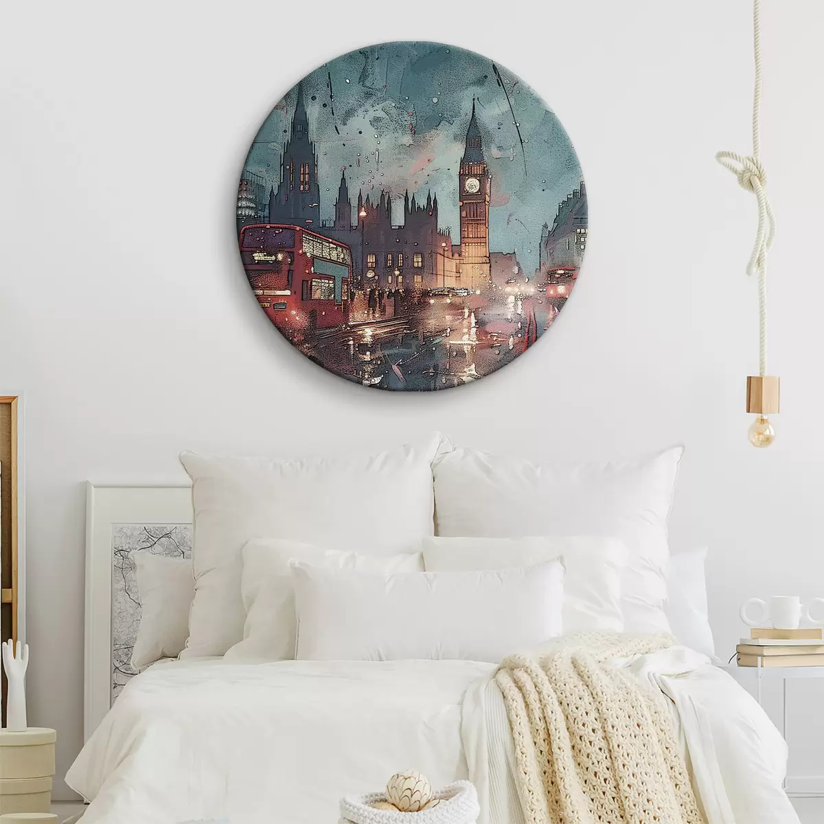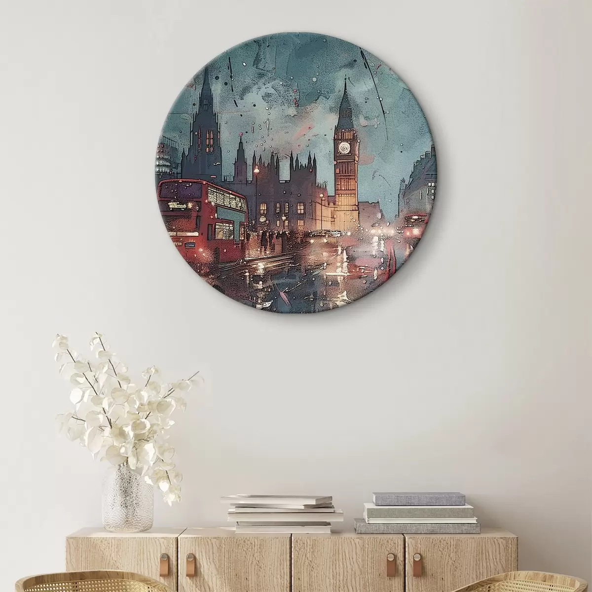Ronde schilderijen Stadsstraat met klokkentoren r38472