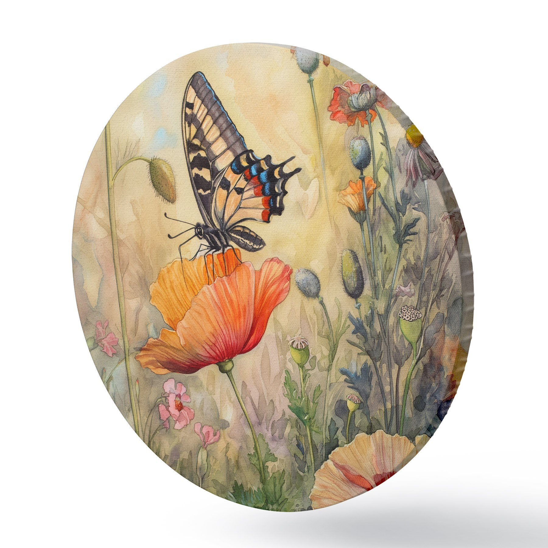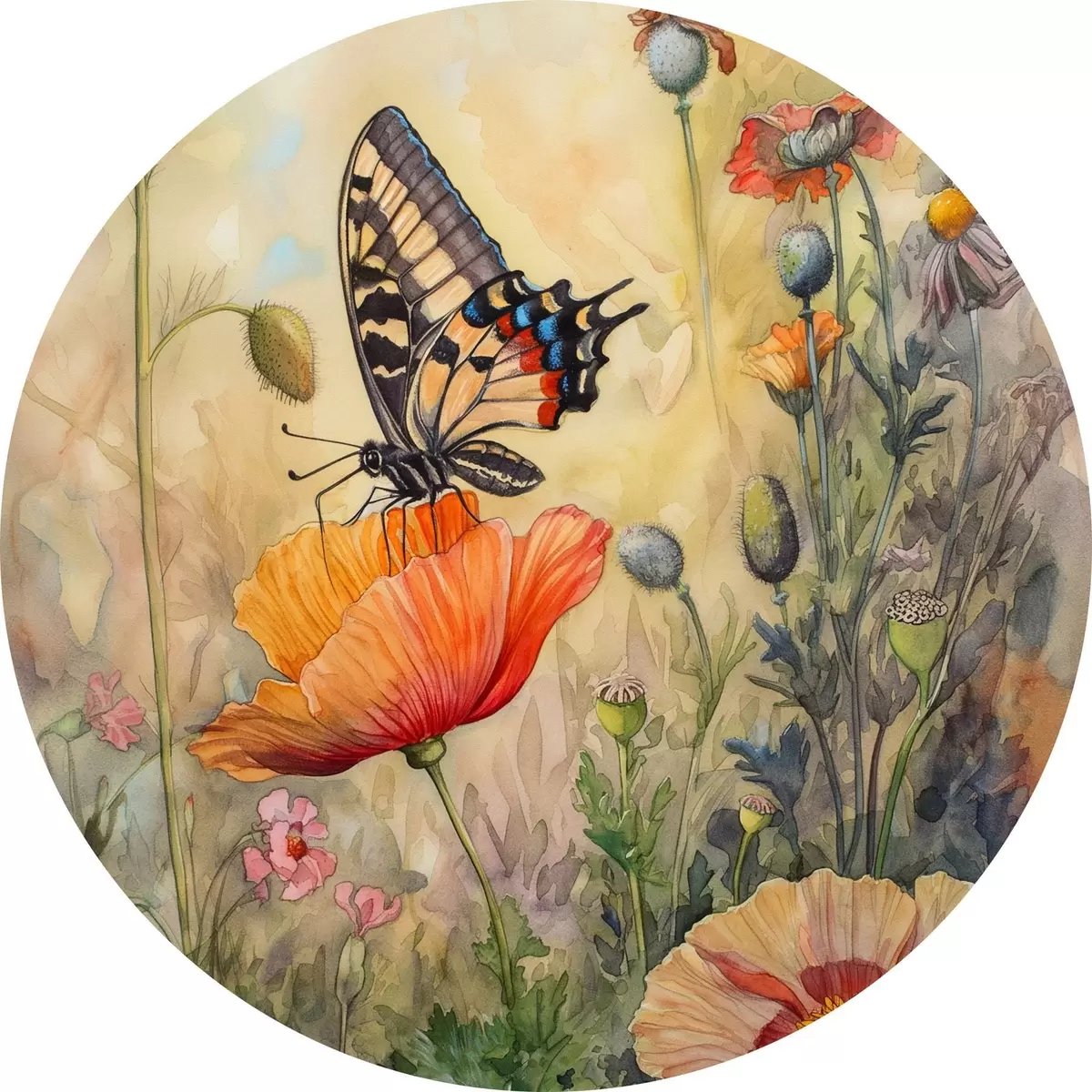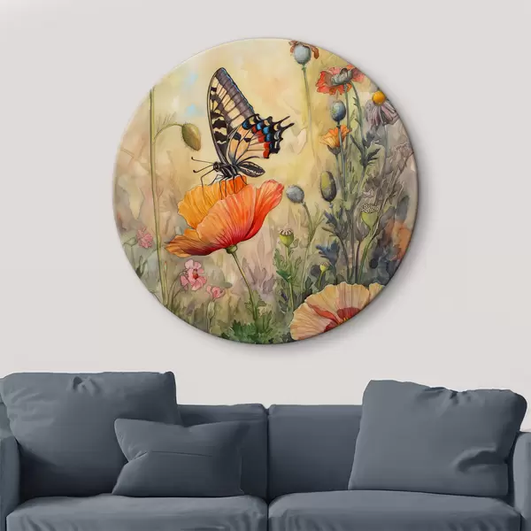 Ronde schilderijen Veld van klaprozen en vlinder r38520