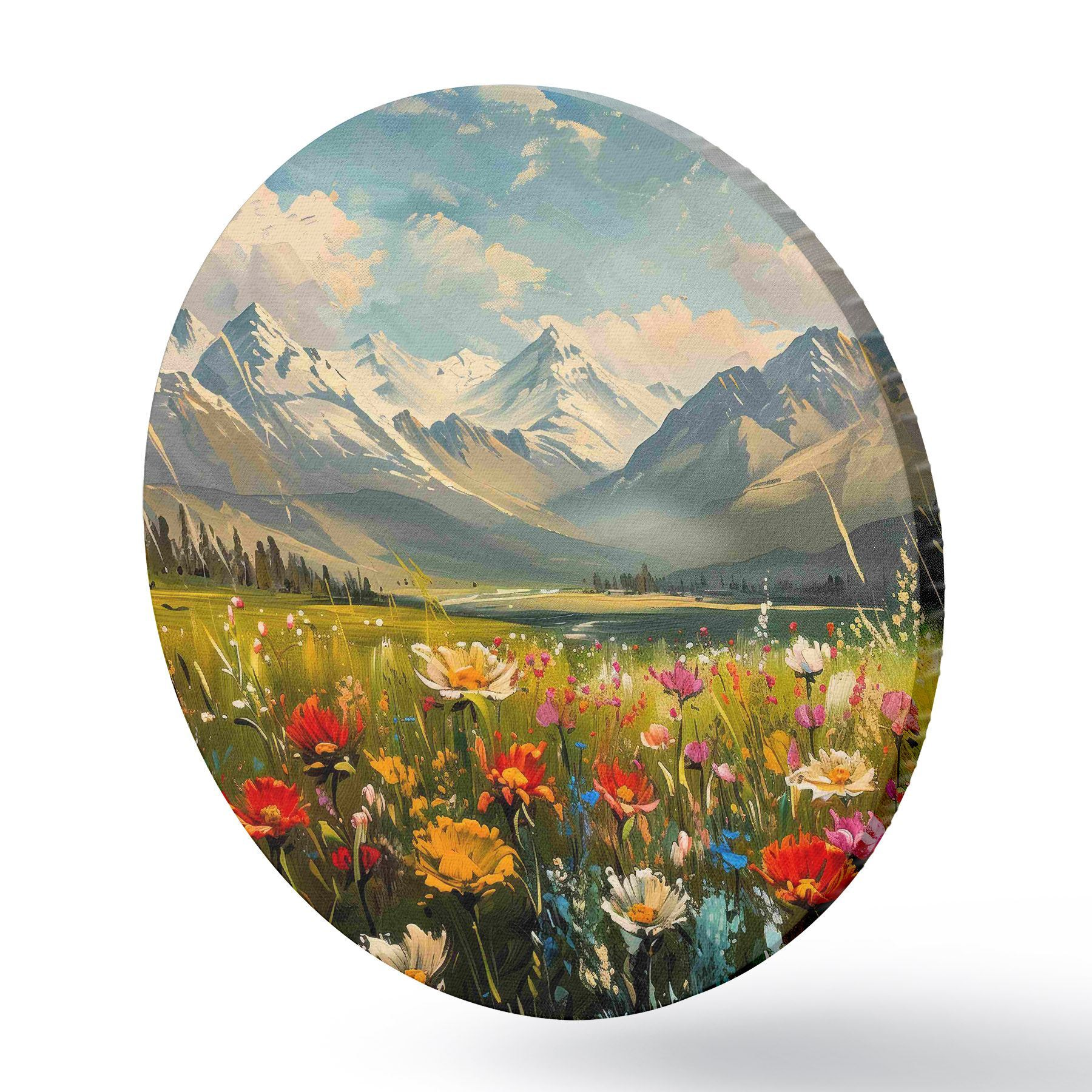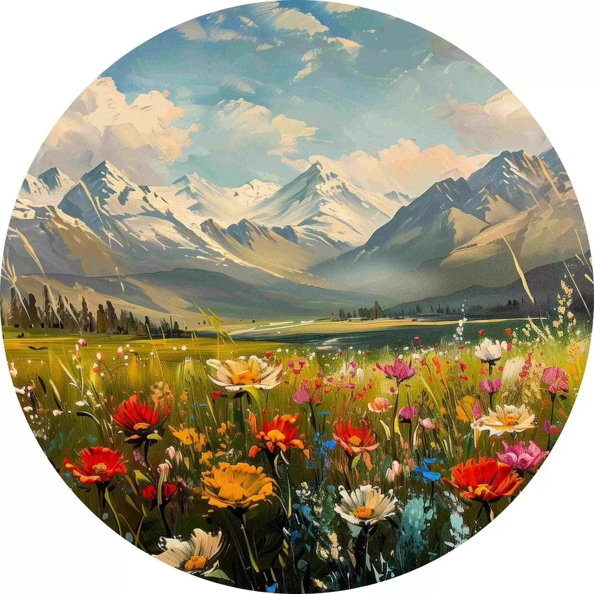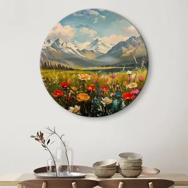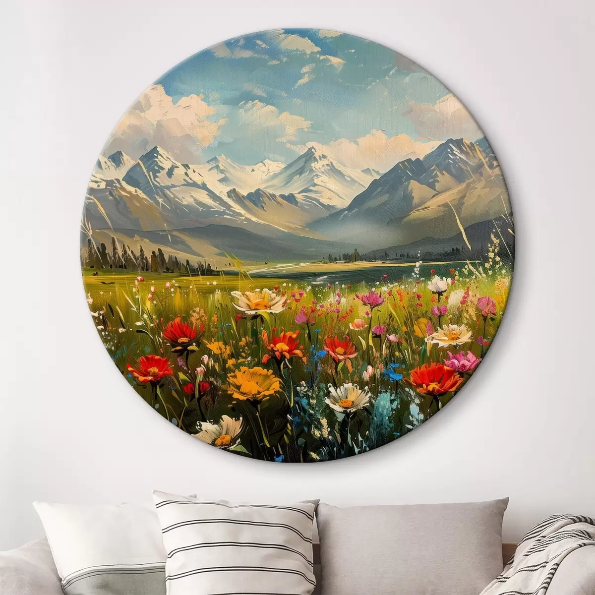 Ronde schilderijen Bloeiende weiden onder besneeuwde bergtoppen r38573
