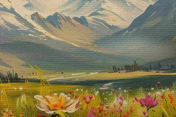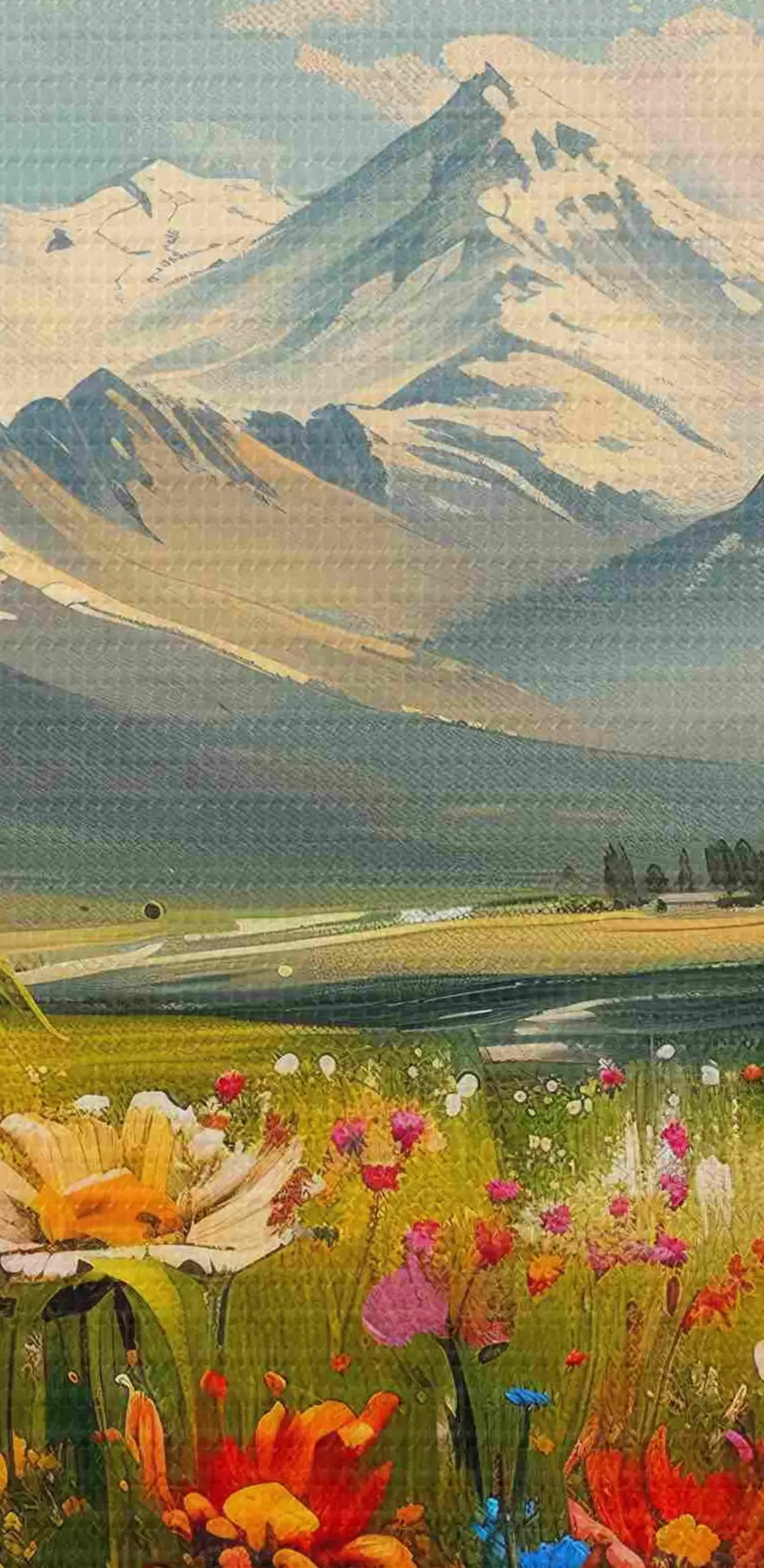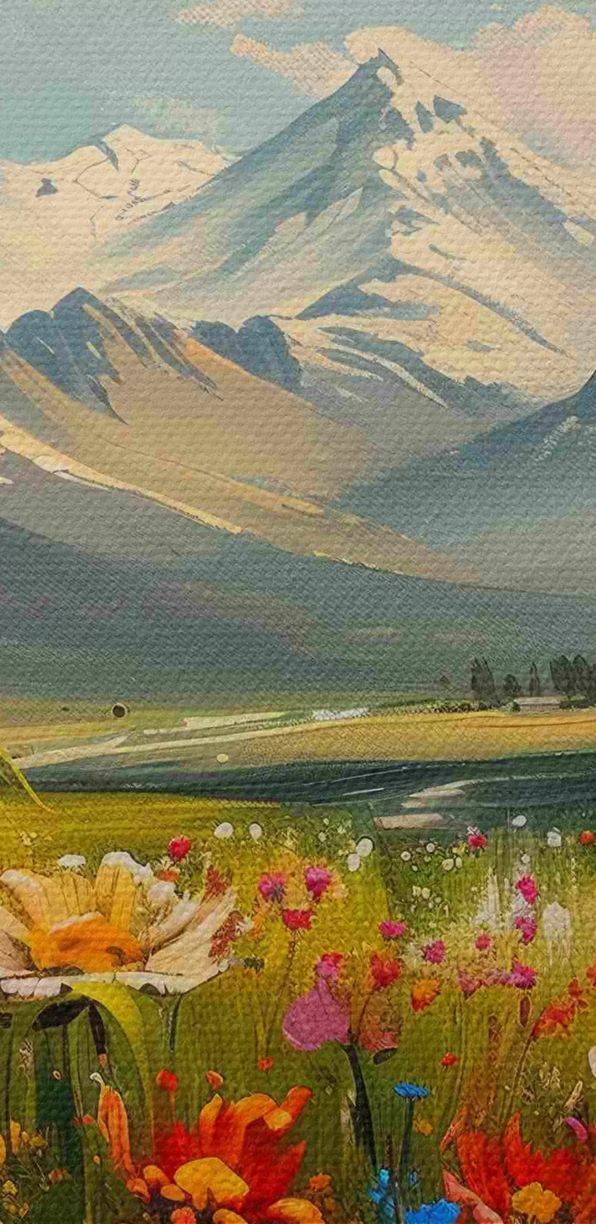 Afbeelding Bloeiende weiden onder besneeuwde bergtoppen Nr r38573