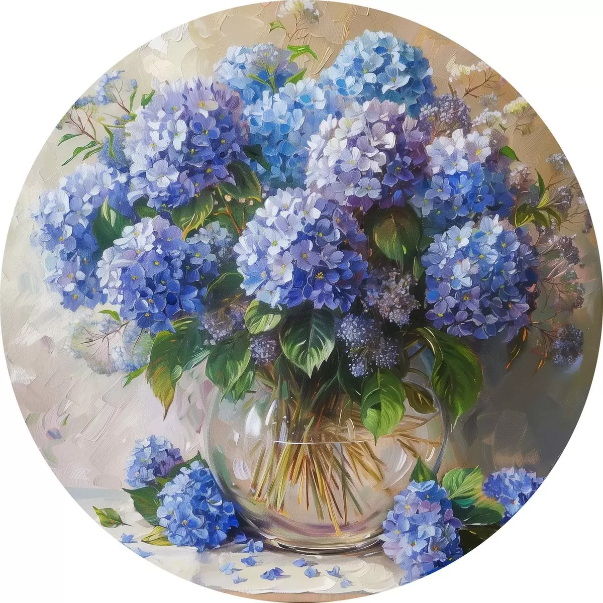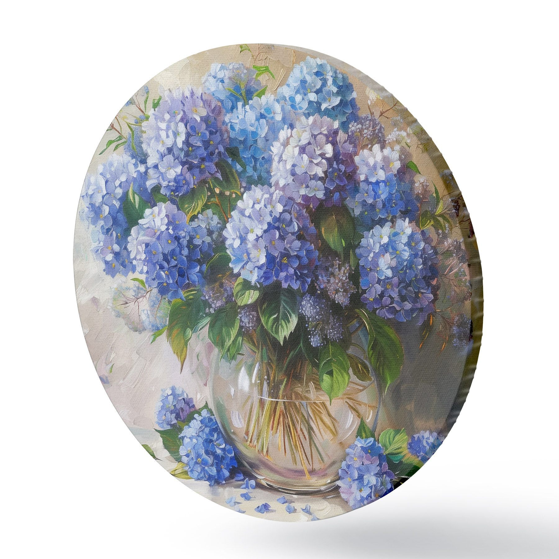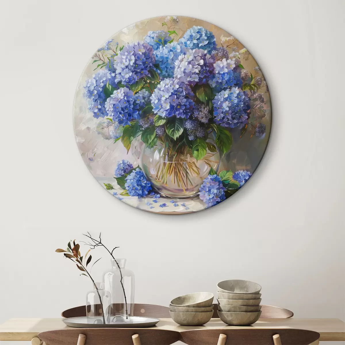 Ronde schilderijen Blauwe hortensia's op tafel r38709