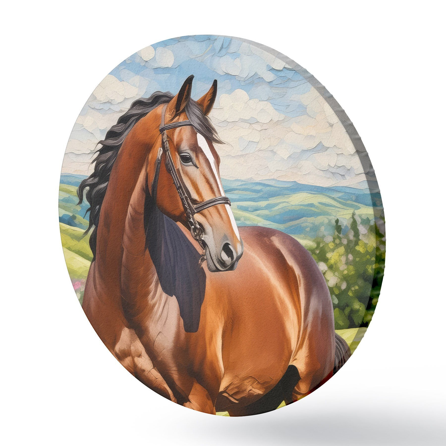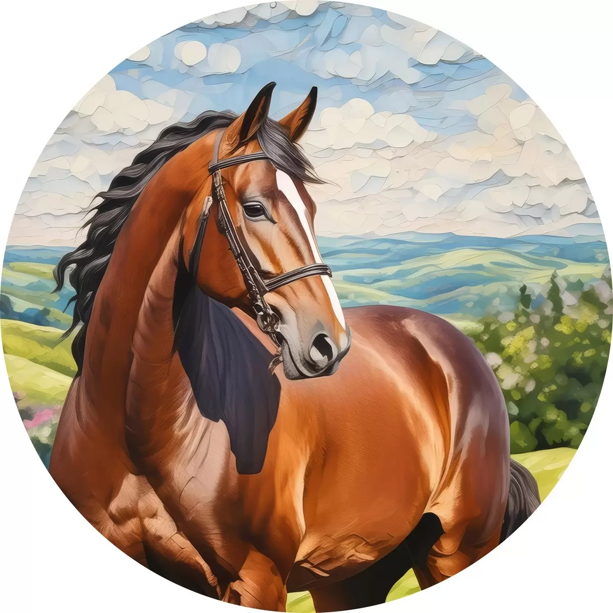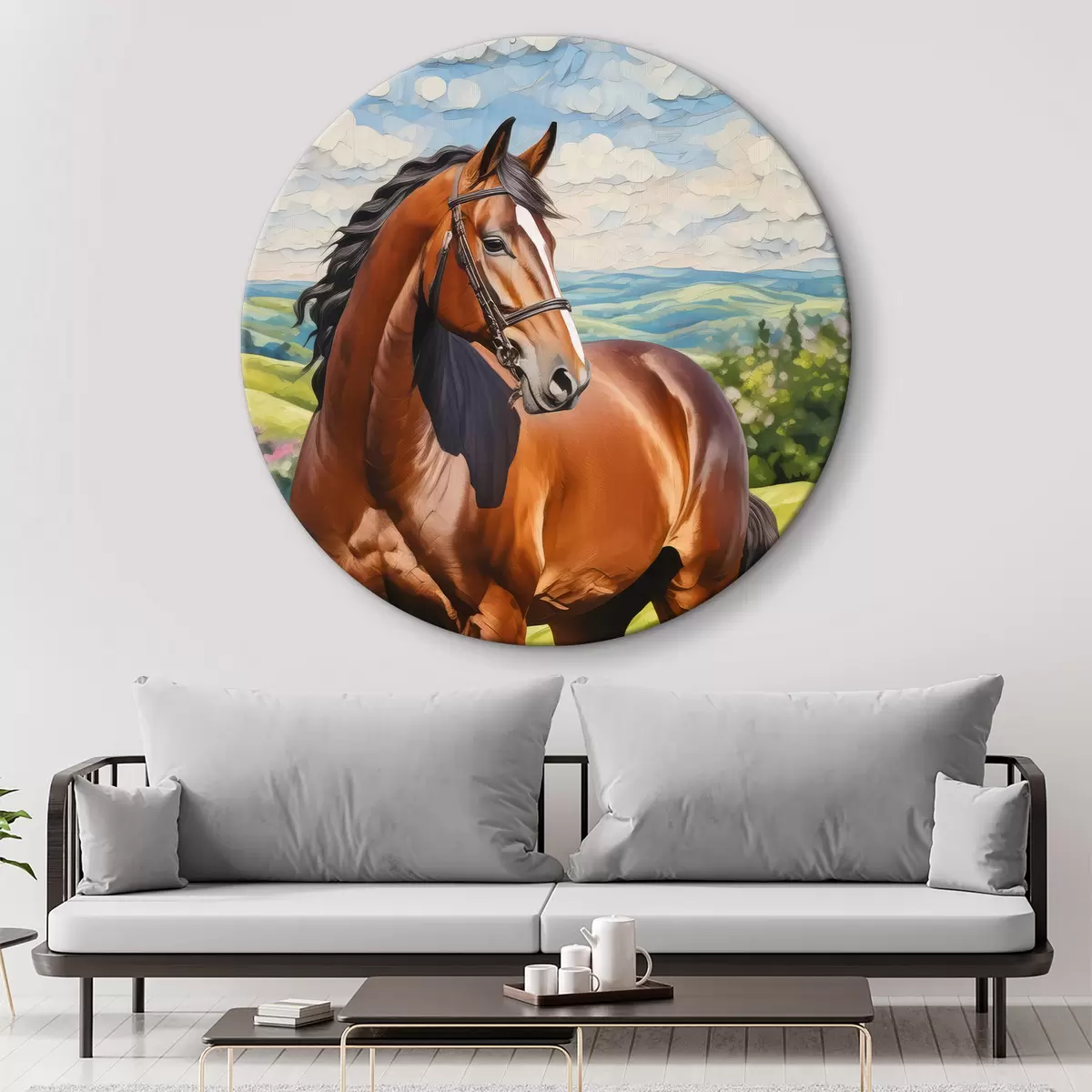Ronde schilderijen Mooi paard op het gazon, blauwe lucht r38727