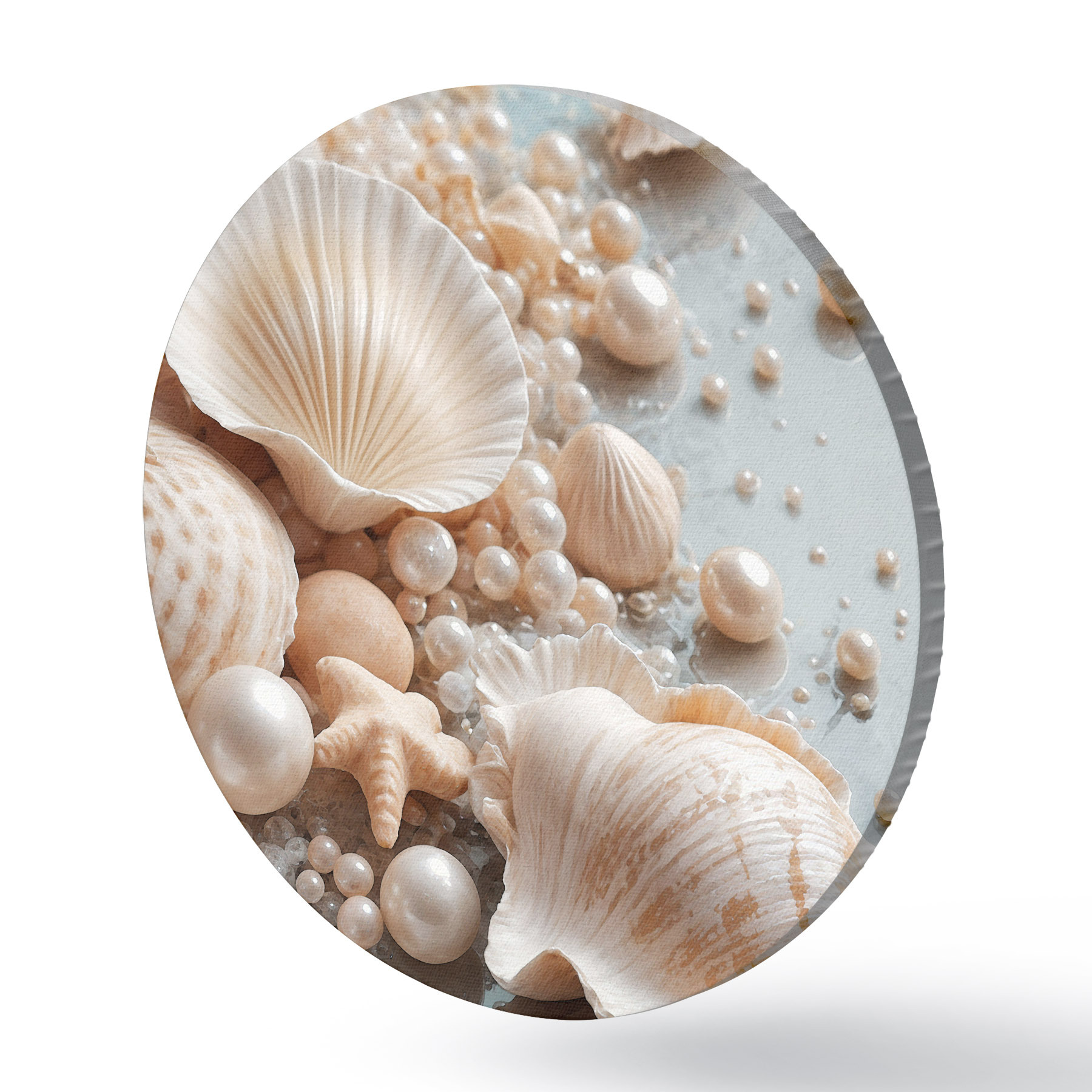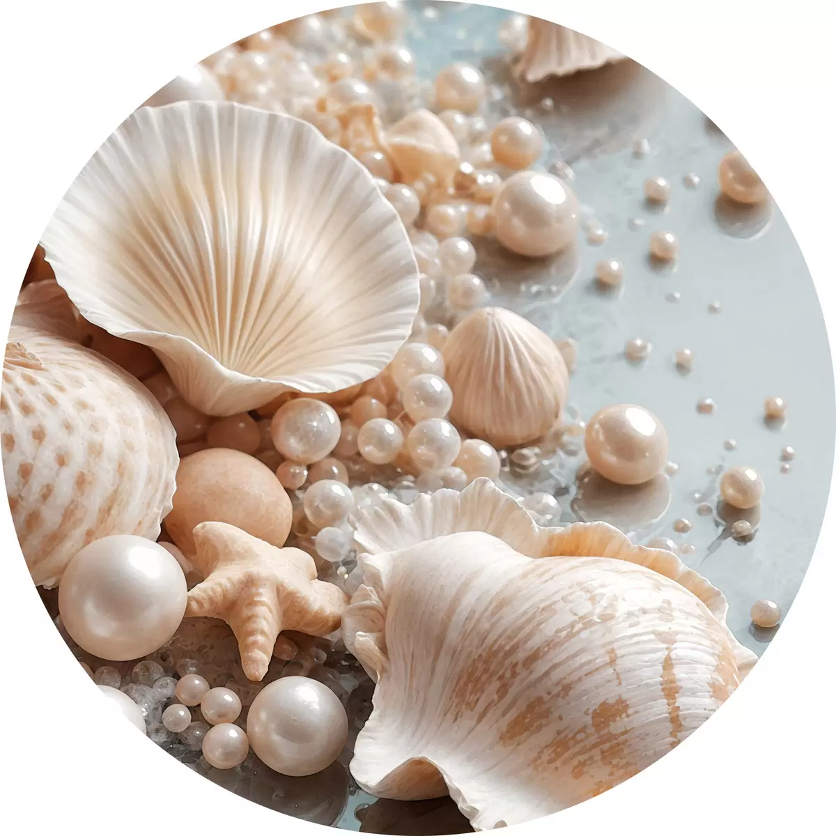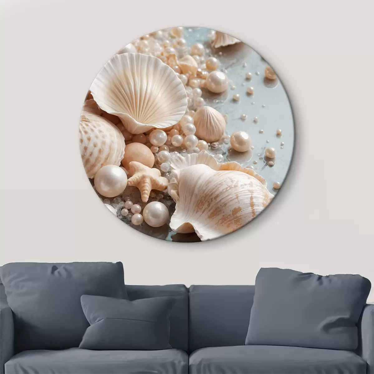 Ronde schilderijen Geassorteerde schelpen en parels op een lichtblauwe achtergrond r38769