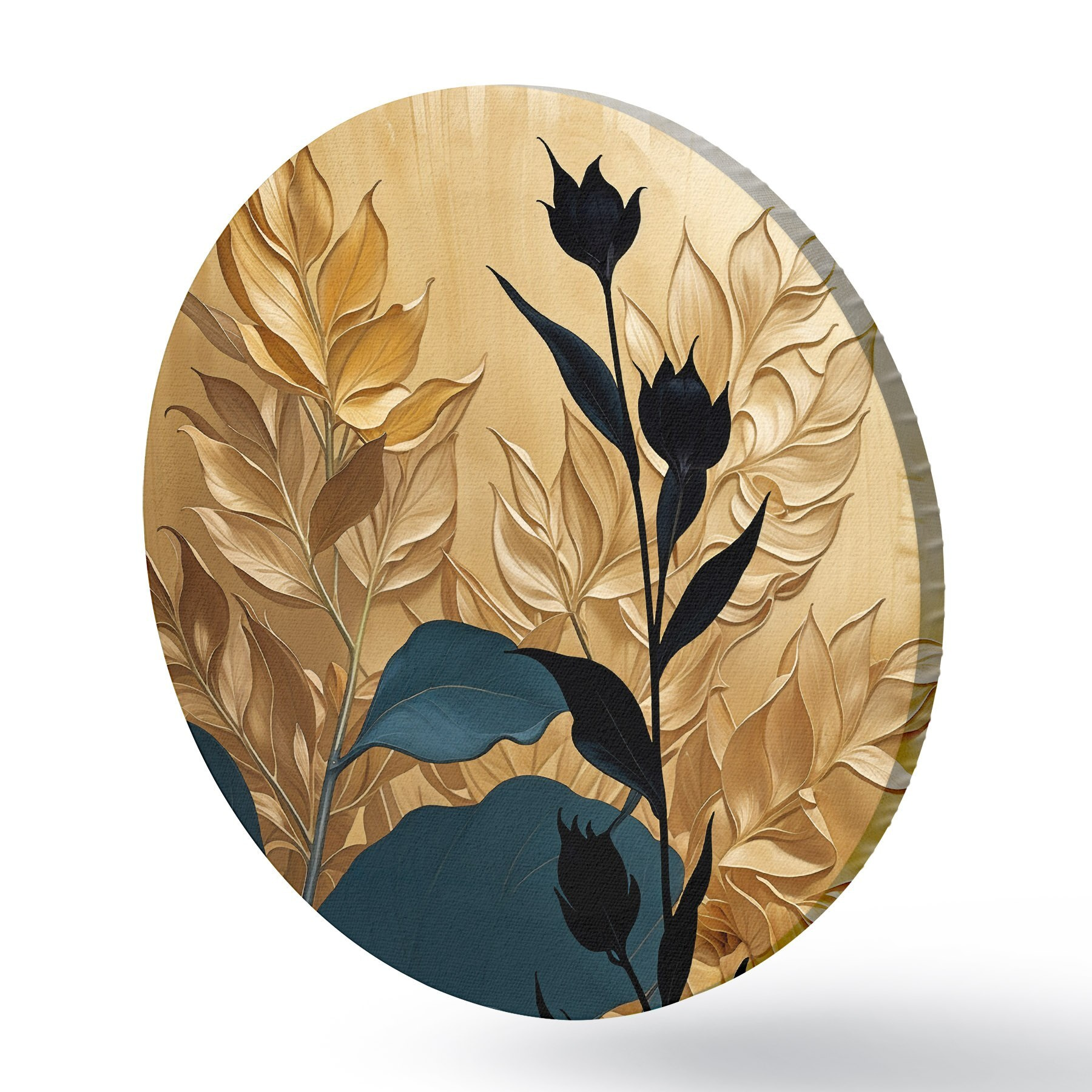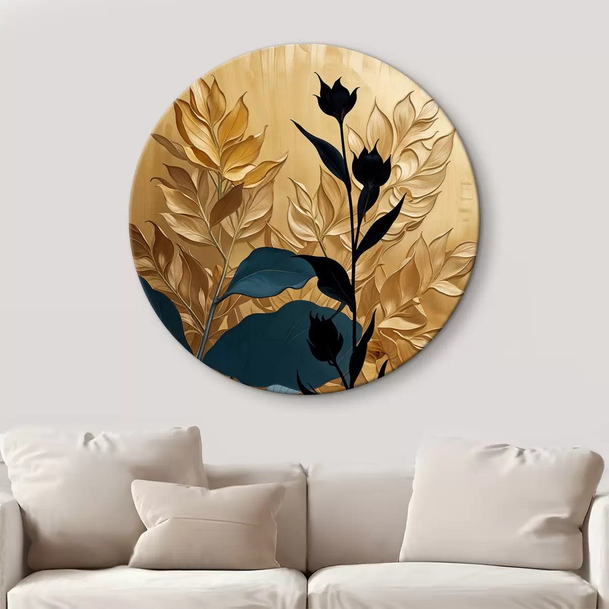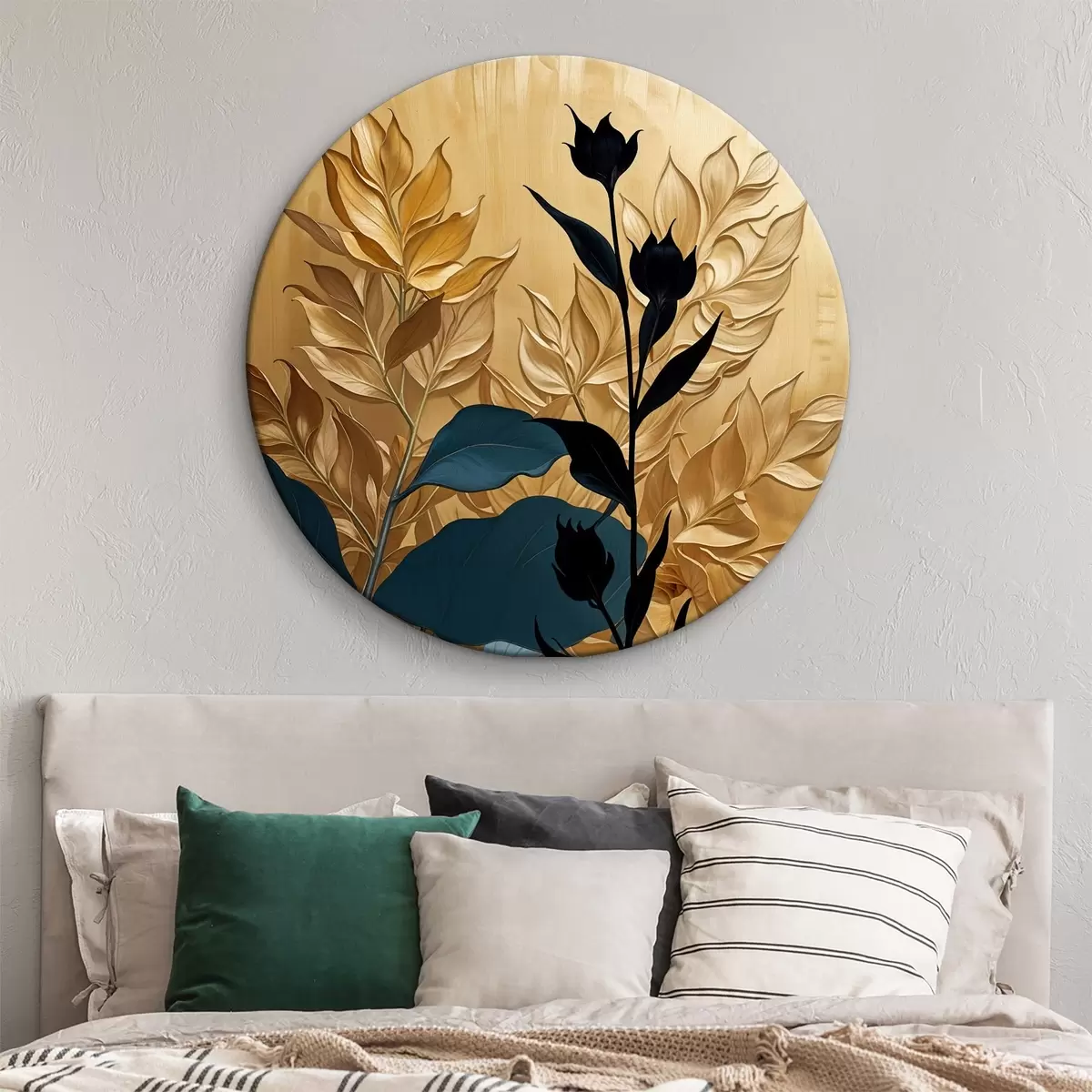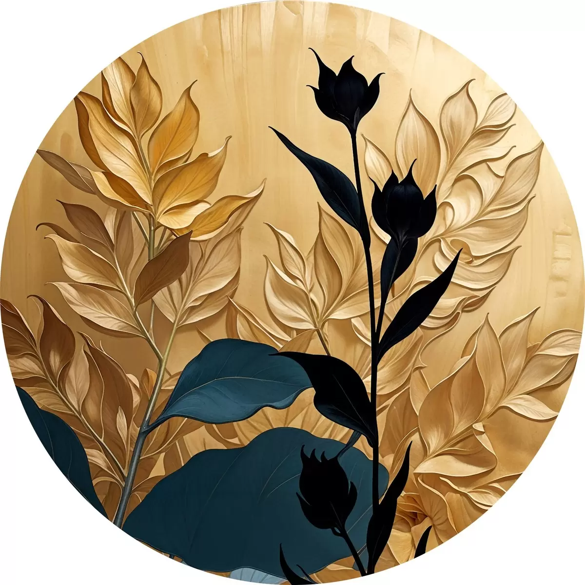Ronde schilderijen Abstracte bloemencompositie met grote bladeren en donkere silhouetten r38822